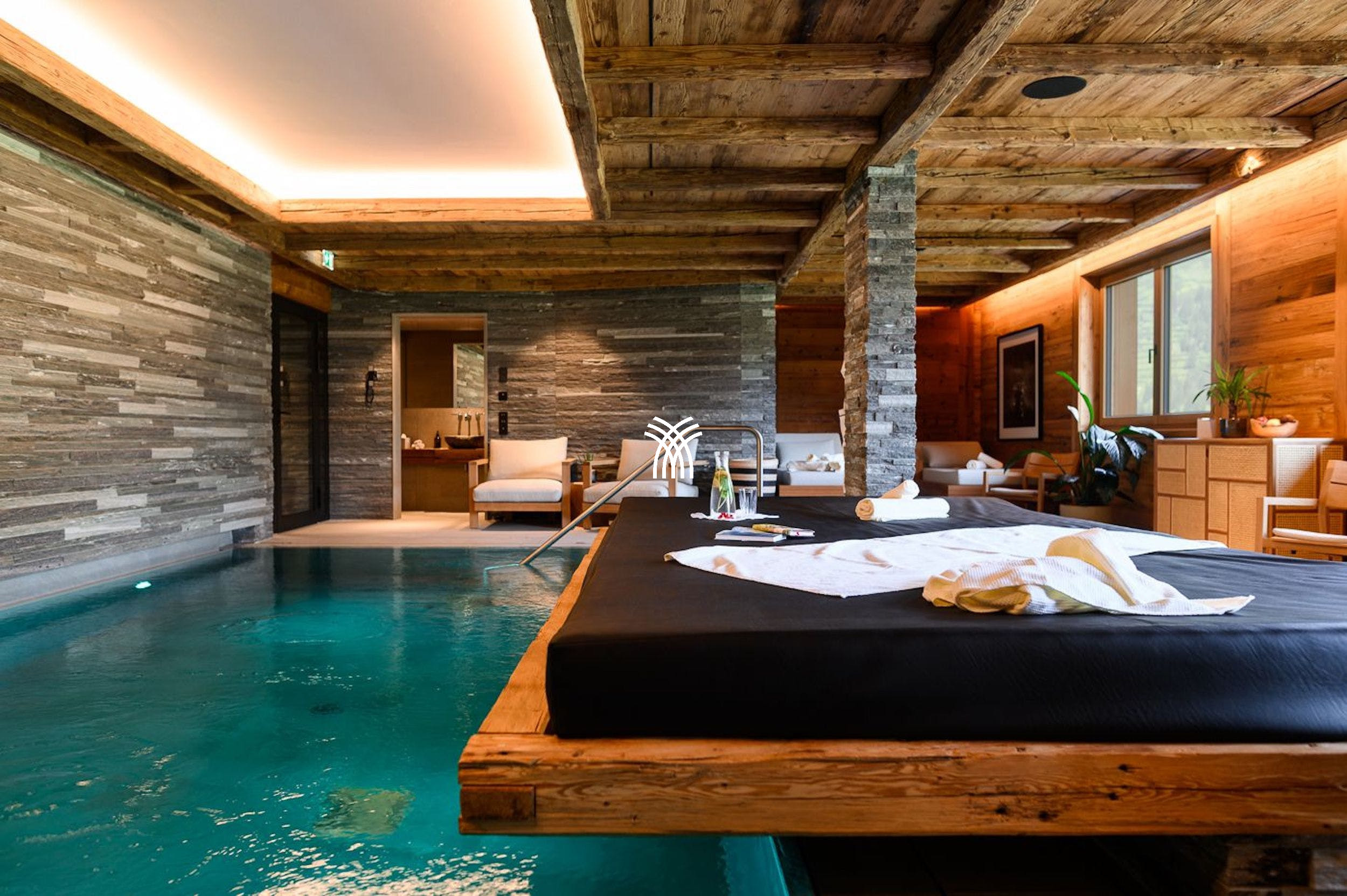 Les chambres du chalet incarnent l'élégance alpine sereine avec des murs en bois pâle, des draps impeccables et une atmosphère apaisante pour des nuits reposantes. Un point fort pour les passionnés de ski est la possibilité de glisser directement sur la piste depuis la propriété, mais le véritable point central réside dans les installations de spa et de bien-être. La piscine intérieure, les lits de jour moelleux, le cabanon à infrarouge, le bar de vitalité et la salle de traitement privée offrent le parfait antidote à une journée dans la neige.