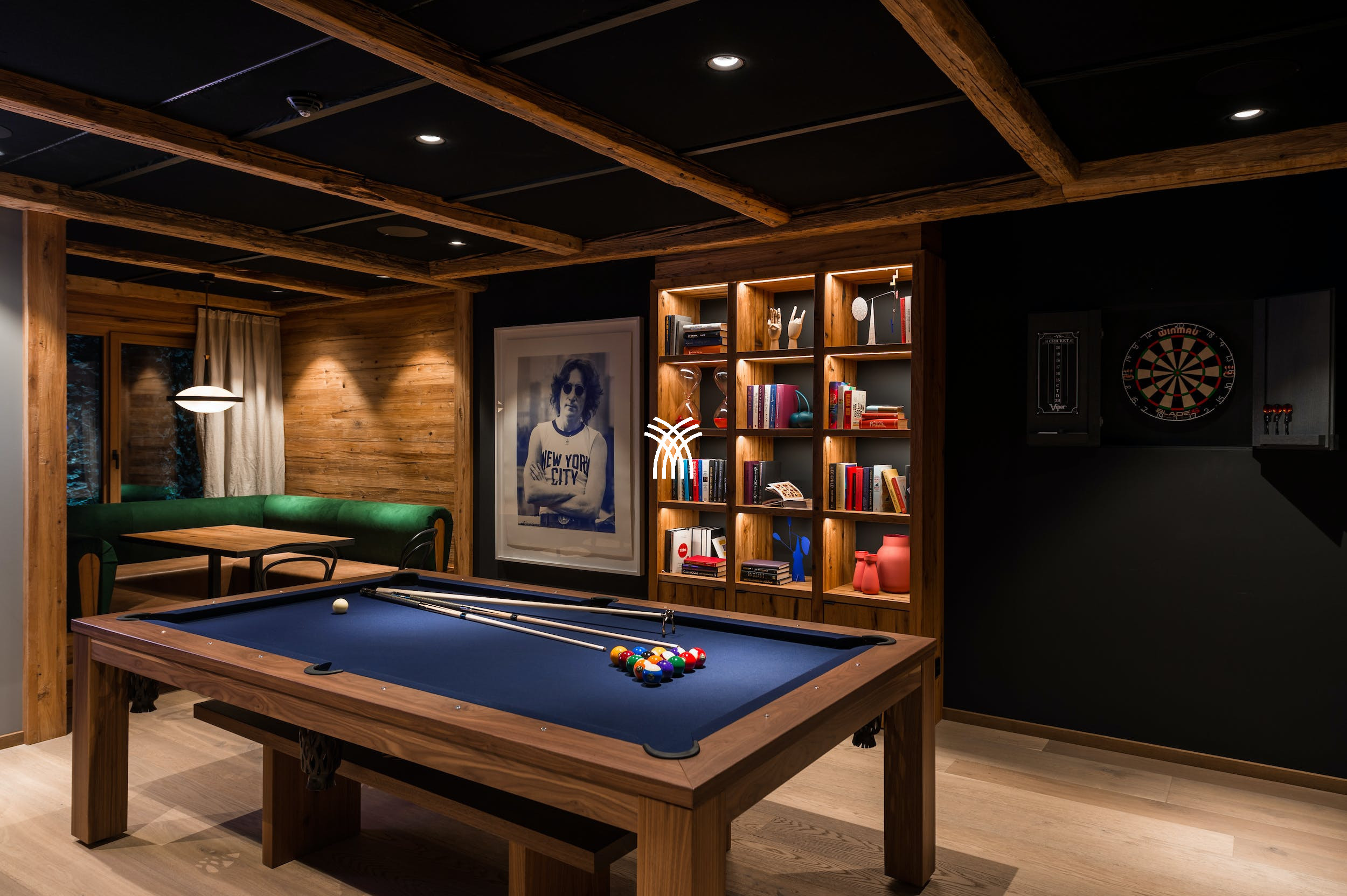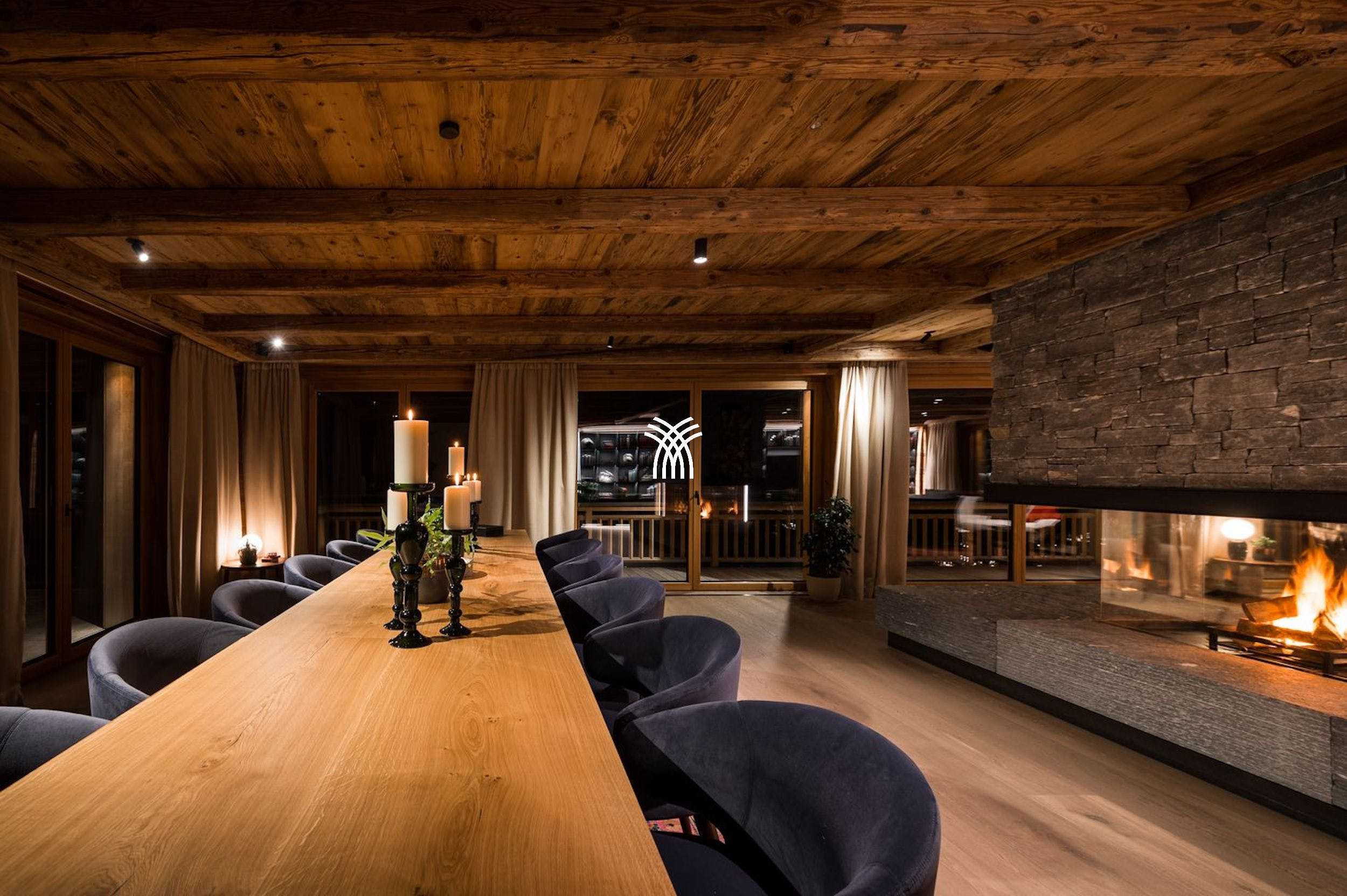 À l'intérieur, le vaste espace de vie ouvert est ancré par une cheminée à la caractéristique frappante, créant un point focal chaleureux pour la table à manger de quatorze places et le salon au coin du feu. Des fenêtres du sol au plafond encadrent le paysage montagneux, tandis que les portes s'ouvrent harmonieusement sur la terrasse. Les soirées sont idéales pour traîner autour du dîner avant de se retirer dans la salle de jeux pour une partie amicale de billard ou de fléchettes, ou pour prendre un verre détendu au bar.