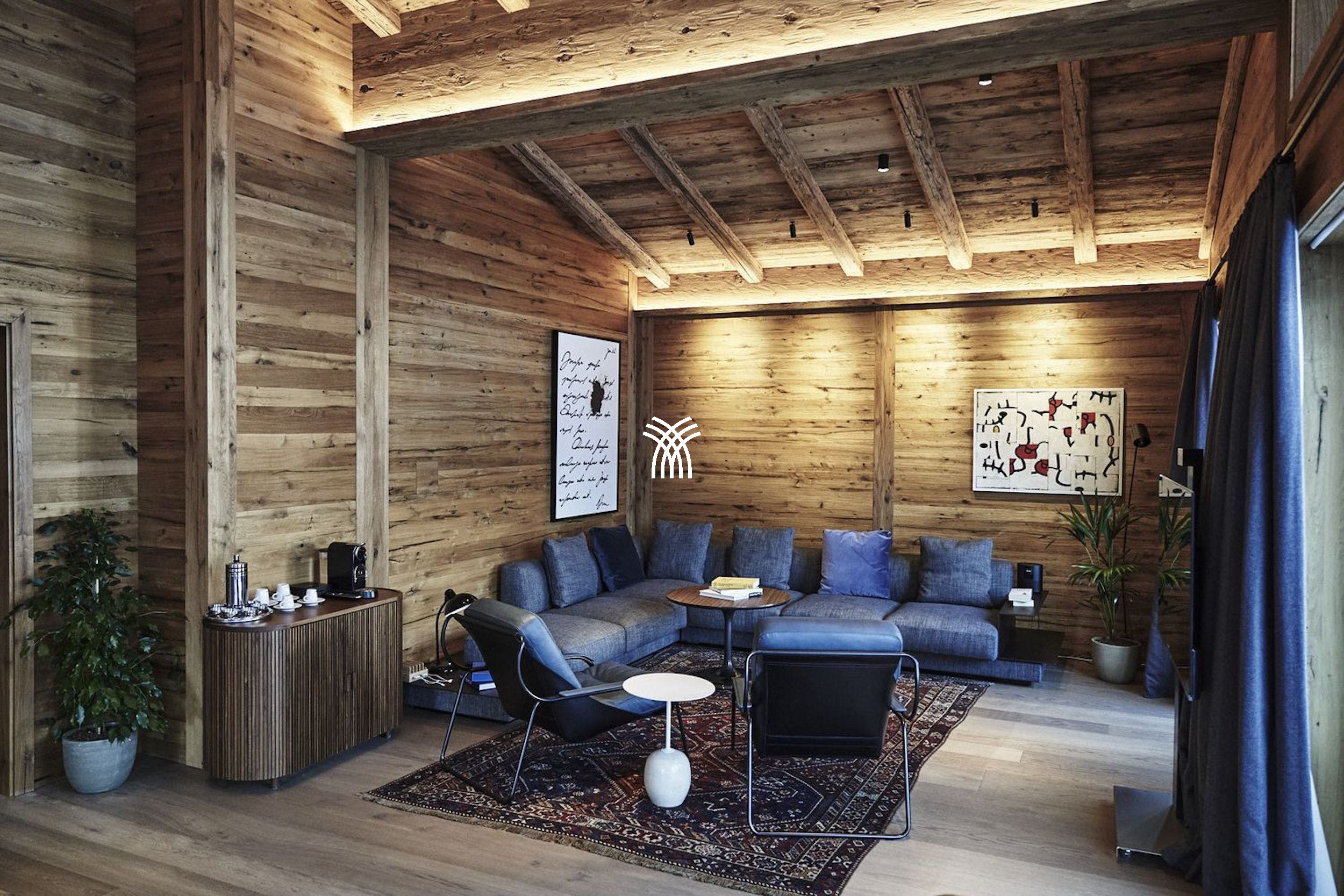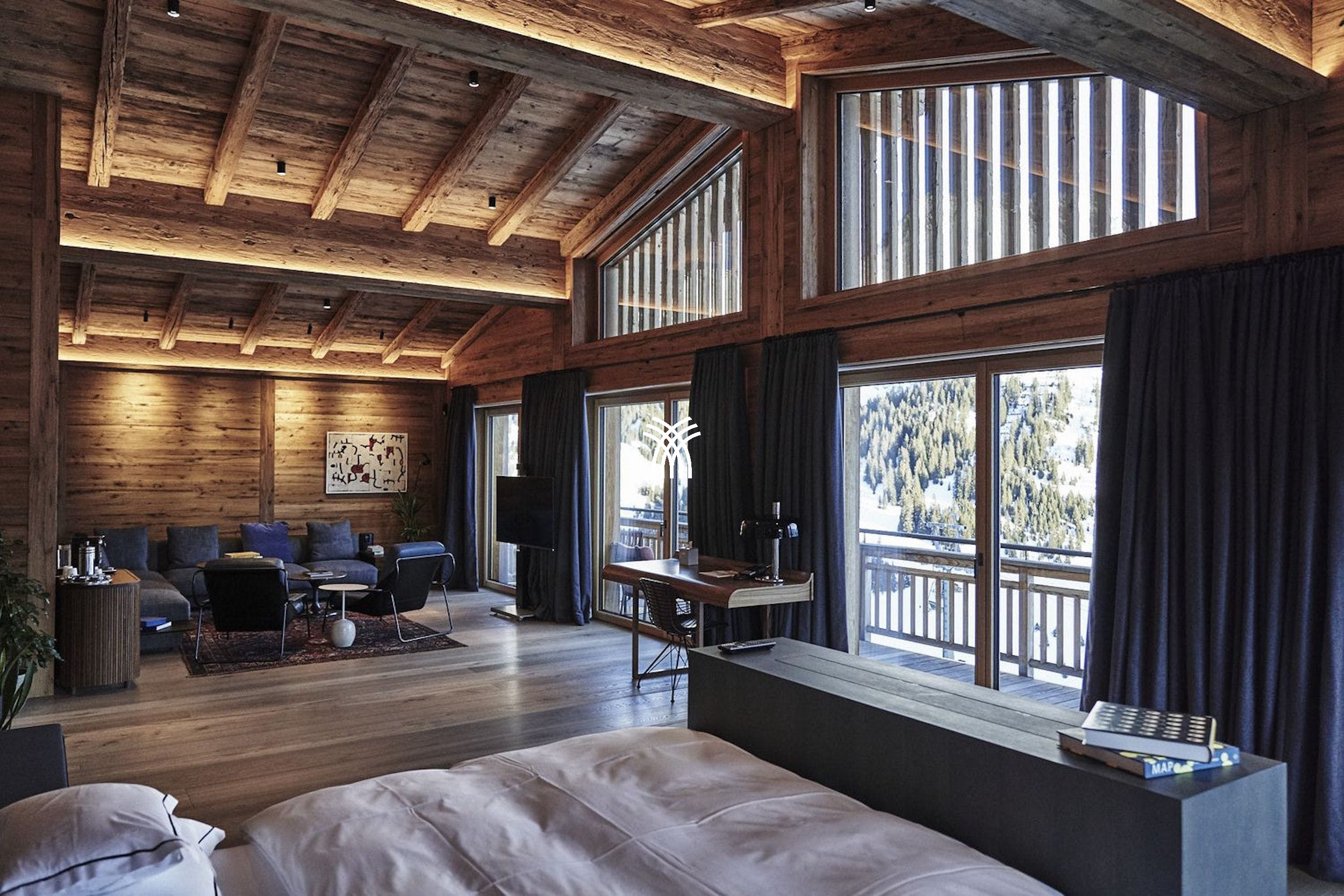 Les suites de chambres dégagent la tranquillité avec des murs en pin rustique, des meubles neutres doux et des salles de bains luxueuses finies en bois et en pierre naturelle. La suite principale est complétée par six chambres doubles king-size, deux chambres jumelles et une charmante chambre avec lits superposés pour quatre enfants, offrant chacune la même vue à couper le souffle sur Lech et Oberlech.