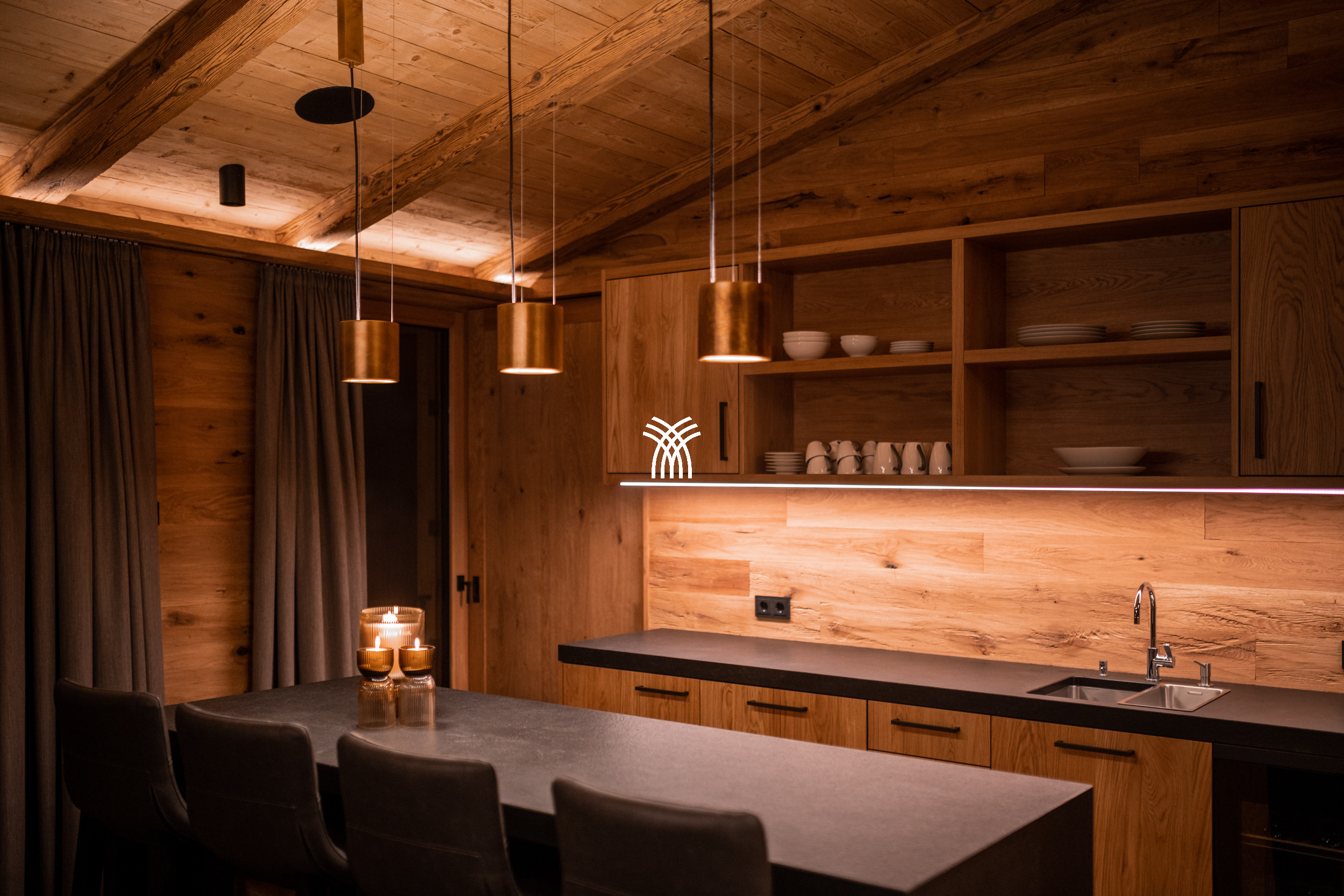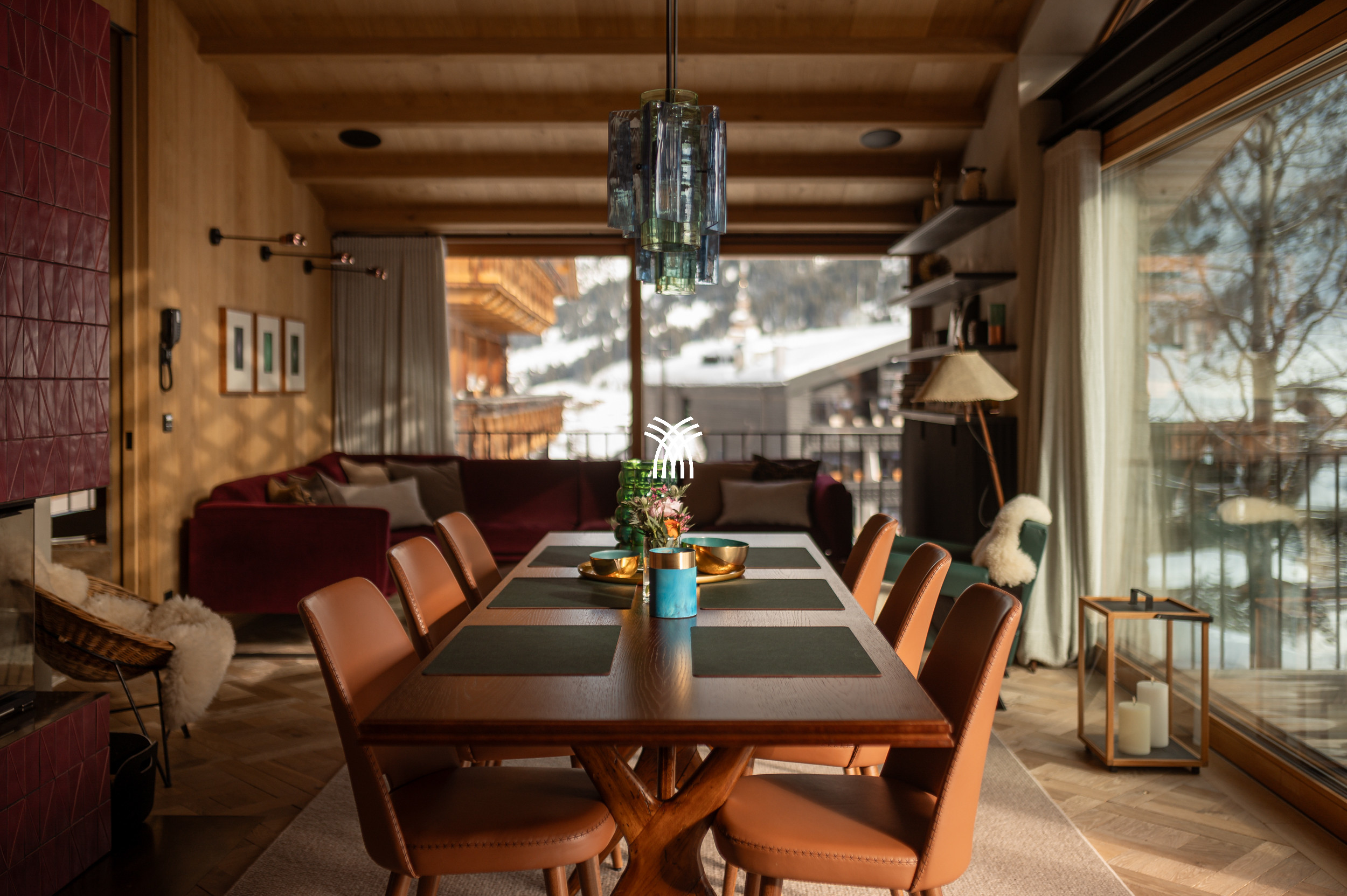 Au cœur du chalet, un grand salon et une salle à manger se déploient avec une grâce naturelle. Un feu de cheminée crépitant donne le ton pour des soirées chaleureuses, tandis que l'espace de repas spacieux et le salon-canapé accueillant créent le cadre parfait pour se réunir après une journée sur les pistes. Depuis le confort de votre siège, profitez de vues ininterrompues sur les montagnes emblématiques de l'Omeshorn et du Rüfikopf, un décor à couper le souffle qui définit l'essence de Lech.