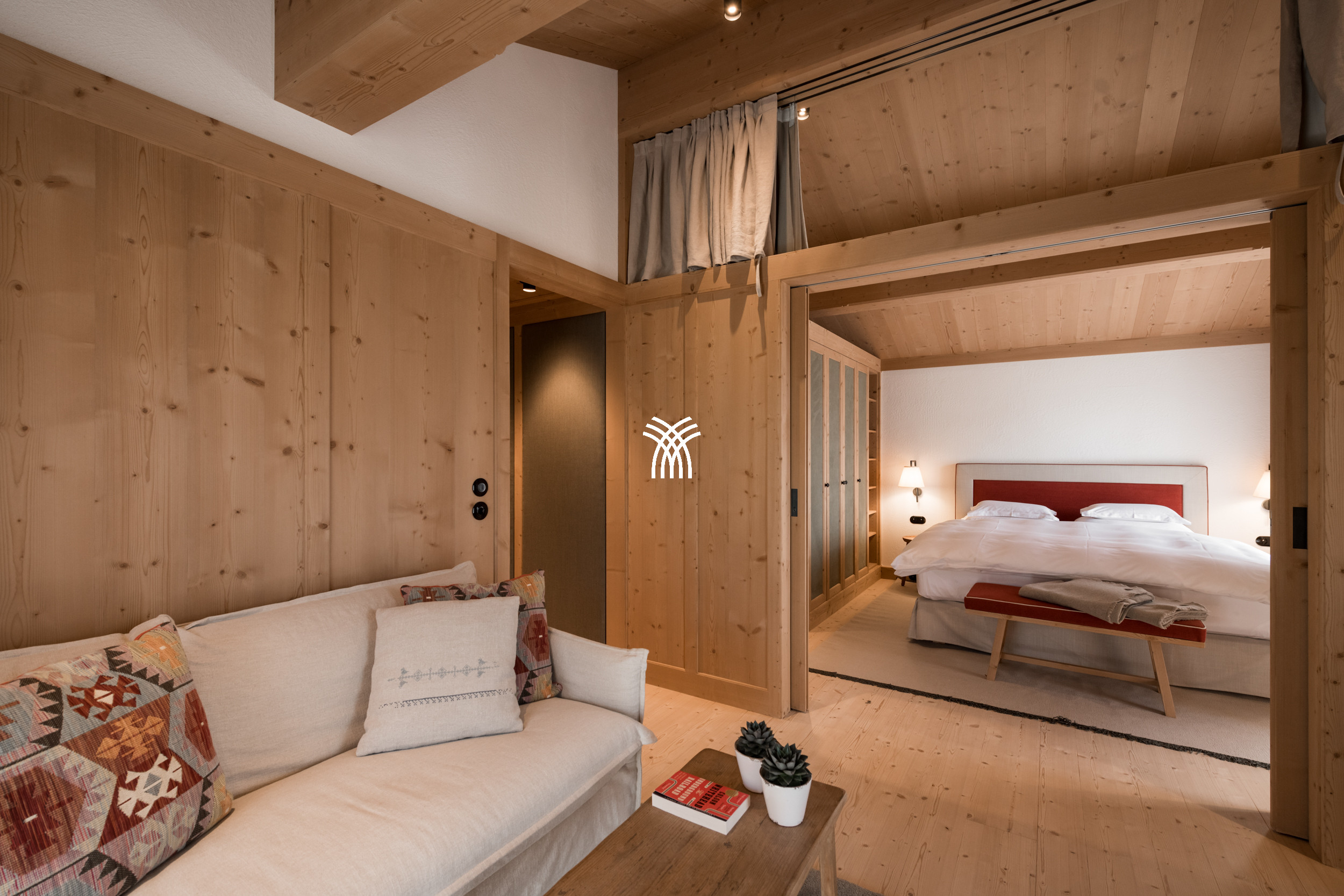 Inside, pale timbered walls, muted tones, and subtle rustic touches create a warm, inviting atmosphere that feels both luxurious and homely. The state-of-the-art spa is a highlight, featuring a serene indoor pool, sauna, and treatment room, while the rooftop hot tub offers breathtaking views of the surrounding peaks.