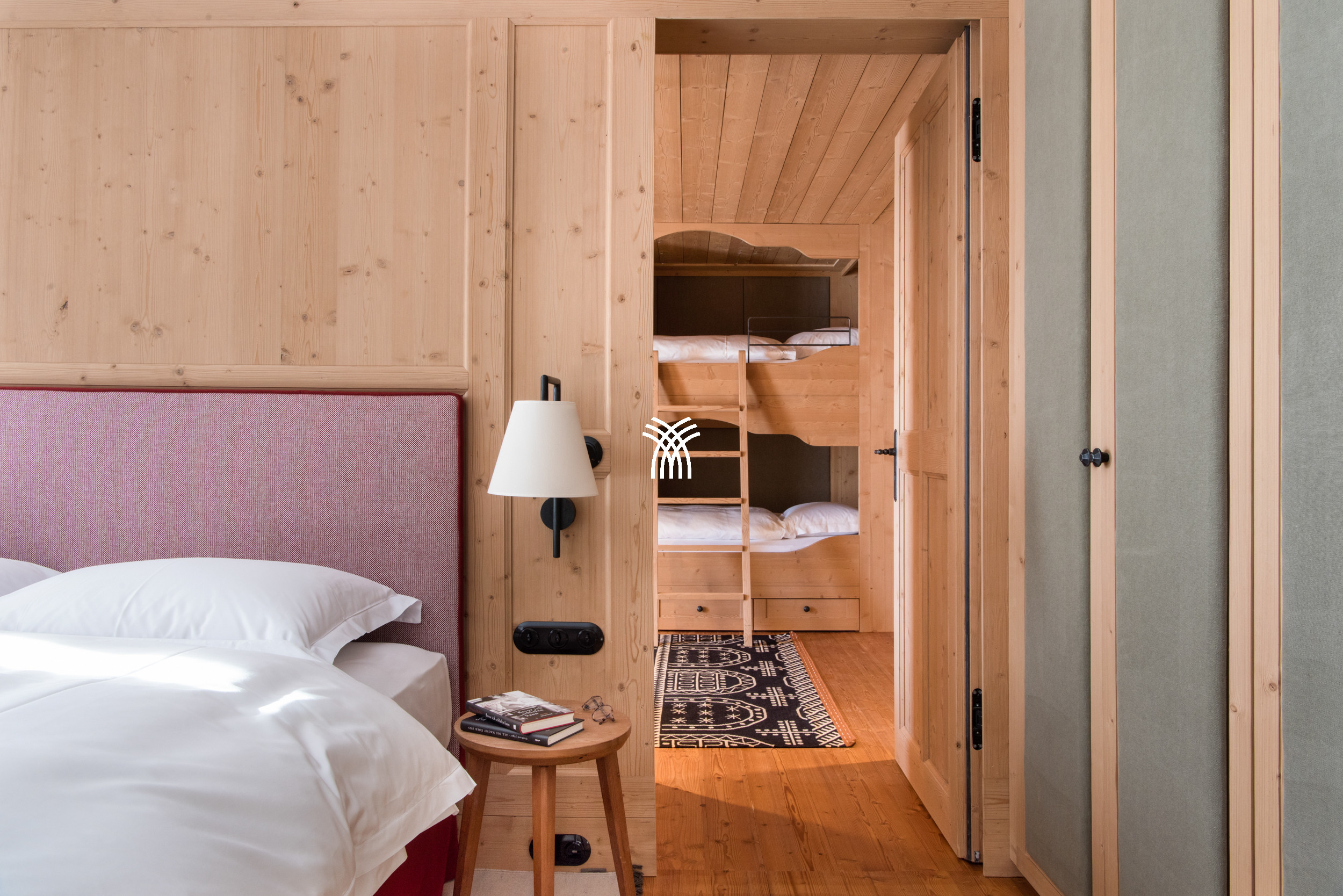 Chacune des quatre chambres doubles dispose d'une salle de bain élégante attenante, tandis qu'une chambre dédiée aux enfants avec lits superposés et sa propre salle de douche garantit le confort des jeunes invités. Toutes les chambres sont décorées dans des tons neutres apaisants, rehaussés de velours riches et de bois rustiques pour évoquer le charme de la vie alpine.