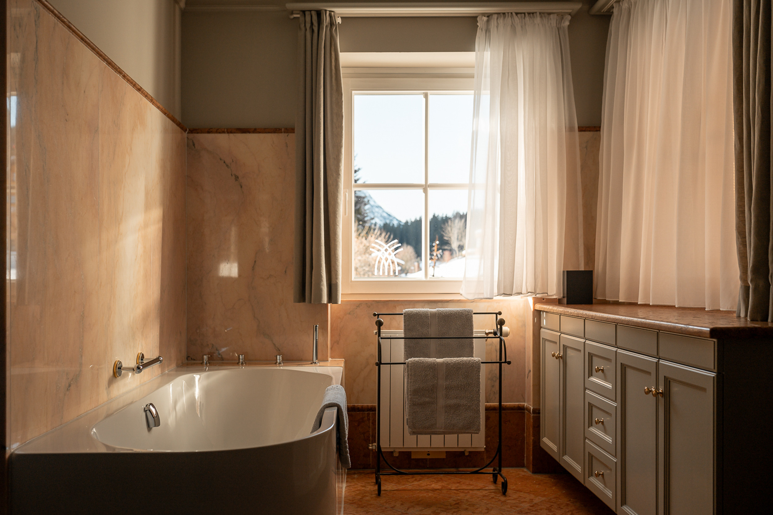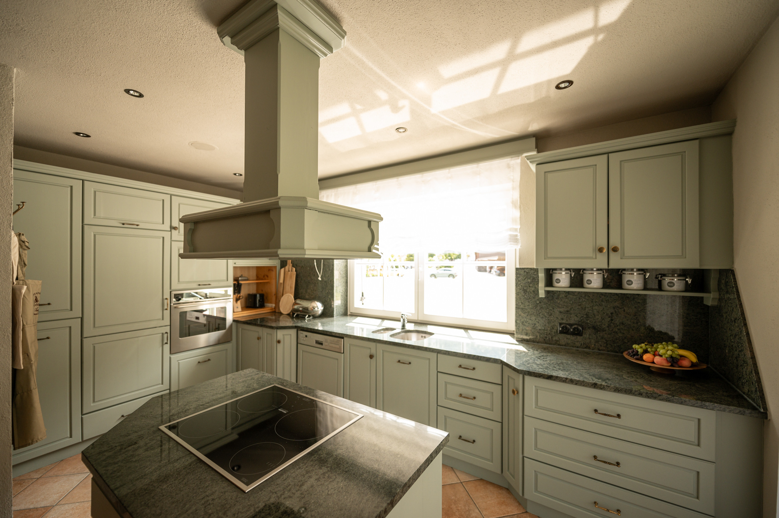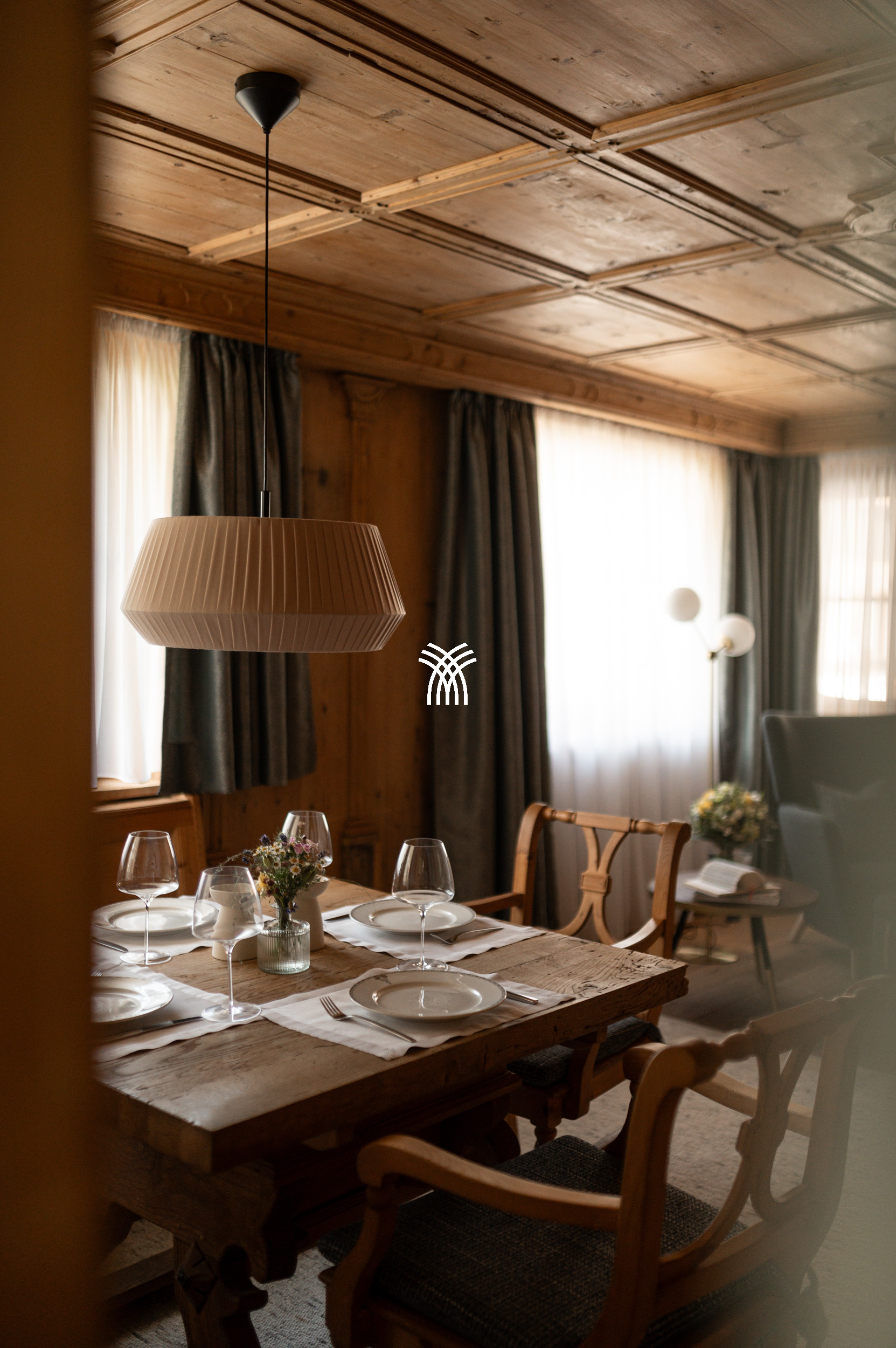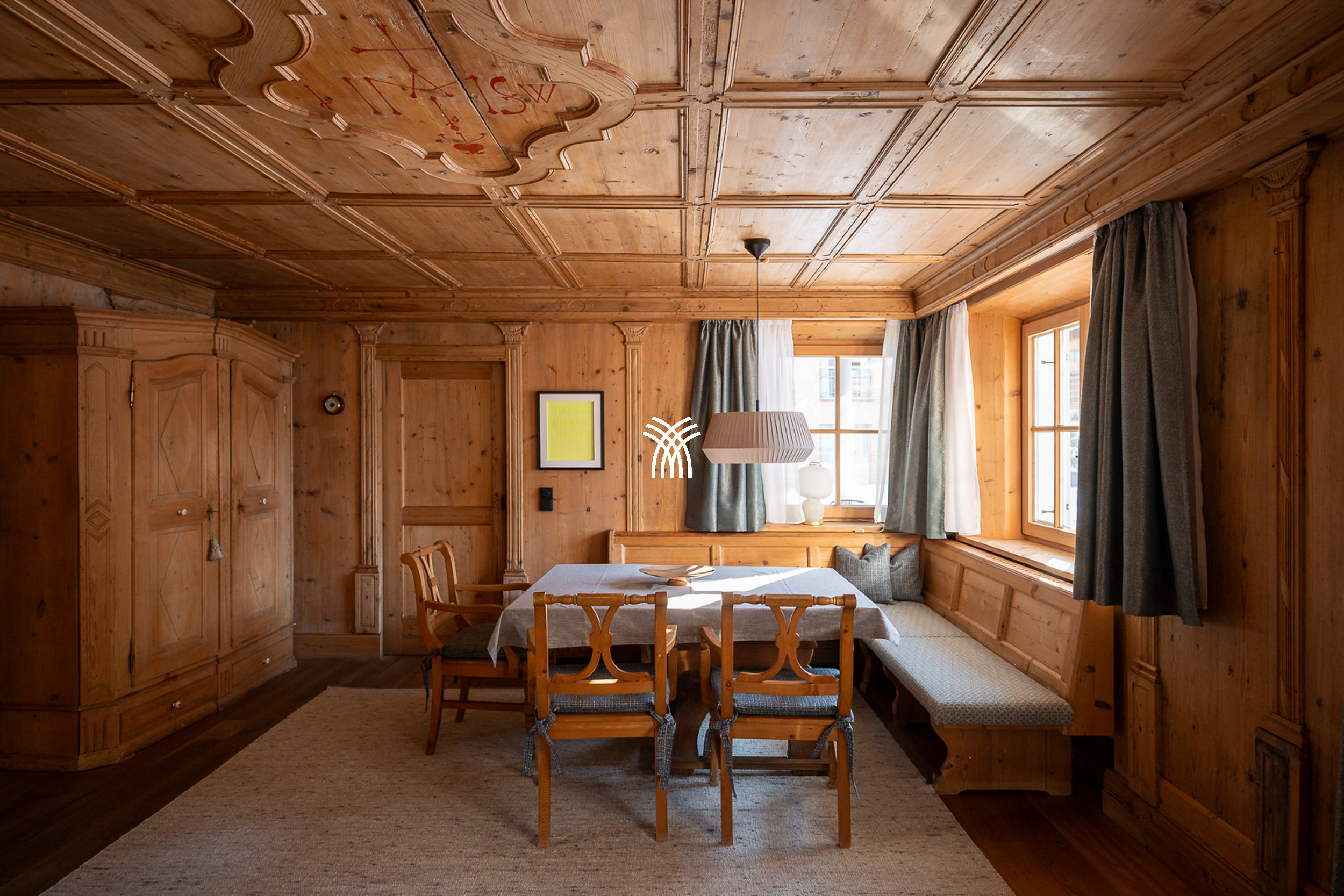Ce salon charmant du 19e siècle est un véritable point fort, avec un plafond à caissons finement ouvragé et un poêle à carreaux classique qui dégage chaleur et nostalgie. Après une journée sur les pistes, il n'y a pas de lieu plus réconfortant pour se détendre que sur le banc du poêle, où l'esprit de la vie alpine prend vie dans sa forme la plus intime. La cuisine entièrement équipée donne sur l'une des quatre terrasses privées, offrant le cadre parfait pour se prélasser sous le soleil alpin tout en admirant les vues ininterrompues sur l'Omeshorn enneigé.