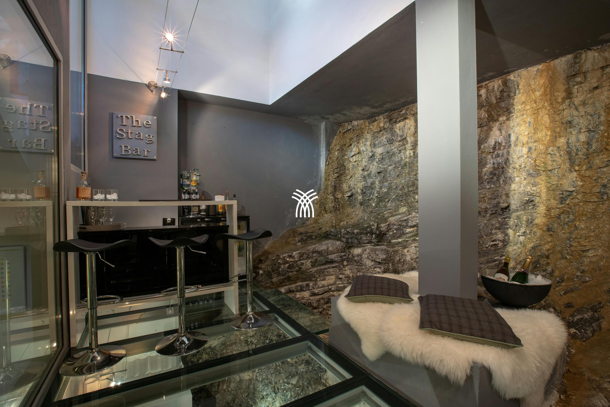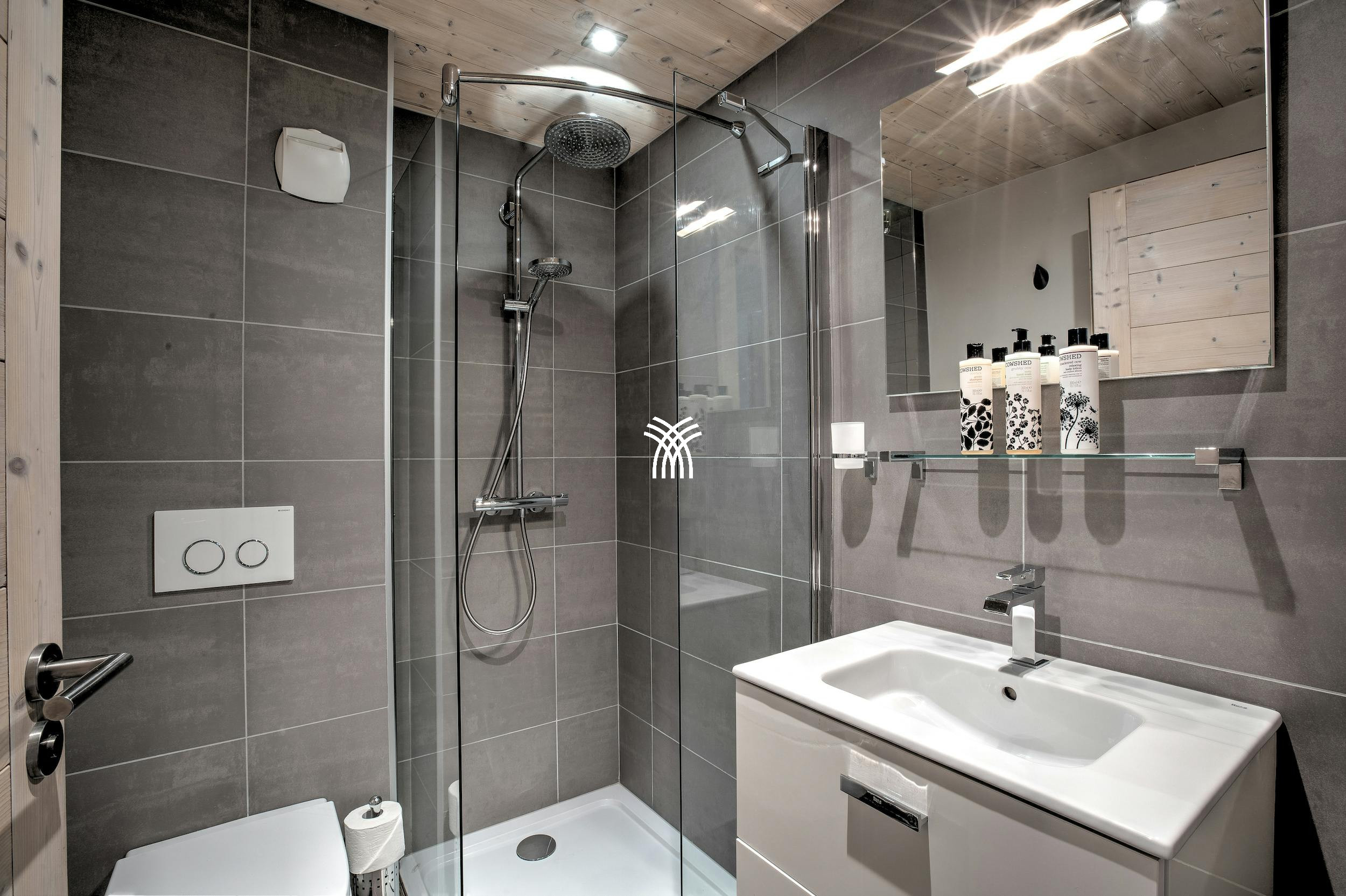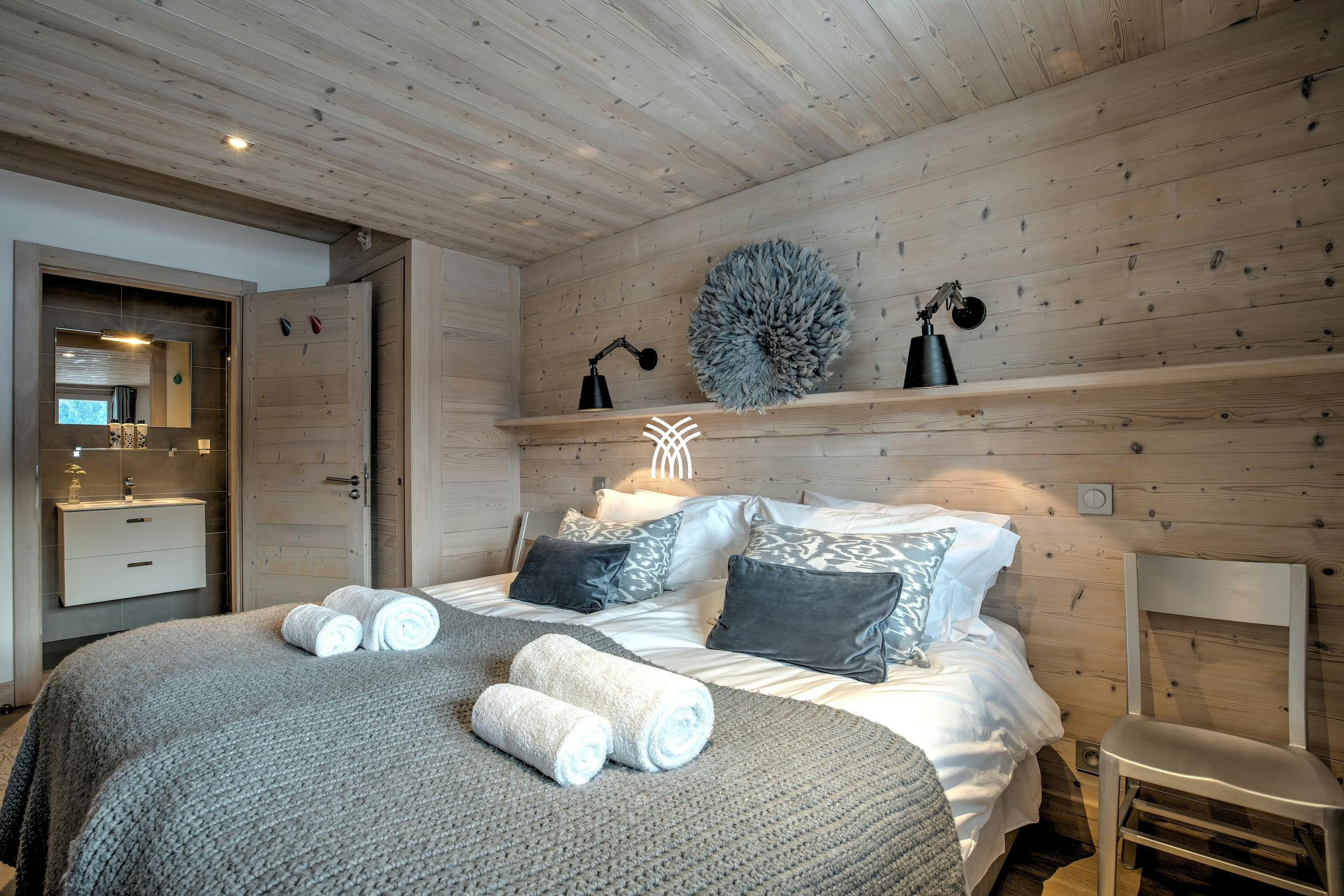 Une terrasse supplémentaire abrite le jacuzzi privé et le solarium du chalet, l'endroit idéal pour regarder le soleil se coucher derrière le majestueux Roc d'Enfer, verre à la main. Pour plus de divertissement après-ski, rendez-vous dans l'espace bar unique du chalet, habilement aménagé dans la paroi rocheuse et comprenant un bar, un baby-foot et même un sol en verre — un espace ludique et élégant pour se divertir.