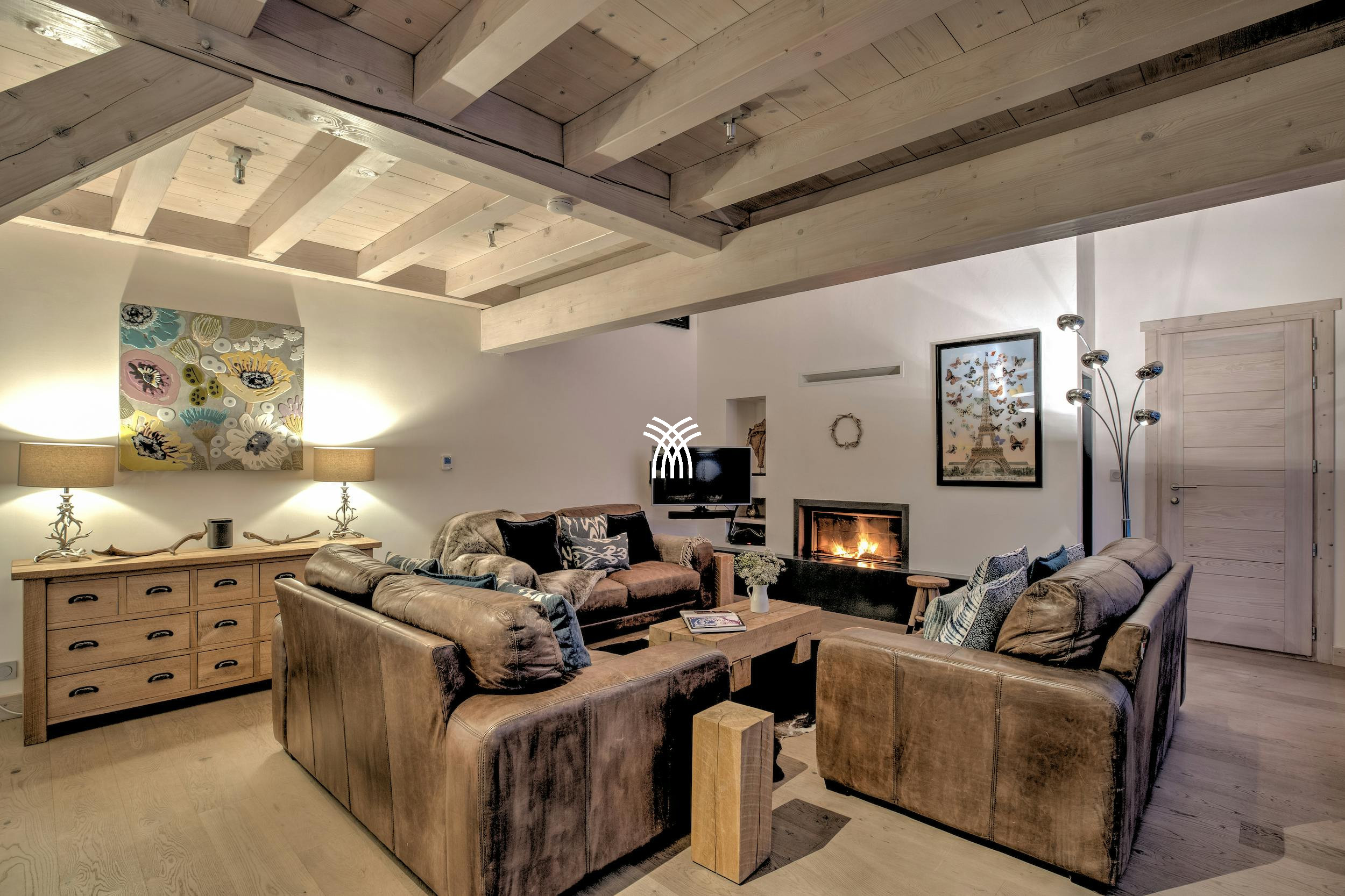 Après une journée sur les pistes, retirez-vous dans le salon accueillant, où des canapés en cuir doux et un feu ouvert rugissant créent le cadre parfait pour se détendre. D'autres portes coulissantes s'ouvrent sur la terrasse, vous invitant à continuer de profiter de ces vues envoûtantes.