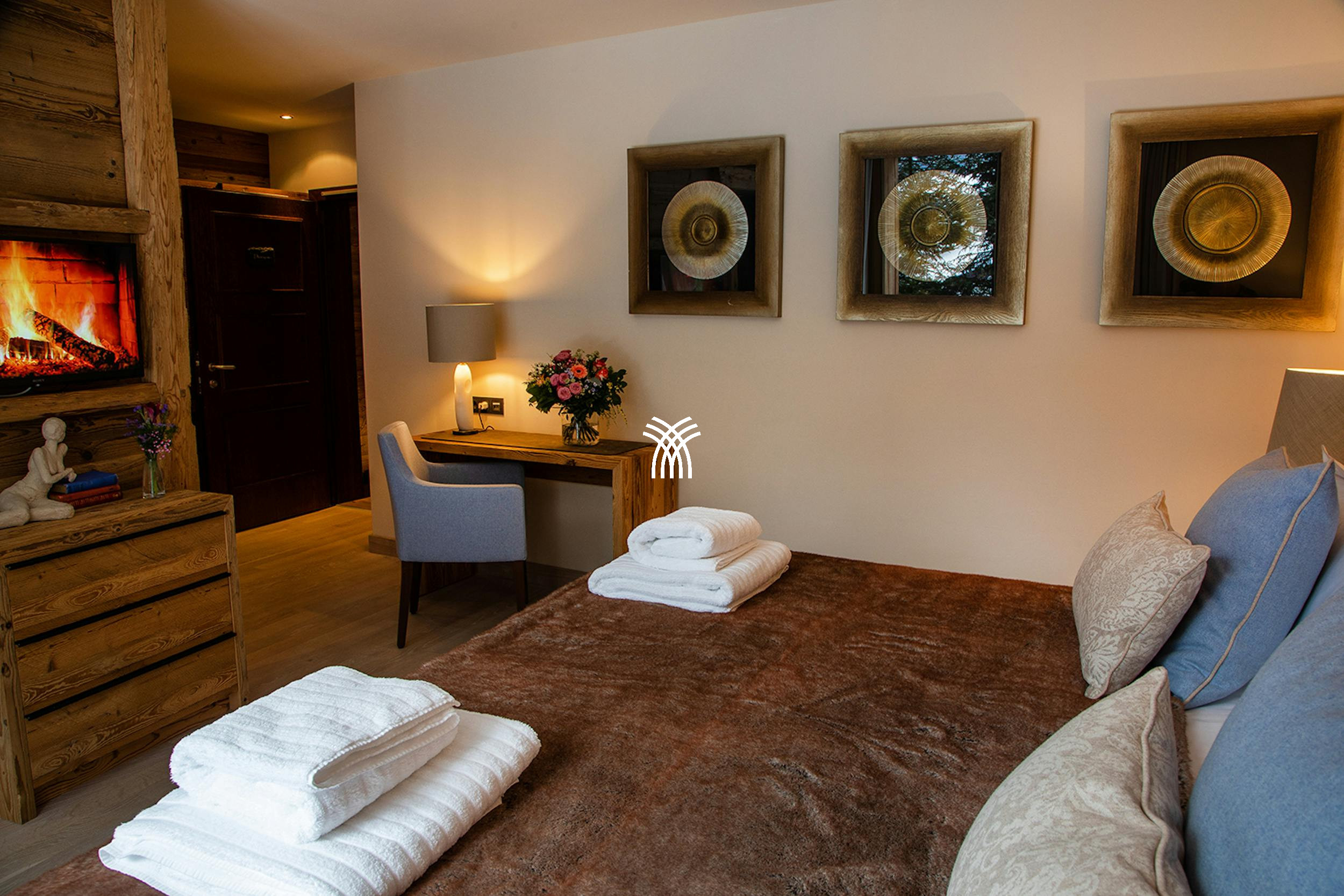 Entre l'espace de vie et le spa, deux étages d'hébergement élégant abritent six chambres doubles magnifiquement conçues, chacune avec une salle de bain privative élégante. Plusieurs disposent de balcons ou de terrasses privés offrant des vues enchanteresses sur la montagne.