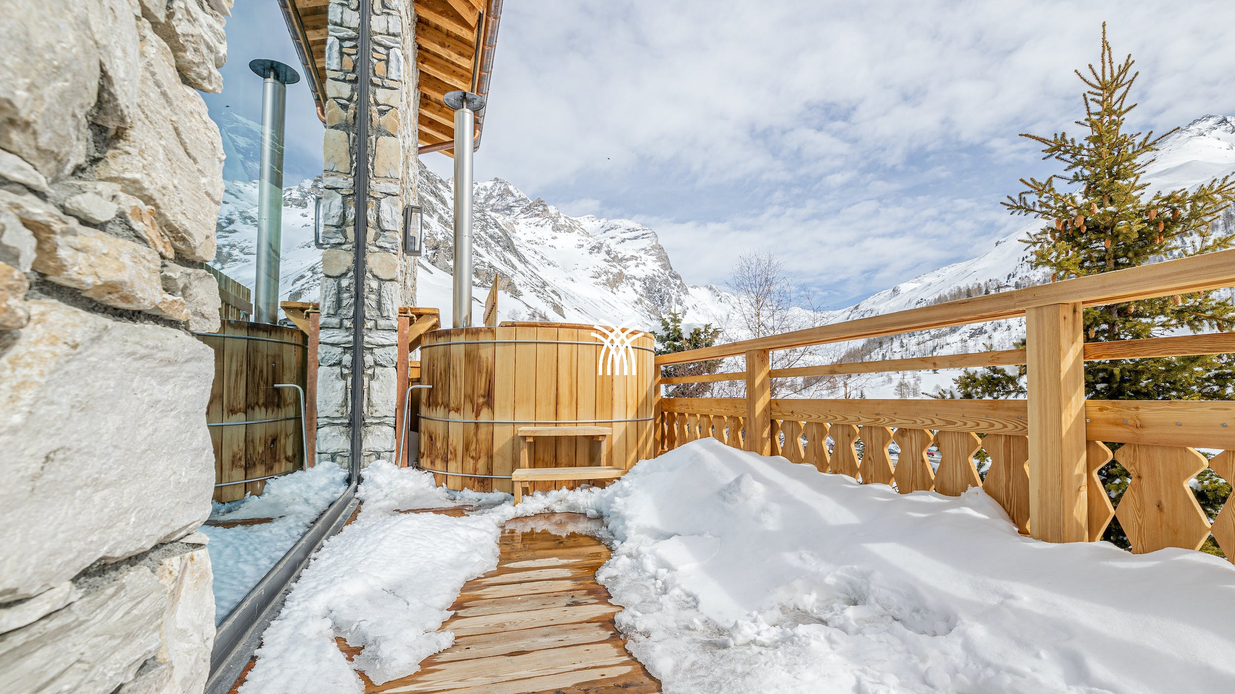Sortez sur la terrasse spacieuse et profitez des vues panoramiques à 220° sur la vallée. Cet espace extérieur remarquable est conçu à la fois pour la détente et la socialisation, avec un bar à brasero et un bain norvégien chauffé, offrant l'endroit idéal pour se détendre sous les étoiles.