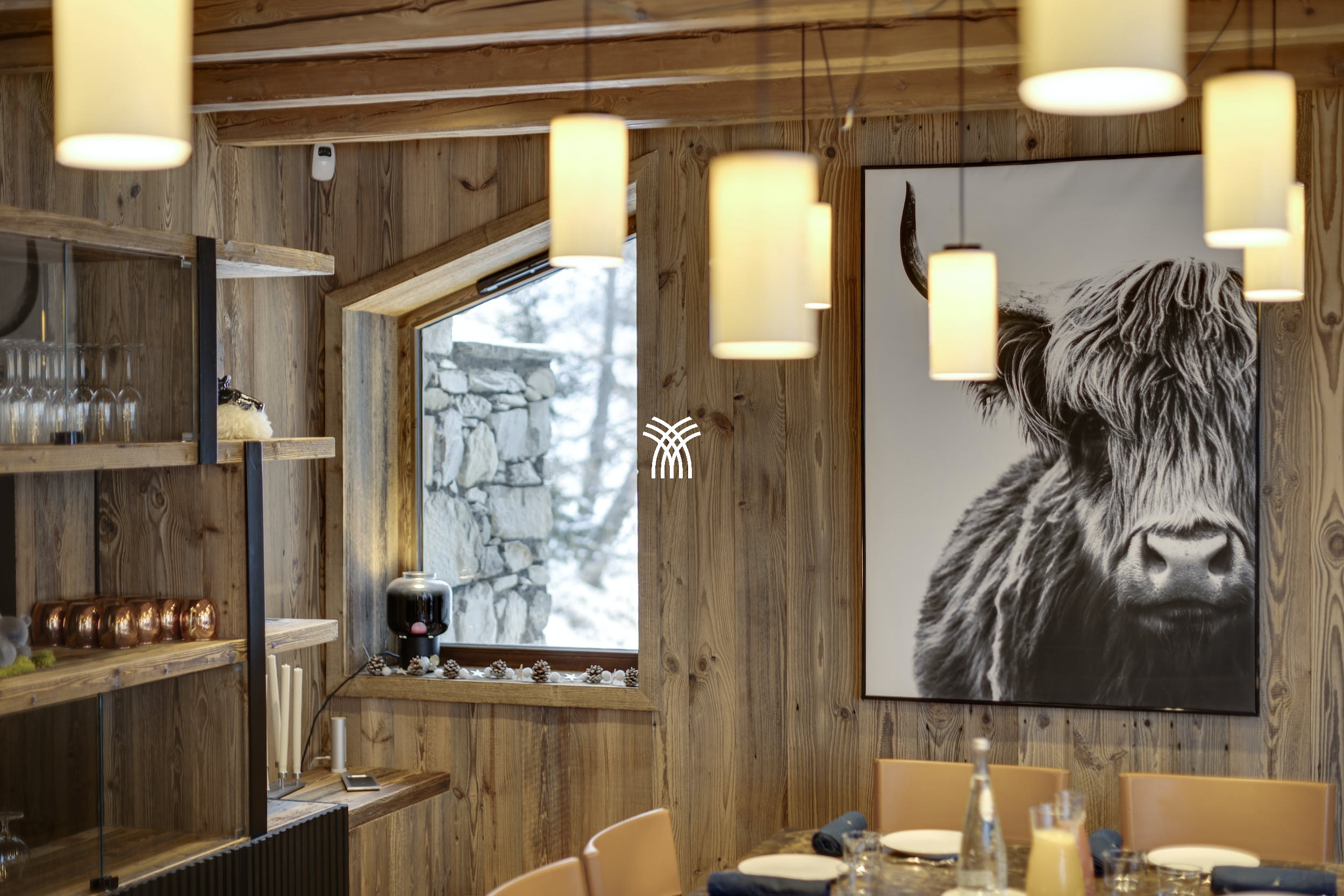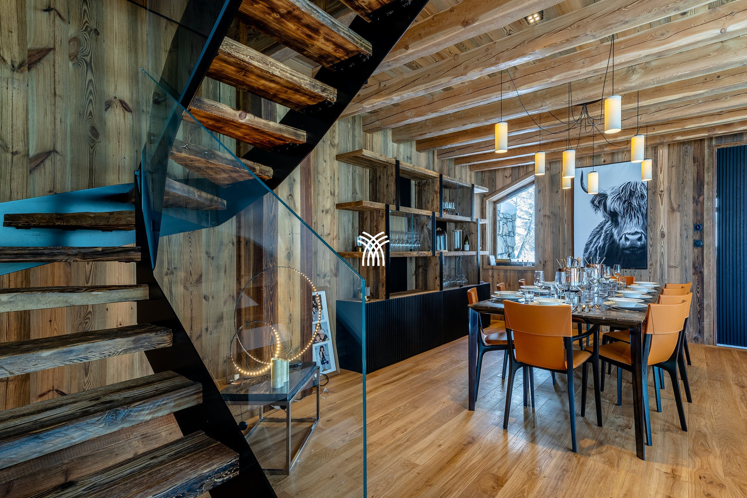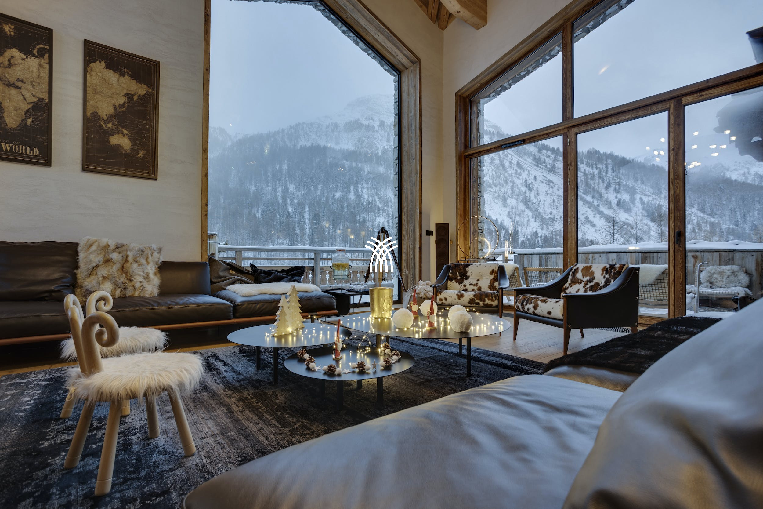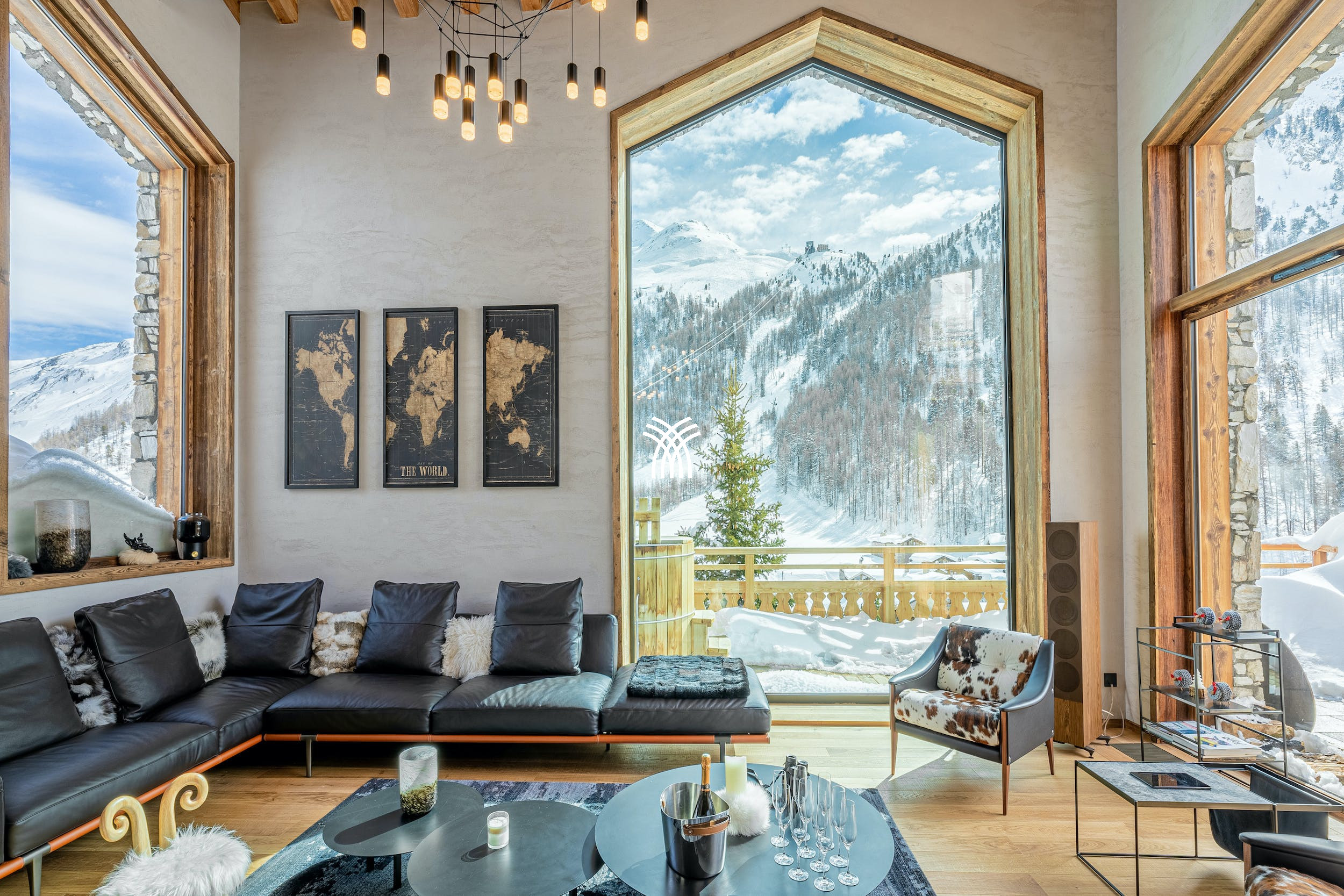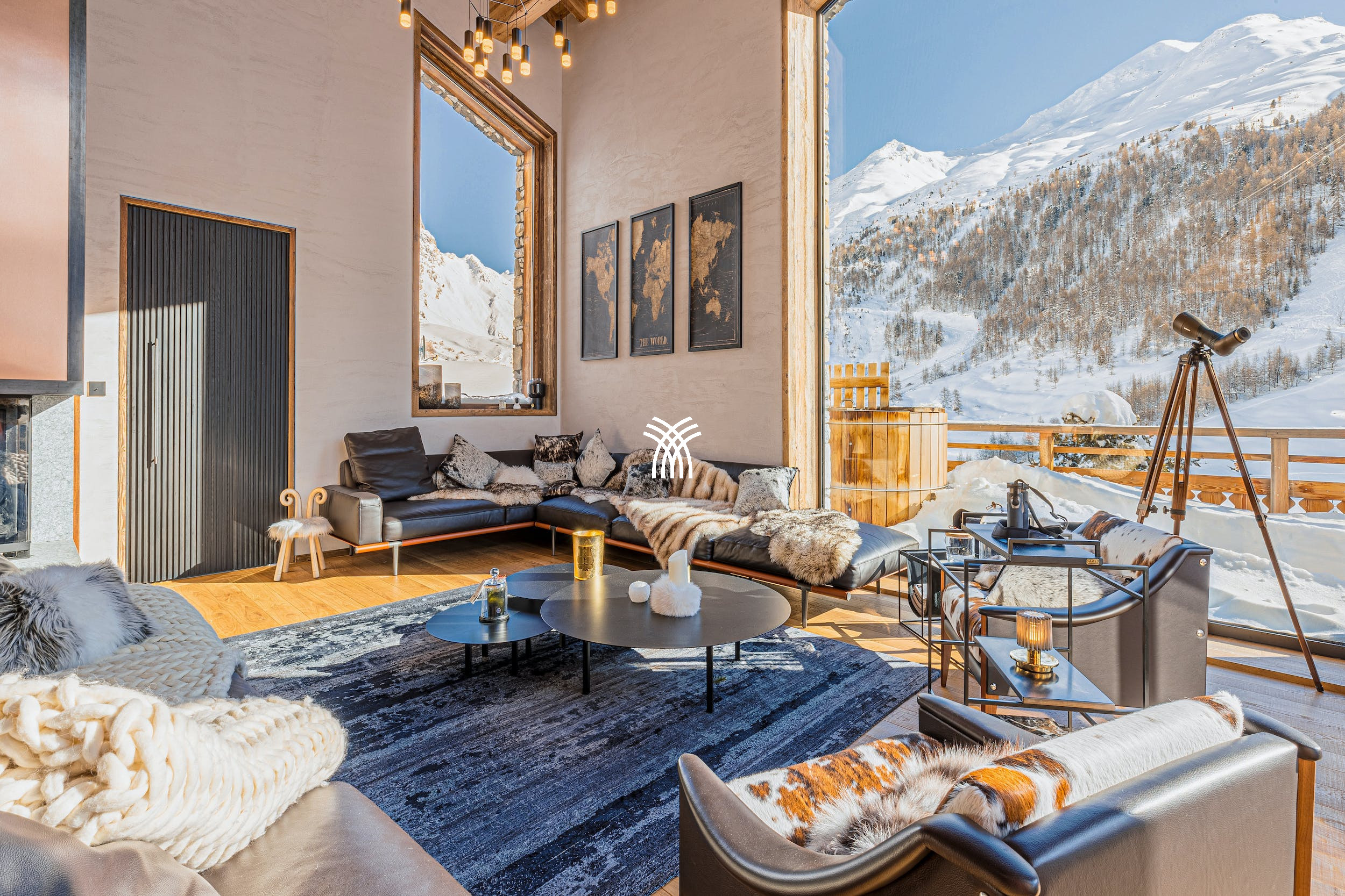 Le dernier étage du Chalet Atlas est dédié à un espace de vie baigné de lumière où les vues panoramiques sont à l'honneur. Un salon spacieux avec un canapé modulaire et un feu de bois rugissant invite à des soirées chaleureuses, tandis que l'élégante salle à manger et le bar branché créent le décor de rassemblements mémorables. Sortez sur la terrasse sur le toit pour profiter du magnifique paysage alpin avec un verre de bon vin provenant de l'impressionnante cave à vin.