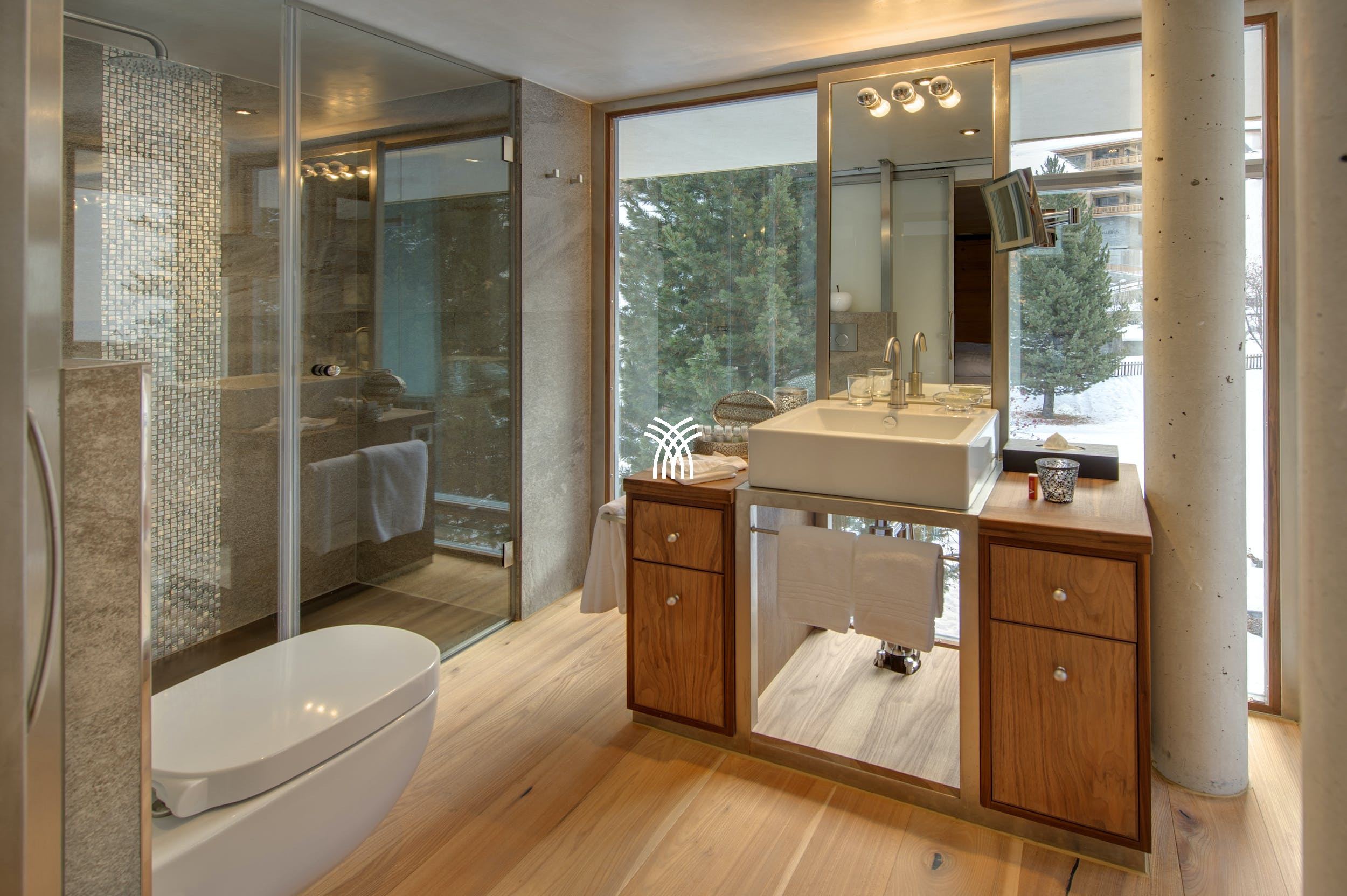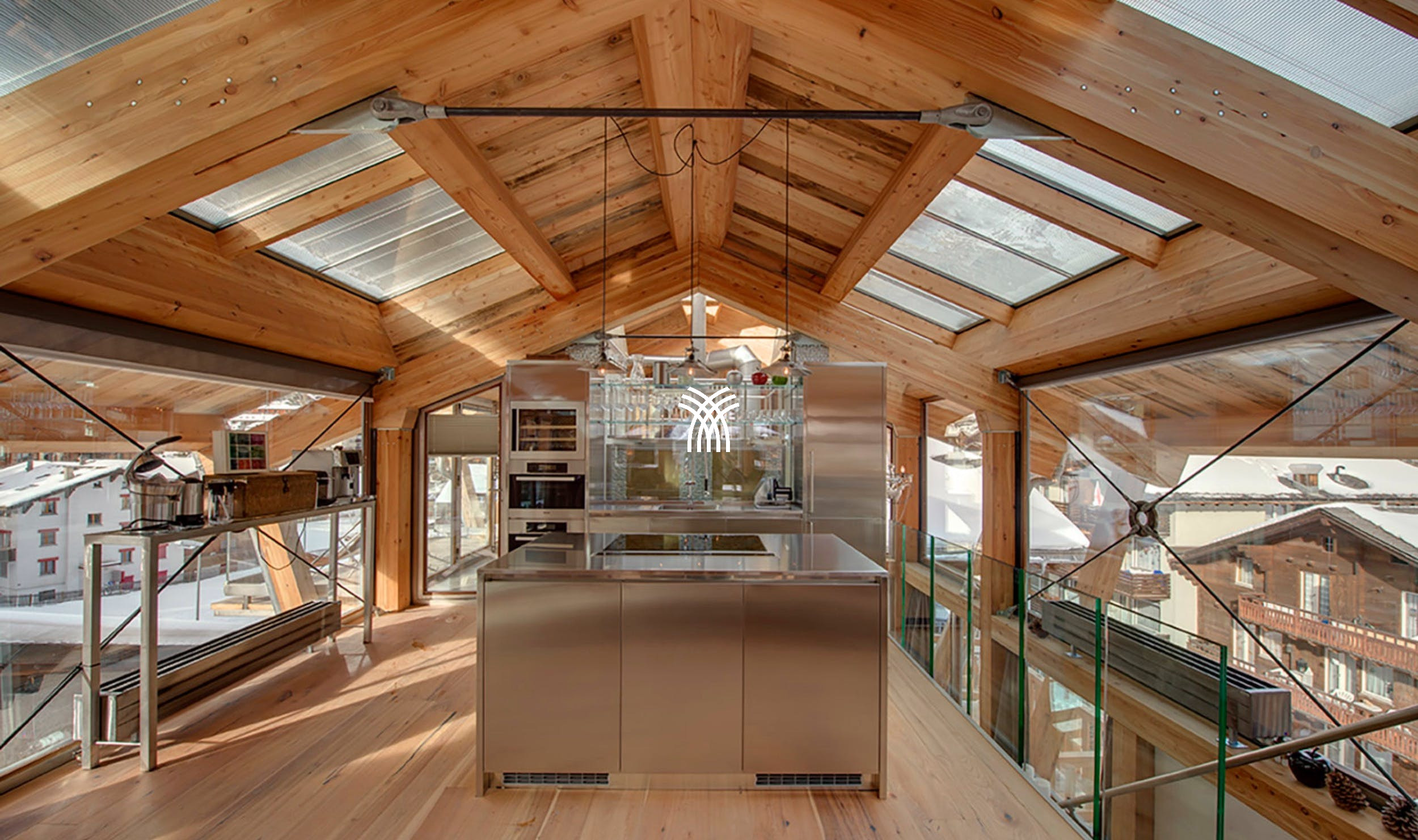 Les espaces de vie ouverts et expansifs présentent des fenêtres du sol au plafond majestueuses, un toit en verre qui invite le ciel de montagne à l'intérieur, un canapé-lit douillet enveloppant, une cheminée ouverte accueillante et des vues ininterrompues sur le village enchanteur de Zermatt et le Cervin iconique. Sortez sur le généreux balcon enveloppant pour vous immerger dans un chef-d'œuvre panoramique, vous prélassant au soleil tout au long de l'année tout en contemplant trois domaines skiables distincts et la beauté changeante des Alpes.