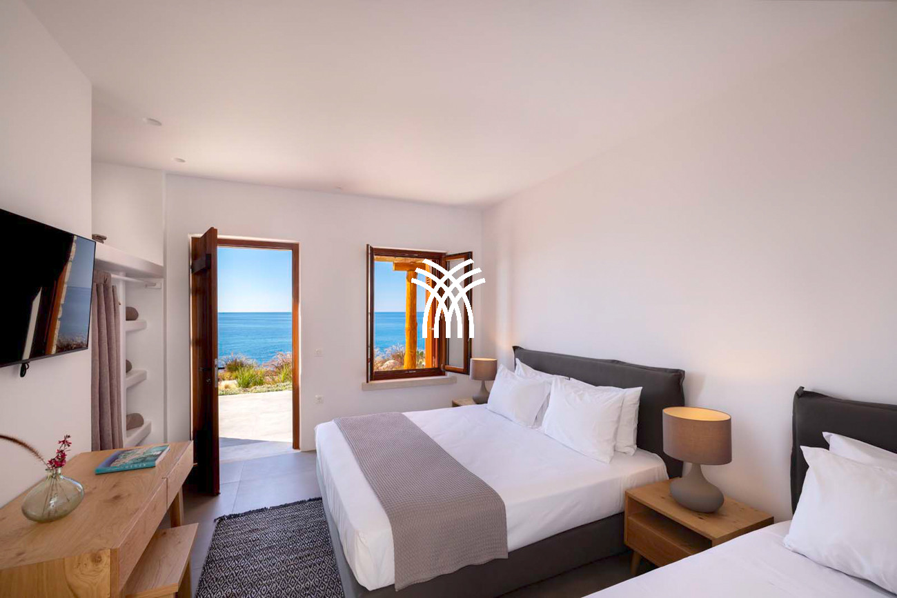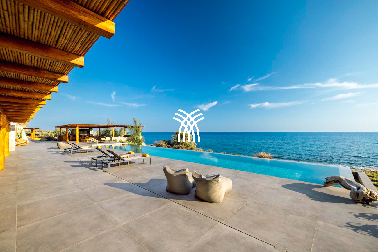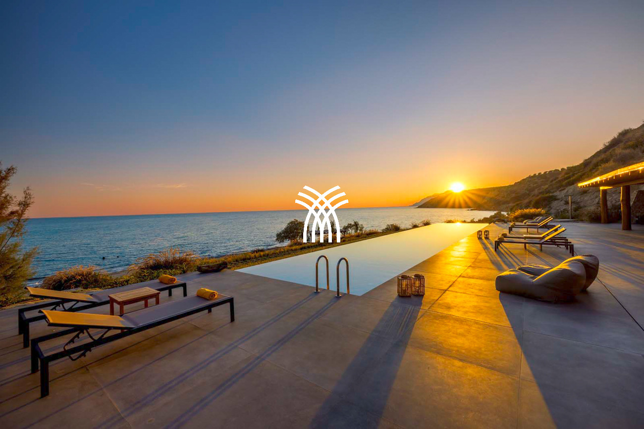 À quelques pas seulement de la plage, cette villa de luxe en bord de mer dévoile des vues ininterrompues sur l’horizon et l’océan, dans un silence absolu seulement rythmé par le ressac des vagues. L’arrivée à la propriété est déjà une expérience en soi : un chemin sinueux traverse une ancienne oliveraie, longe une chapelle dédiée à Saint Dimitrios et mène progressivement vers un promontoire naturel dominant un récif aux nuances turquoise et une plage de sable intacte, révélant peu à peu ce refuge hors du temps .
