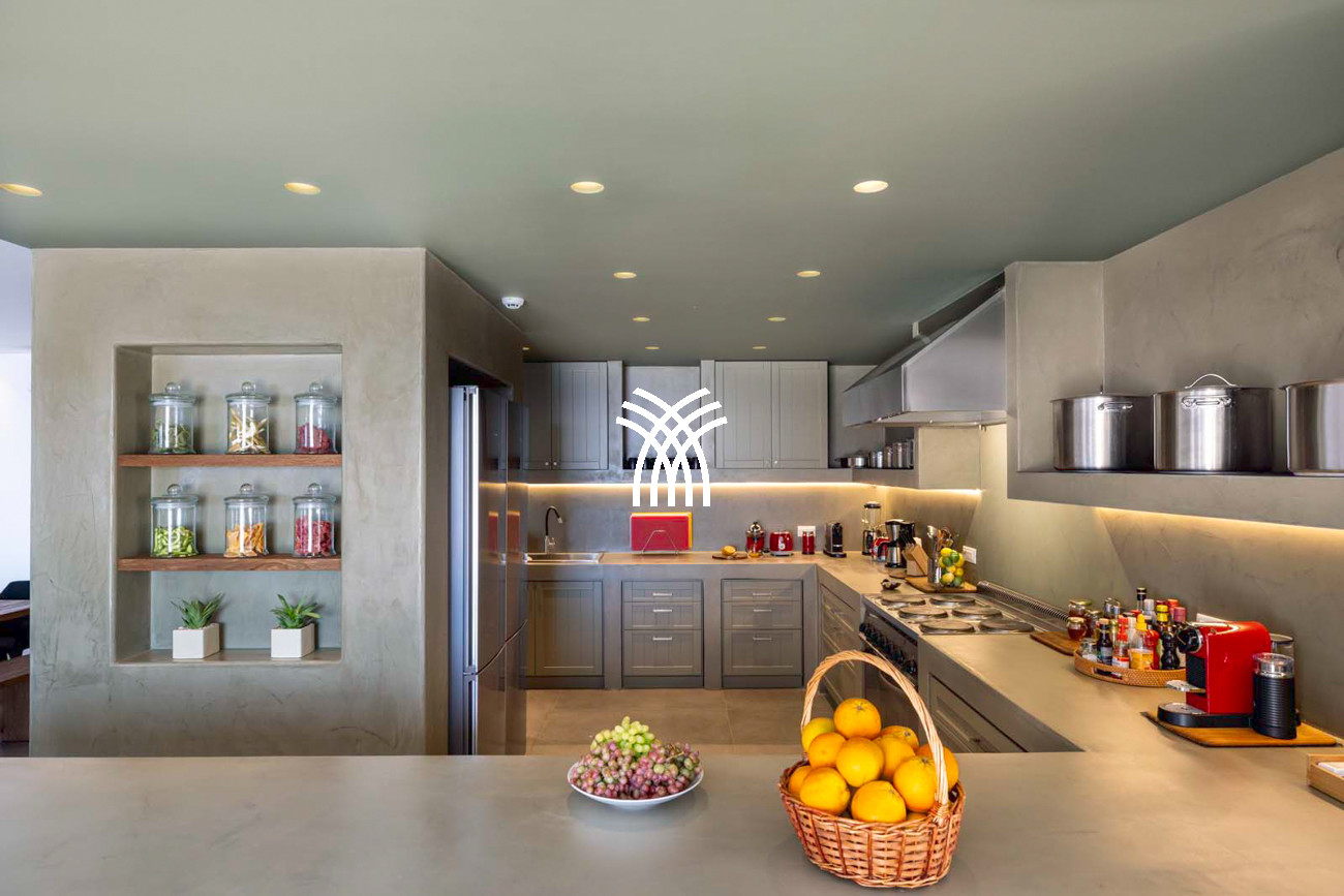 Dès l'arrivée, l'entrée principale s'ouvre sur un salon spacieux en plan ouvert où des vues panoramiques s'étendent sur la mer et les montagnes, remplissant les intérieurs de lumière et d'une ambiance méditerranéenne sereine. L'espace de vie se prolonge naturellement vers l'espace repas et une cuisine professionnelle entièrement équipée, soigneusement conçue pour préparer des repas avec facilité, même pour de grands rassemblements de plus de vingt-huit invités, faisant de la résidence un lieu parfaitement adapté aux grandes familles, aux célébrations ou aux retraites de groupe recherchant une location de villa de luxe distinguée en Crète.