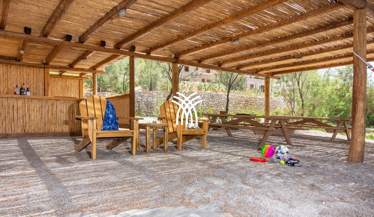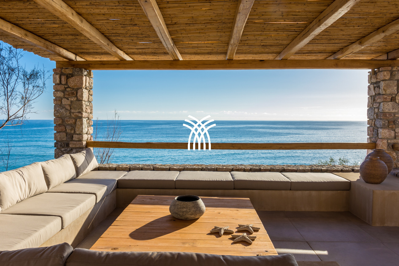 Les espaces de vie extérieurs constituent le véritable cœur de la propriété. Une grande pergola principale accueille des espaces de repas en plein air et un salon intégré, faisant face à la mer et à la piscine à débordement de 22 mètres, qui semble se fondre dans l’horizon. Une seconde pergola, dédiée à la cuisine extérieure et au barbecue, prolonge les moments de convivialité dans un cadre spectaculaire, tandis qu’un accès privé mène directement à la plage et à une pergola aménagée en bord de mer .
