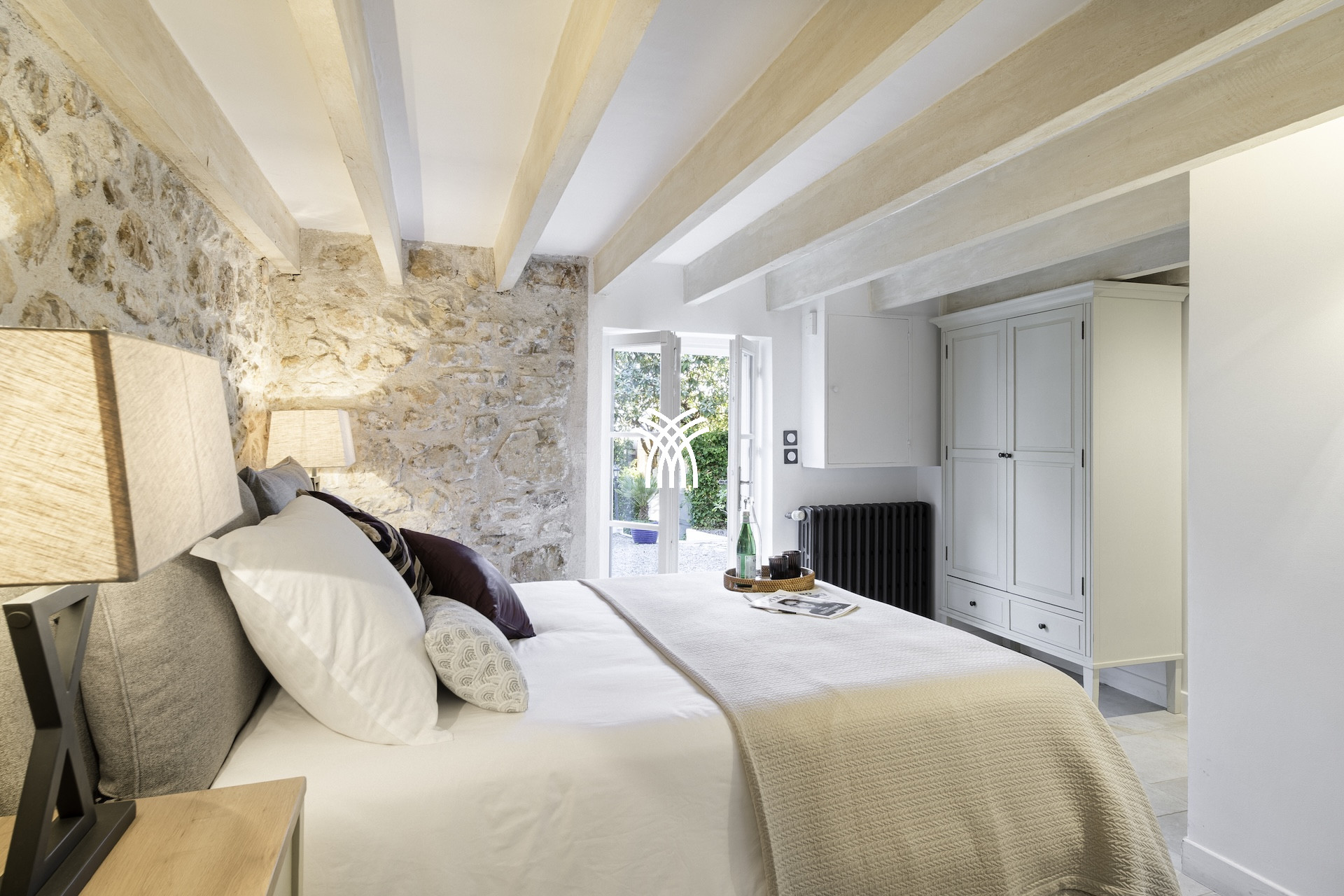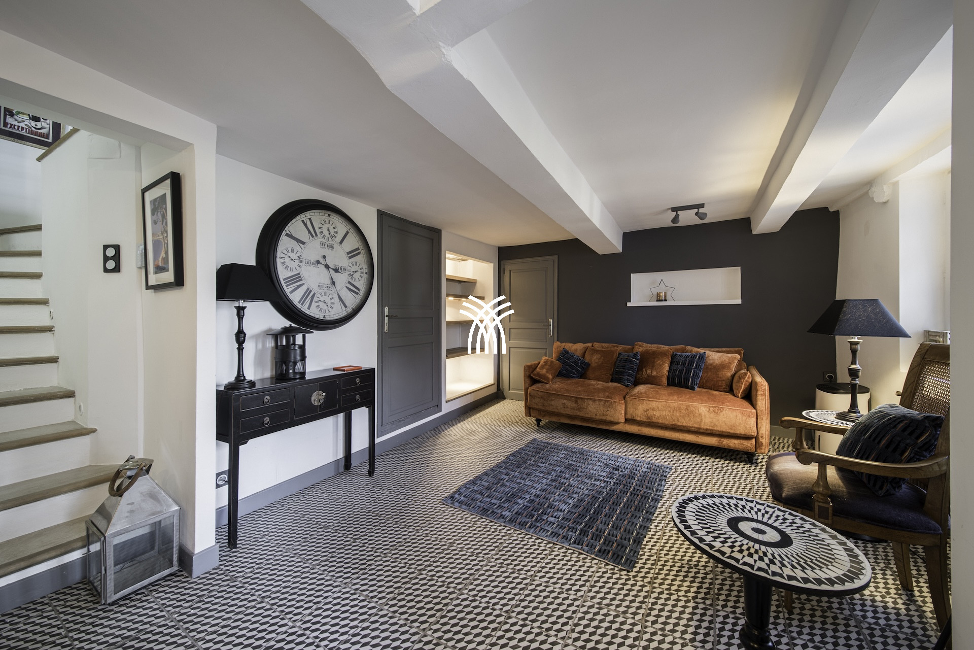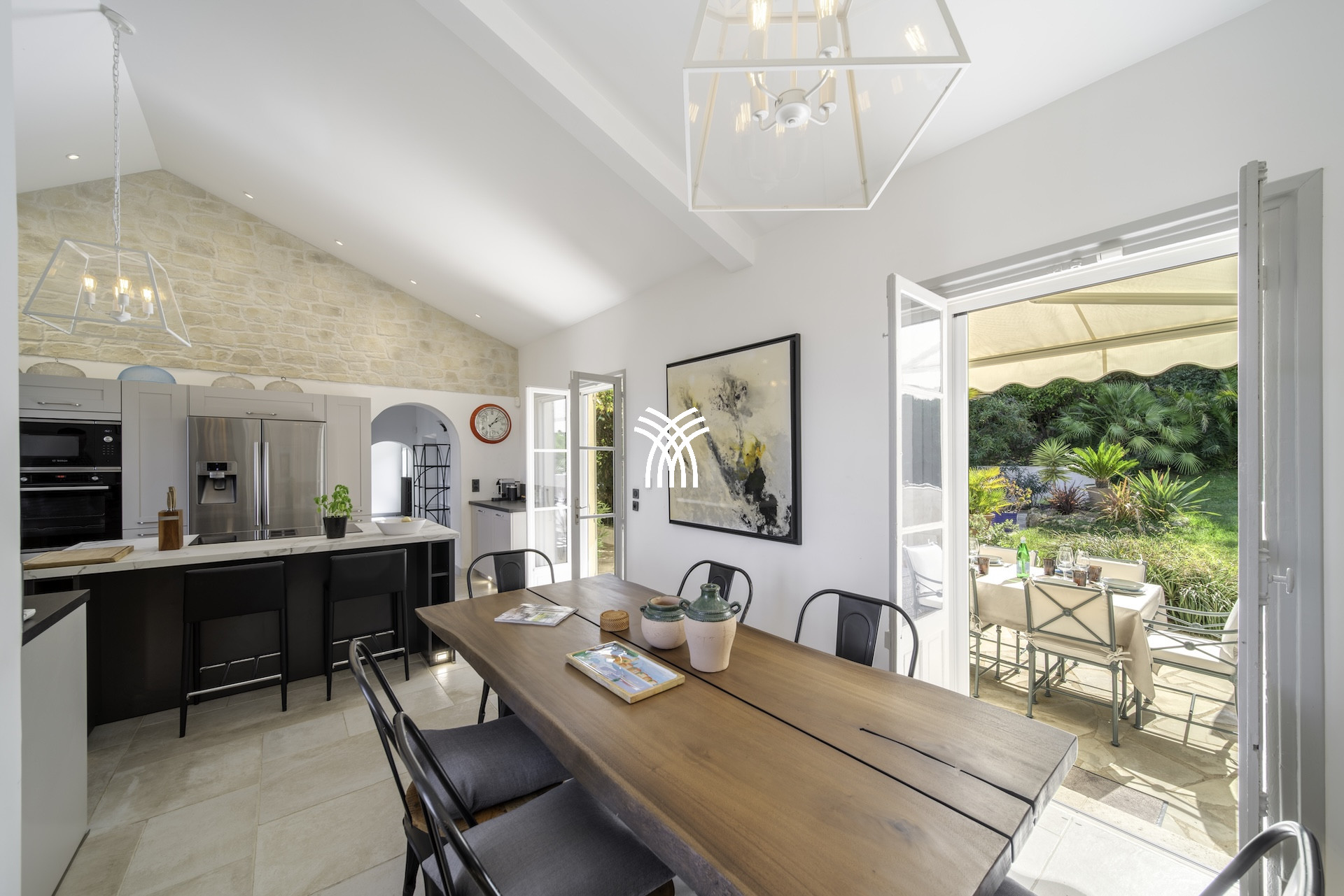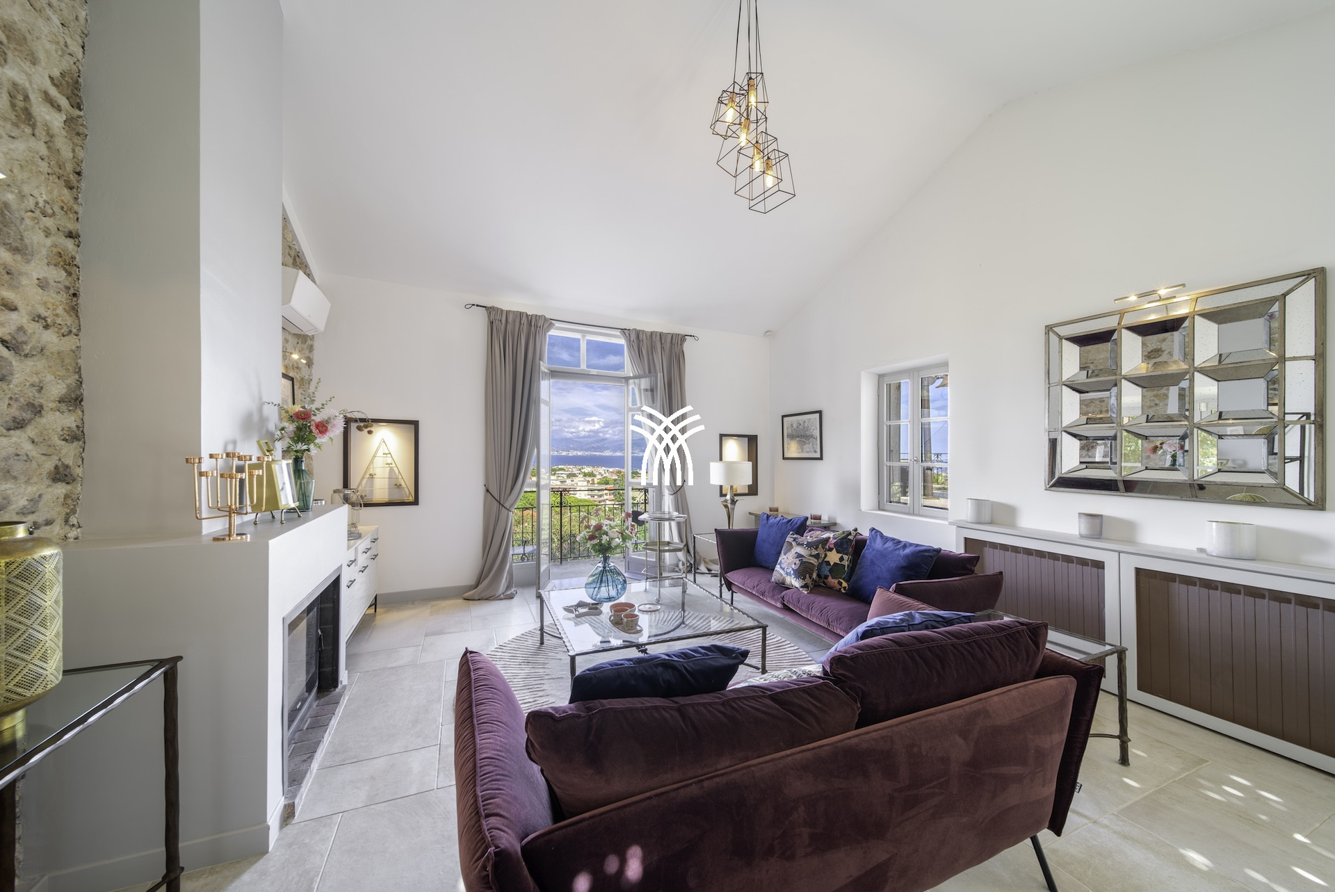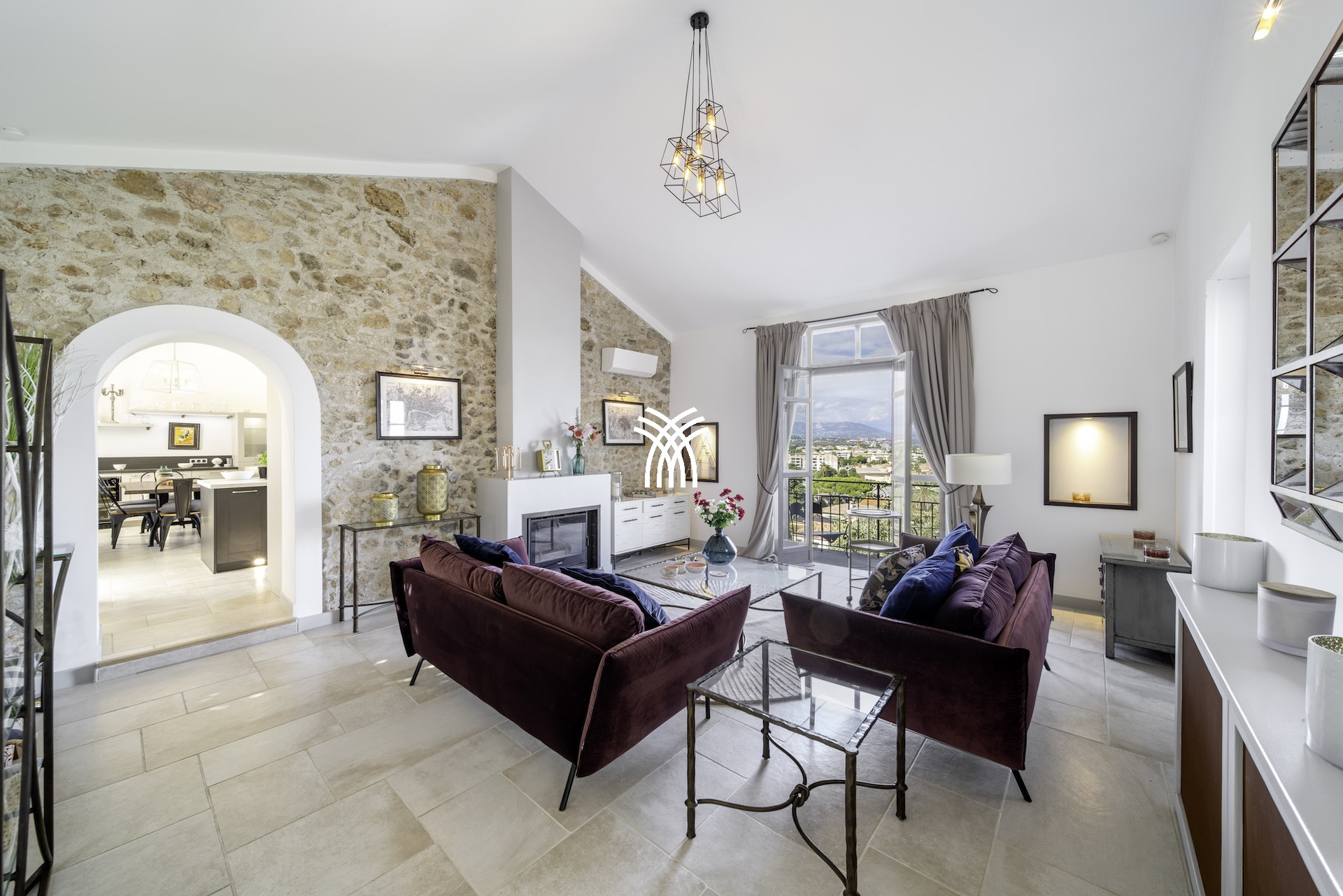 Derrière ses façades en pierres anciennes, la Villa Mayflower dévoile des volumes généreux et une mise en scène intérieure d'une grande sophistication. Le vaste espace de réception, baigné de lumière naturelle, s'ouvre harmonieusement sur les extérieurs grâce à d'imposantes baies vitrées, créant une continuité fluide entre intérieur et paysage méditerranéen. Les matériaux nobles, le mobilier choisi avec soin et les finitions sur mesure confèrent à l'ensemble une signature élégante et intemporelle, à la hauteur des exigences d'une clientèle internationale en quête d'une location de prestige à Antibes.