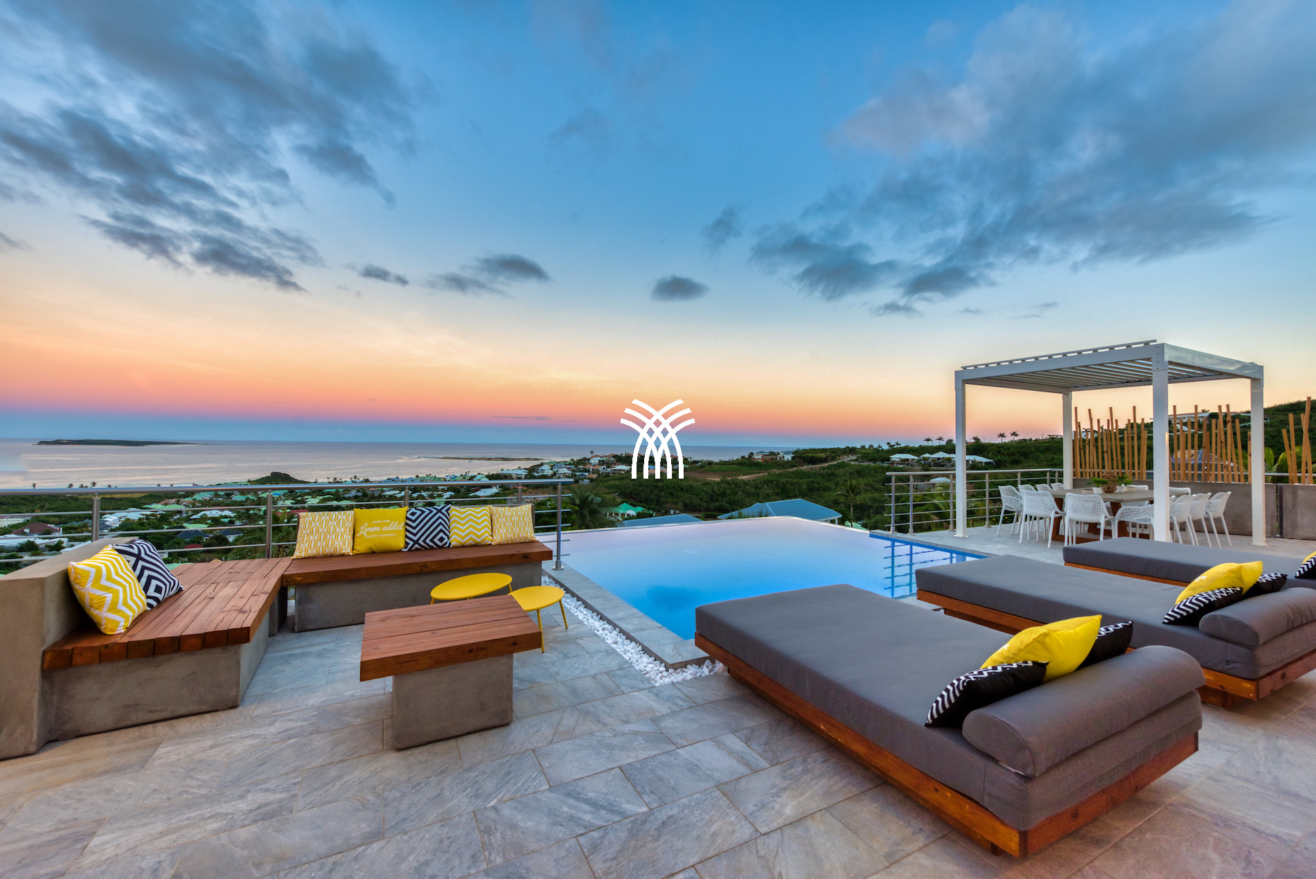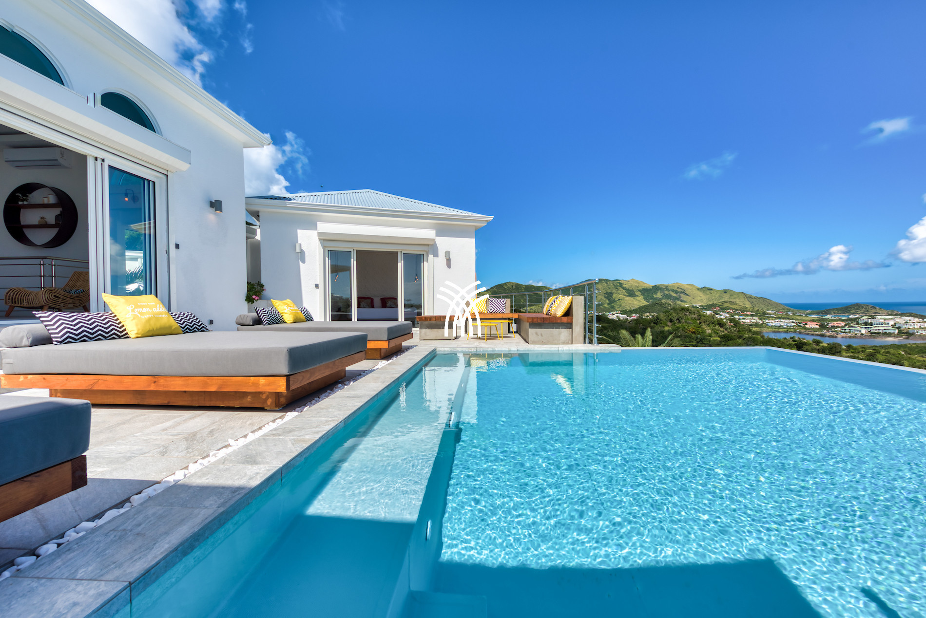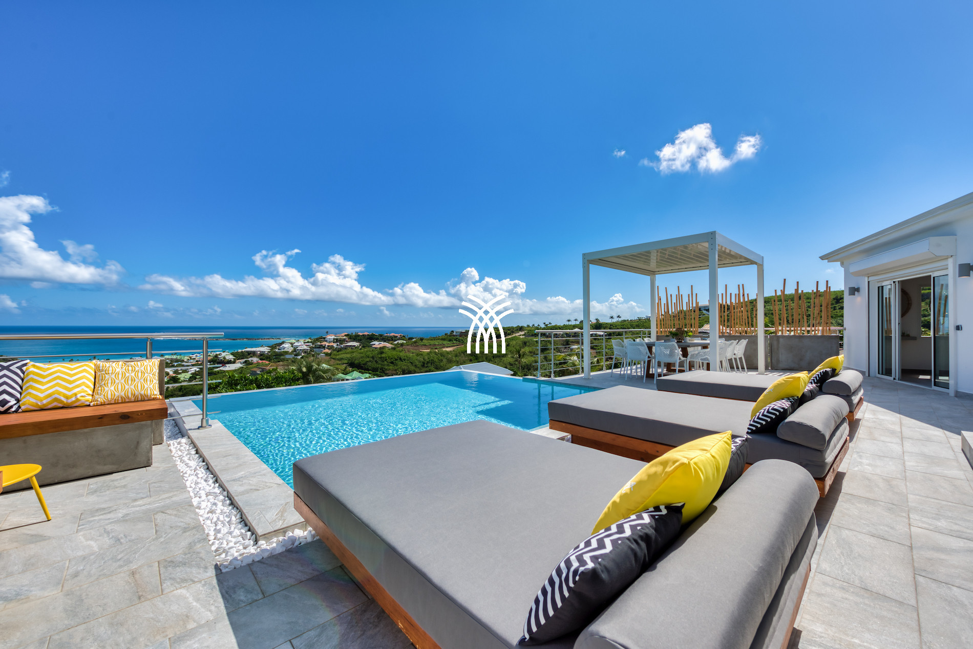 Villa Sunrise St Martin, villa 3 chambres, 3 salles de bains, moderne, située sur les hauteurs de la Baie Orientale vous offre une vue spectaculaire et exceptionnelle sur St Barth, Tintamarre et Pinel.