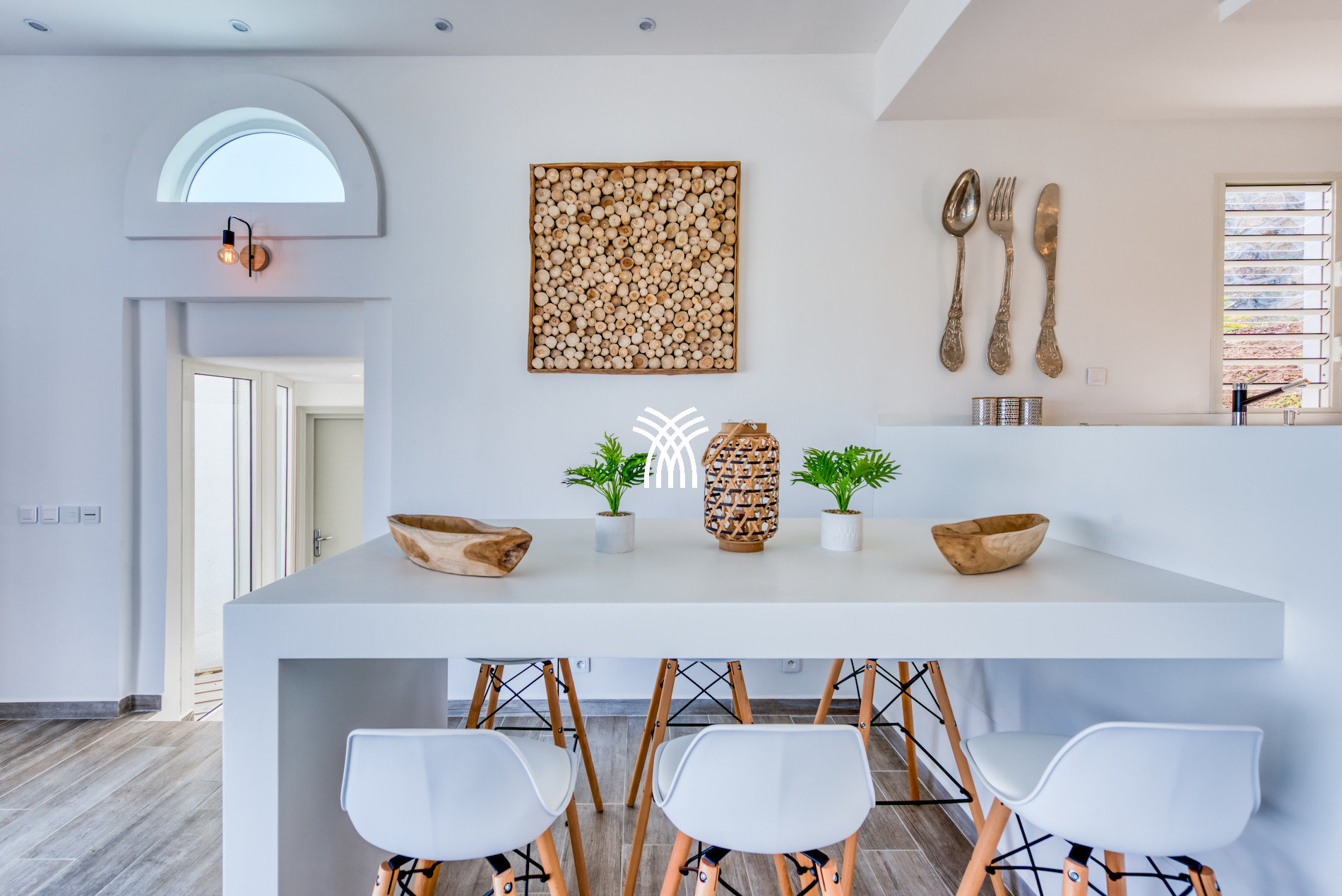 L’espace de vie, spacieux et convivial, s’ouvre sur une terrasse ensoleillée et une piscine privée chauffée (chauffage disponible du 16 décembre au 15 avril), offrant un cadre idyllique pour se détendre face à l’océan. La cuisine haut de gamme est entièrement équipée pour préparer de délicieux repas dans un environnement chic et moderne.