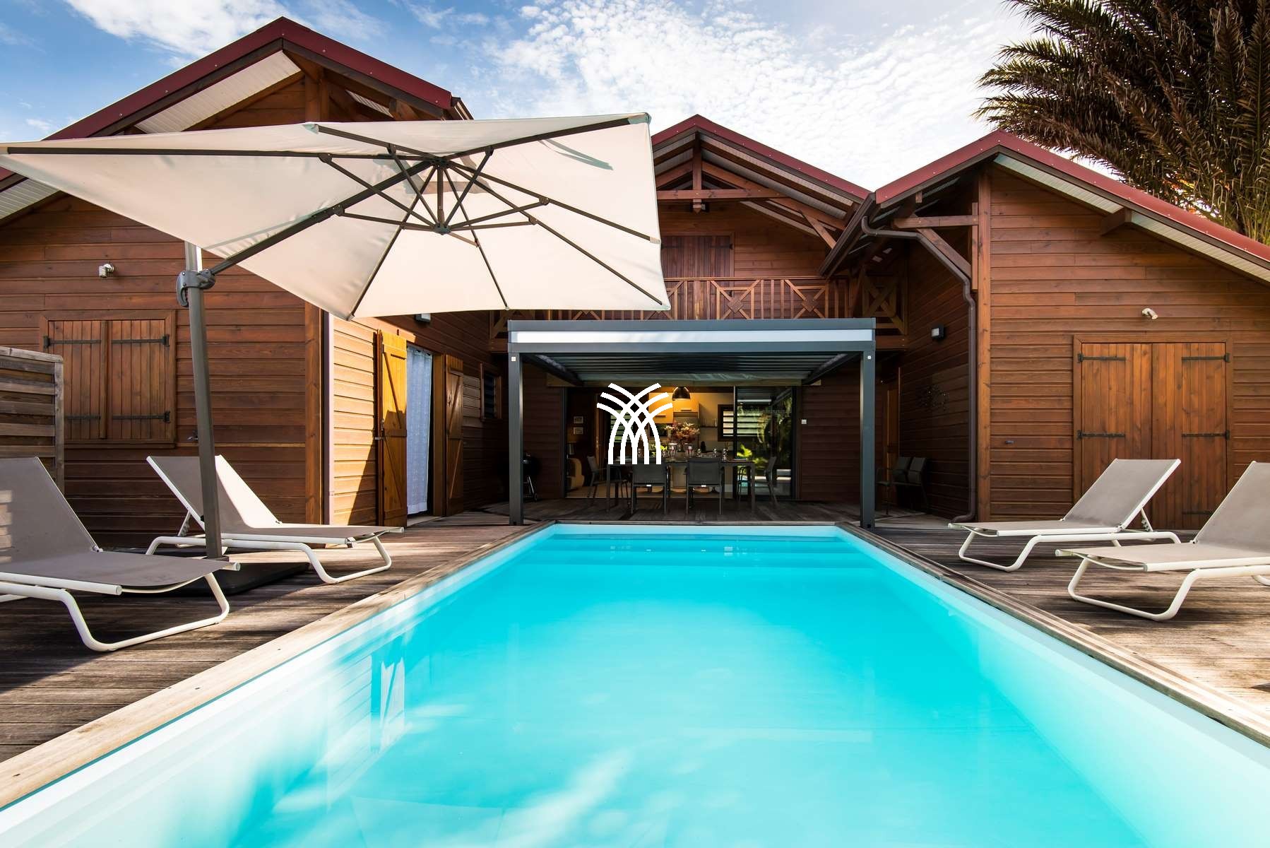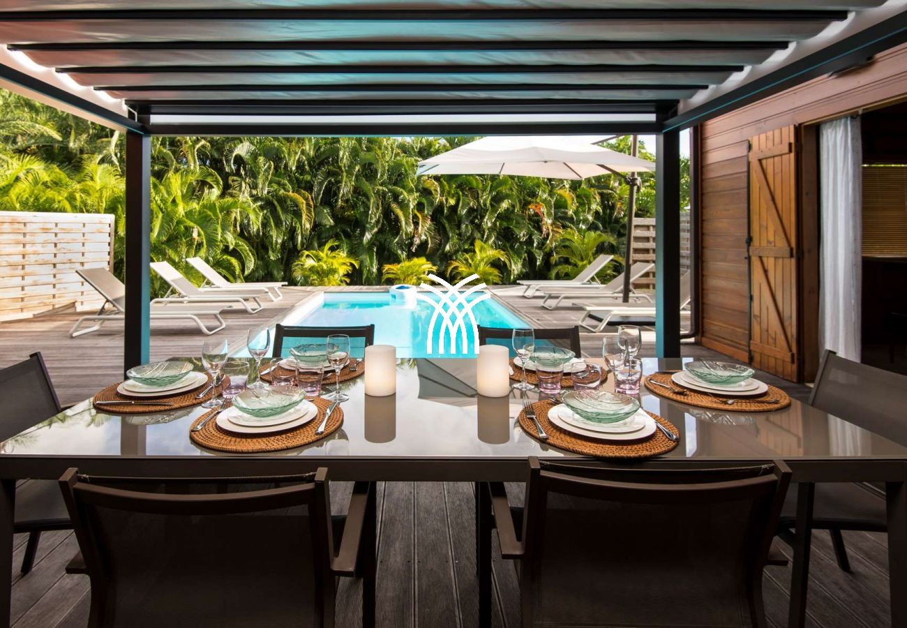 La pièce de vie principale, lumineuse et conviviale, s’ouvre sur une cuisine entièrement équipée, idéale pour explorer les saveurs de la cuisine créole. À l’extérieur, la villa dévoile un espace aménagé qui invite à la détente : une piscine miroir à débordement qui se fond dans l’horizon, des transats pour le farniente et un jardin tropical luxuriant qui encadre cette oasis de tranquillité.