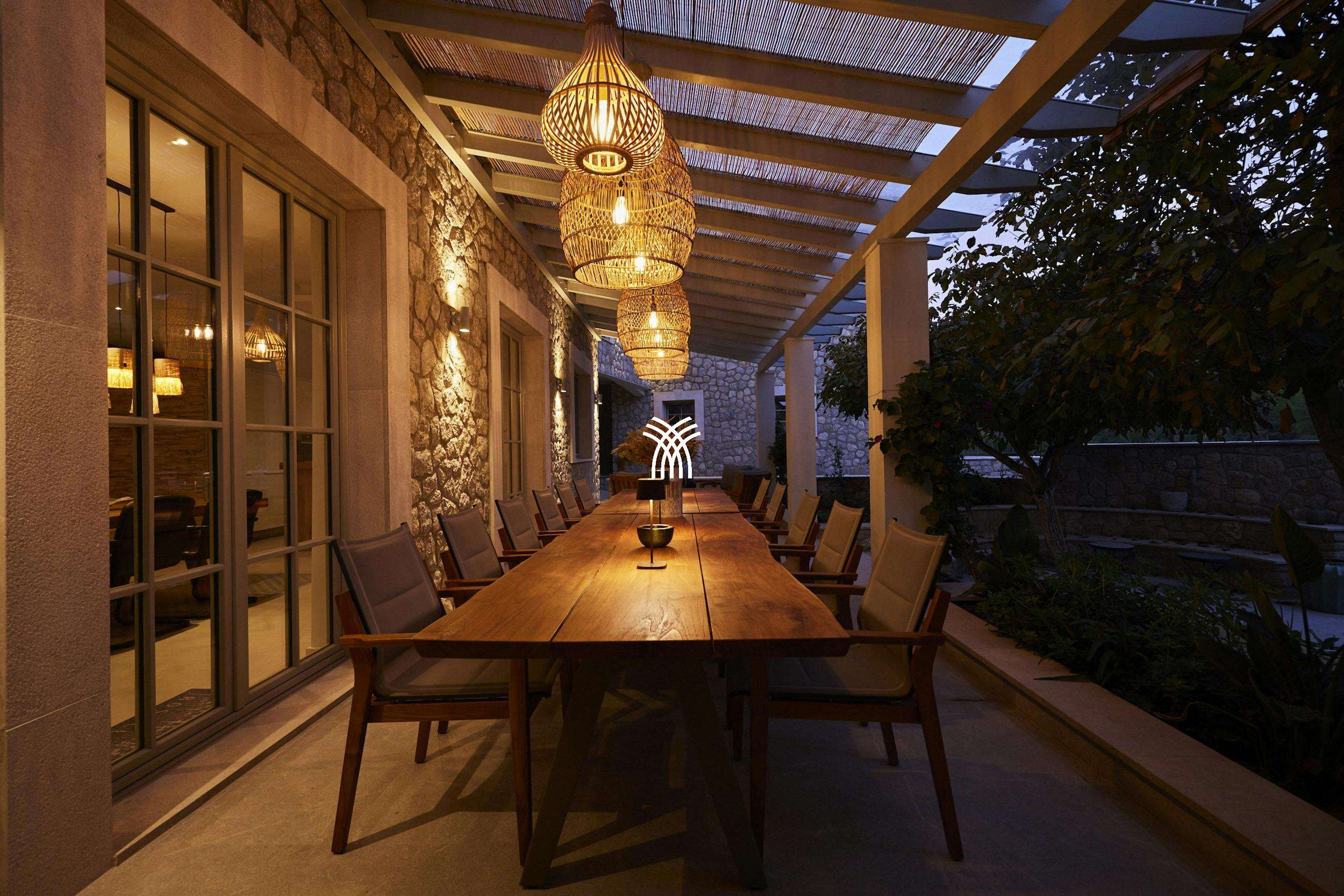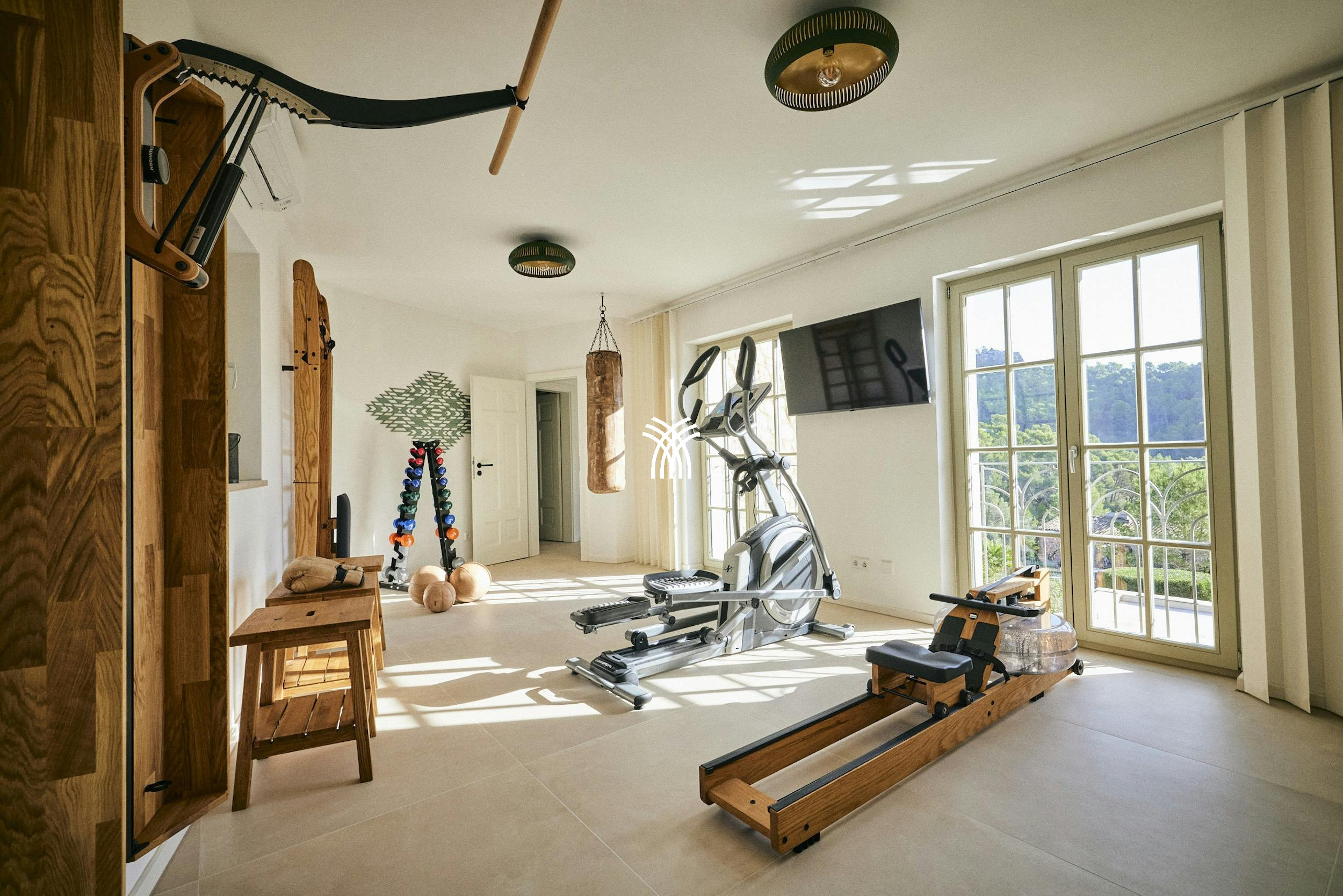 Les équipements intérieurs comprennent une cuisine moderne en plan ouvert avec des appareils haut de gamme, un espace à manger formel pour dix personnes, un salon TV et une salle de fitness avec un sauna. La vie en extérieur est rehaussée par des terrasses spacieuses, une grande piscine et un espace de repas extérieur entièrement équipé avec des sièges pour douze personnes et une cuisine et un grill extérieurs.