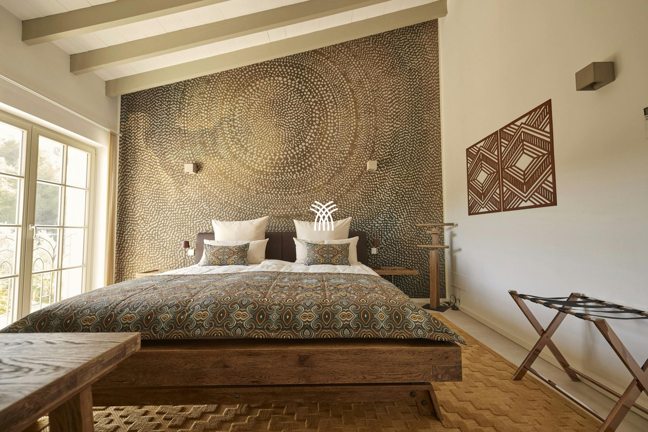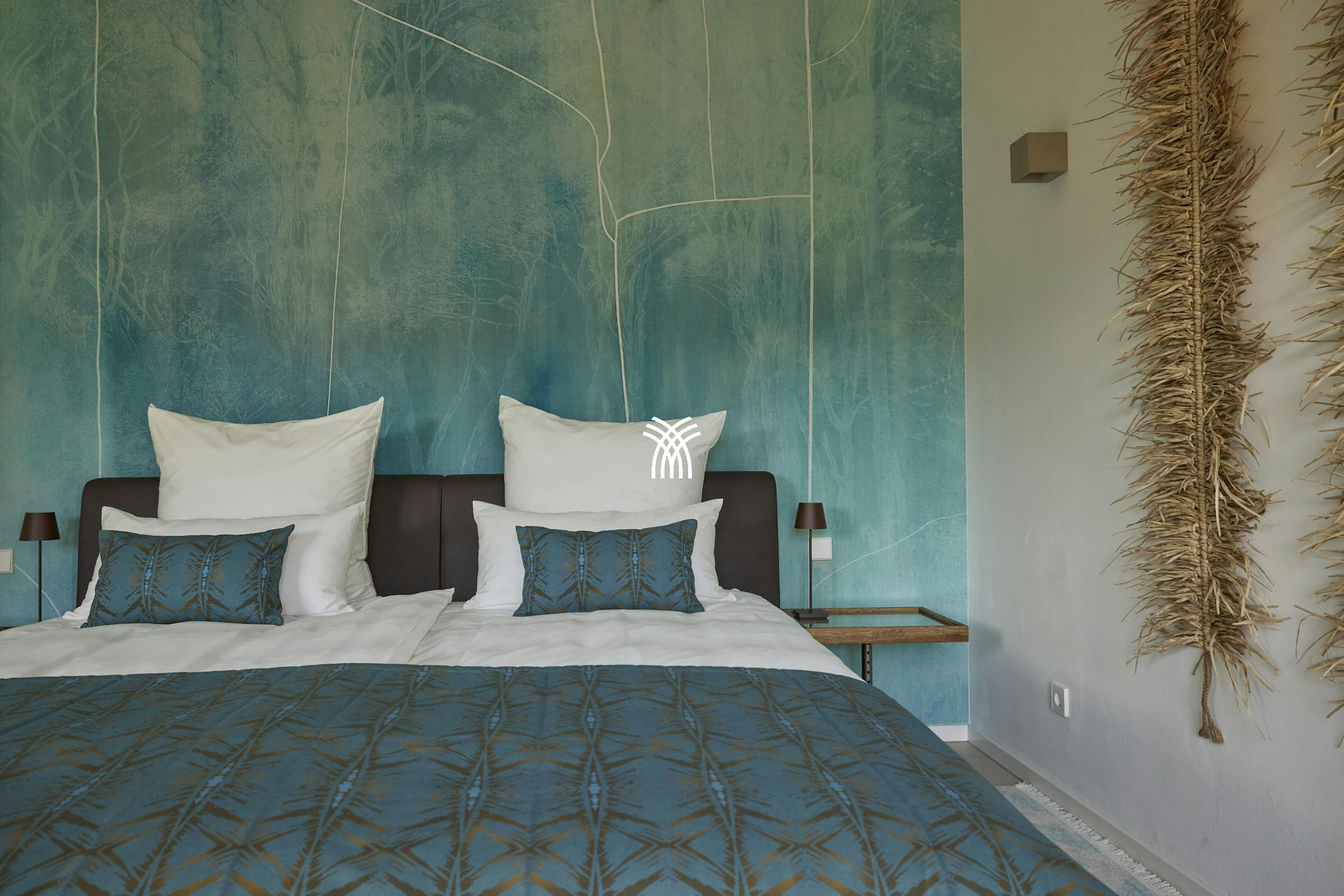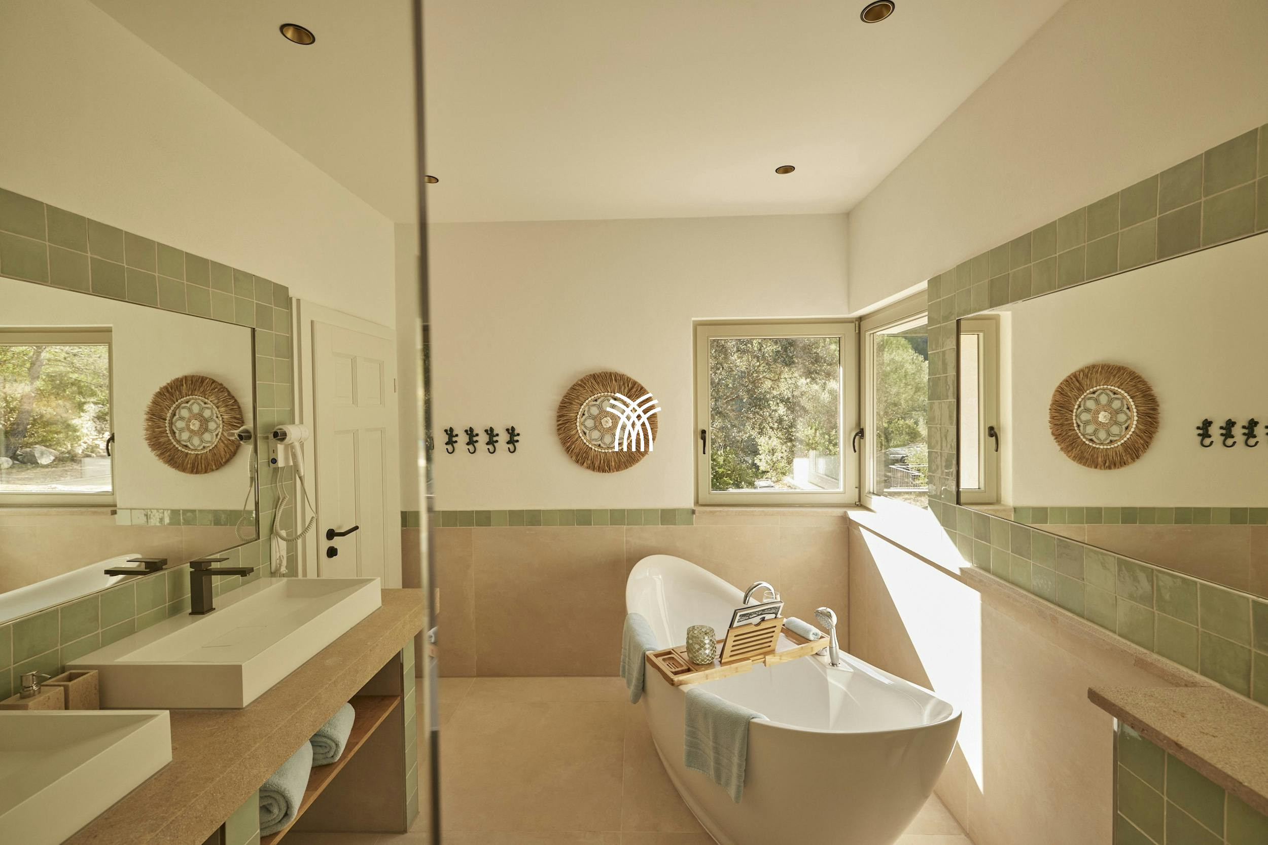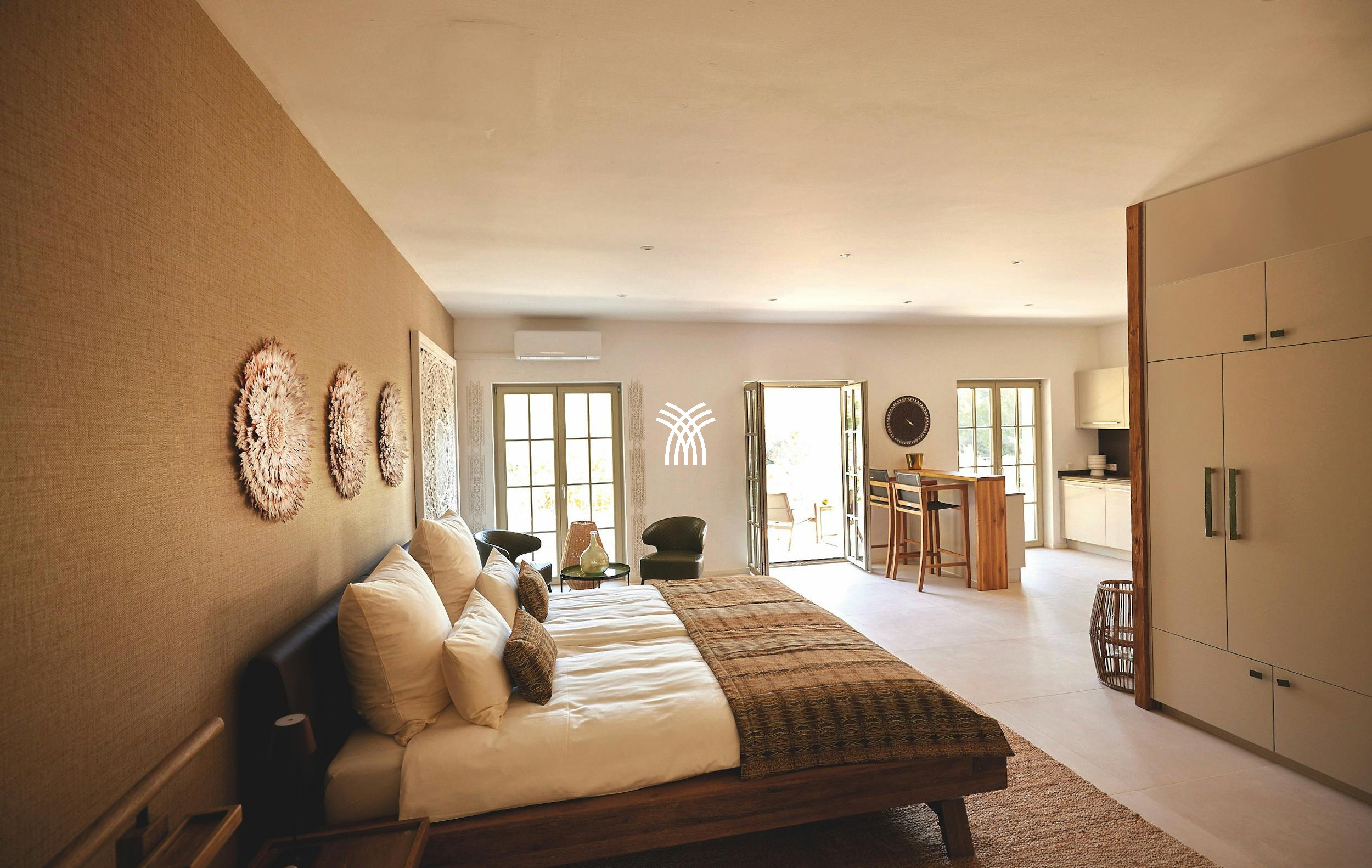 Conçue pour accueillir jusqu'à dix invités dans un confort absolu, la villa dispose de cinq chambres magnifiquement aménagées. Quatre sont situées dans la résidence principale, chacune avec une salle de bain attenante et des équipements de qualité supérieure. Le studio pour invités séparé ajoute une couche supplémentaire de confidentialité avec sa propre salle de bain, sa kitchenette et son coin salon douillet—idéal pour les visiteurs ou la famille élargie. Chaque pièce est décorée avec sophistication, offrant des lits extra-longs, la climatisation et des vues apaisantes.