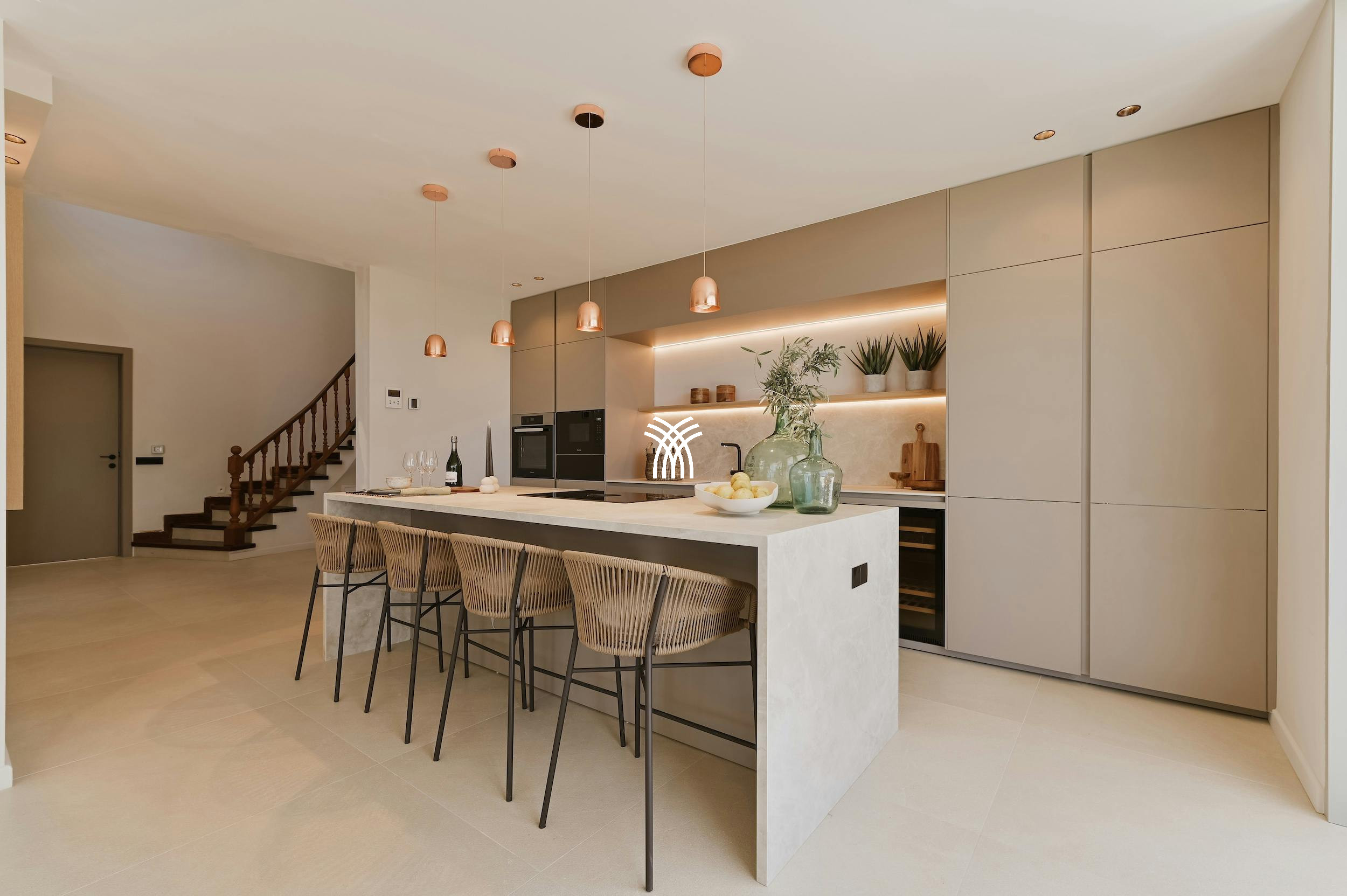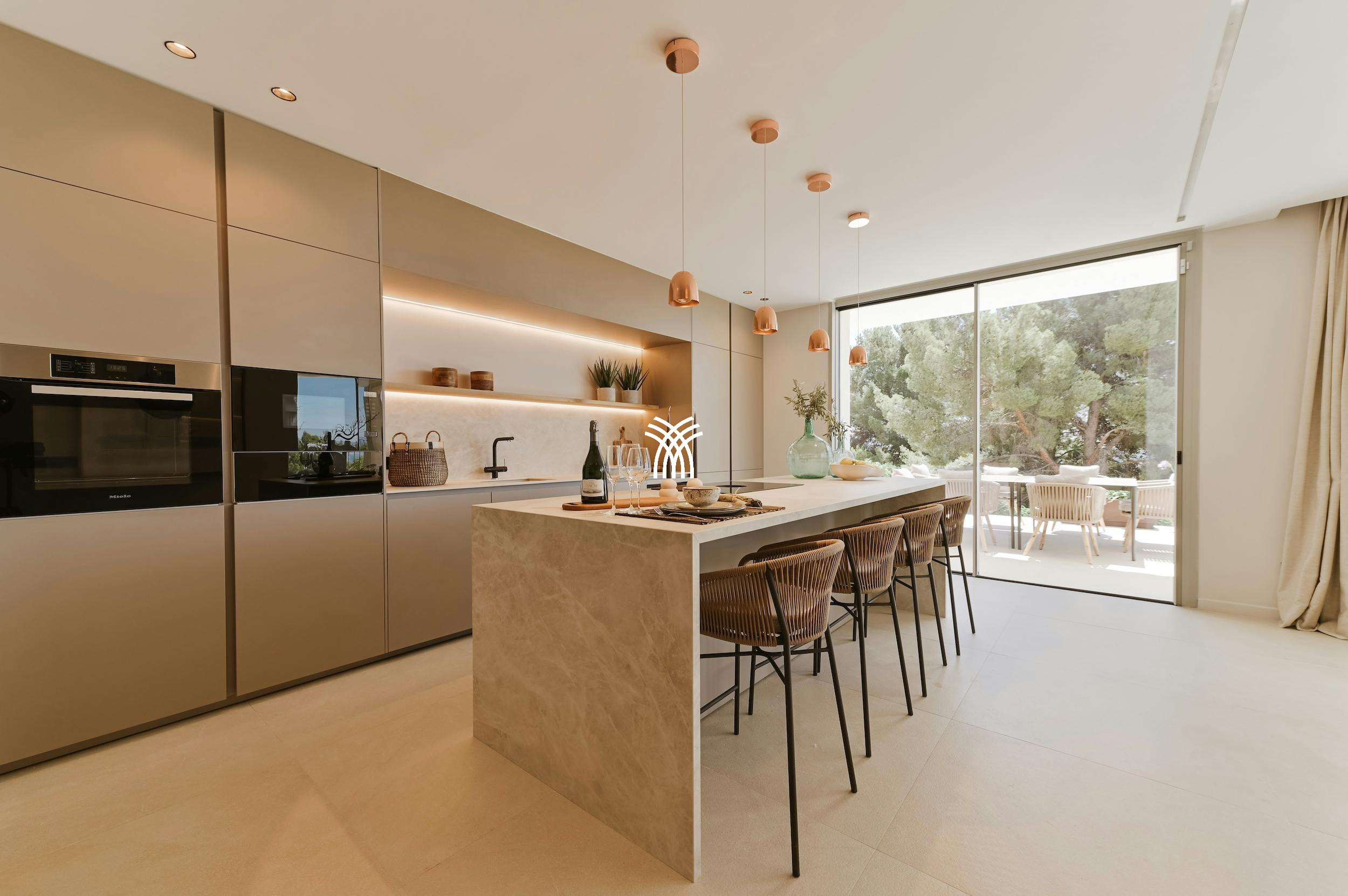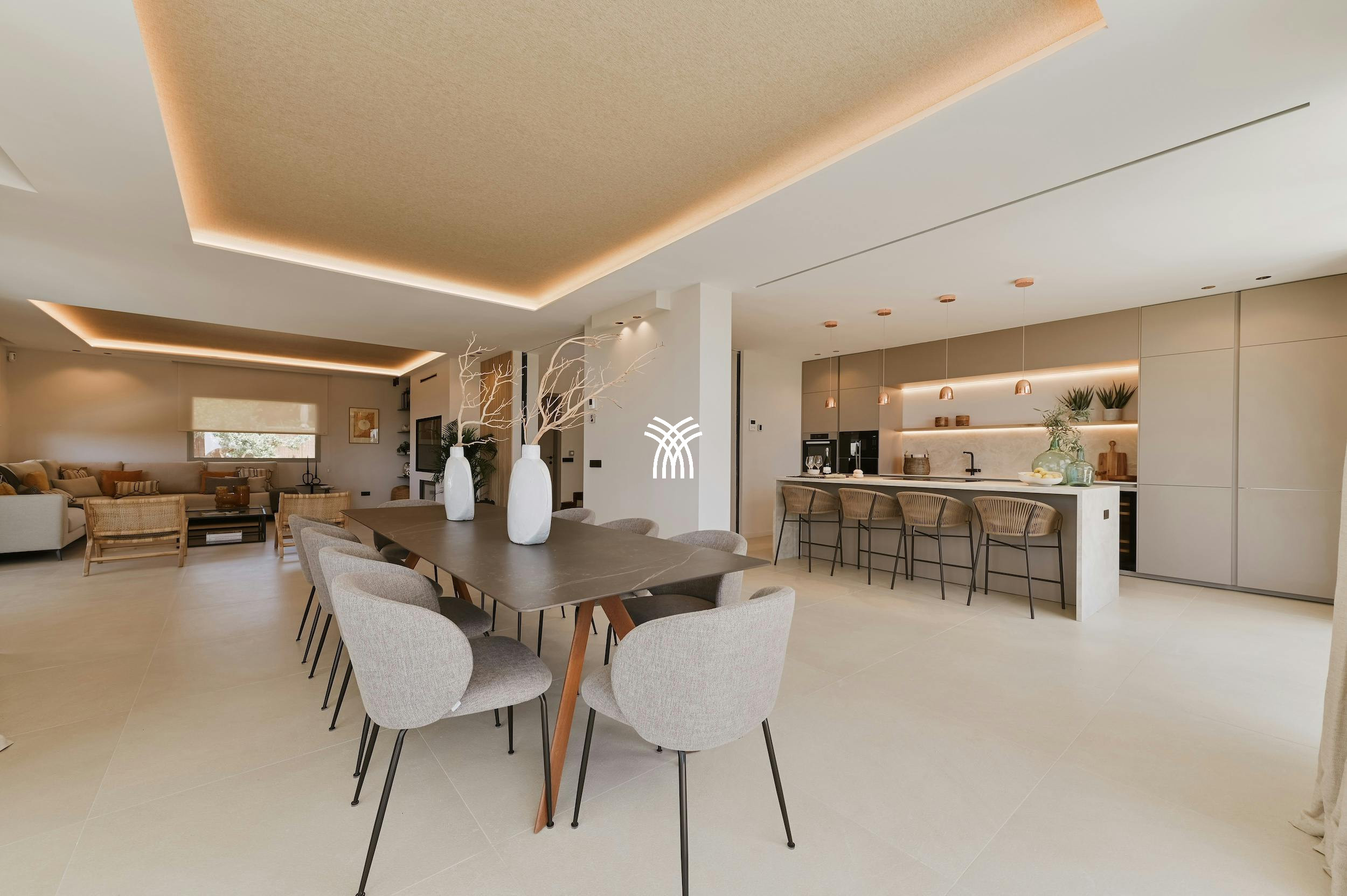 Le cœur de la villa est son espace de vie ouvert qui combine harmonieusement un salon chaleureux avec cheminée, une salle à manger élégante et une cuisine ultramoderne équipée d'appareils haut de gamme et d'un réfrigérateur à vin. Le chauffage au sol dans toute la maison garantit un confort toute l'année, tandis que les fenêtres du sol au plafond laissent entrer la lumière naturelle et s'ouvrent sur la terrasse centrale, meublée de sièges de haute qualité et d'un coin salon tranquille.