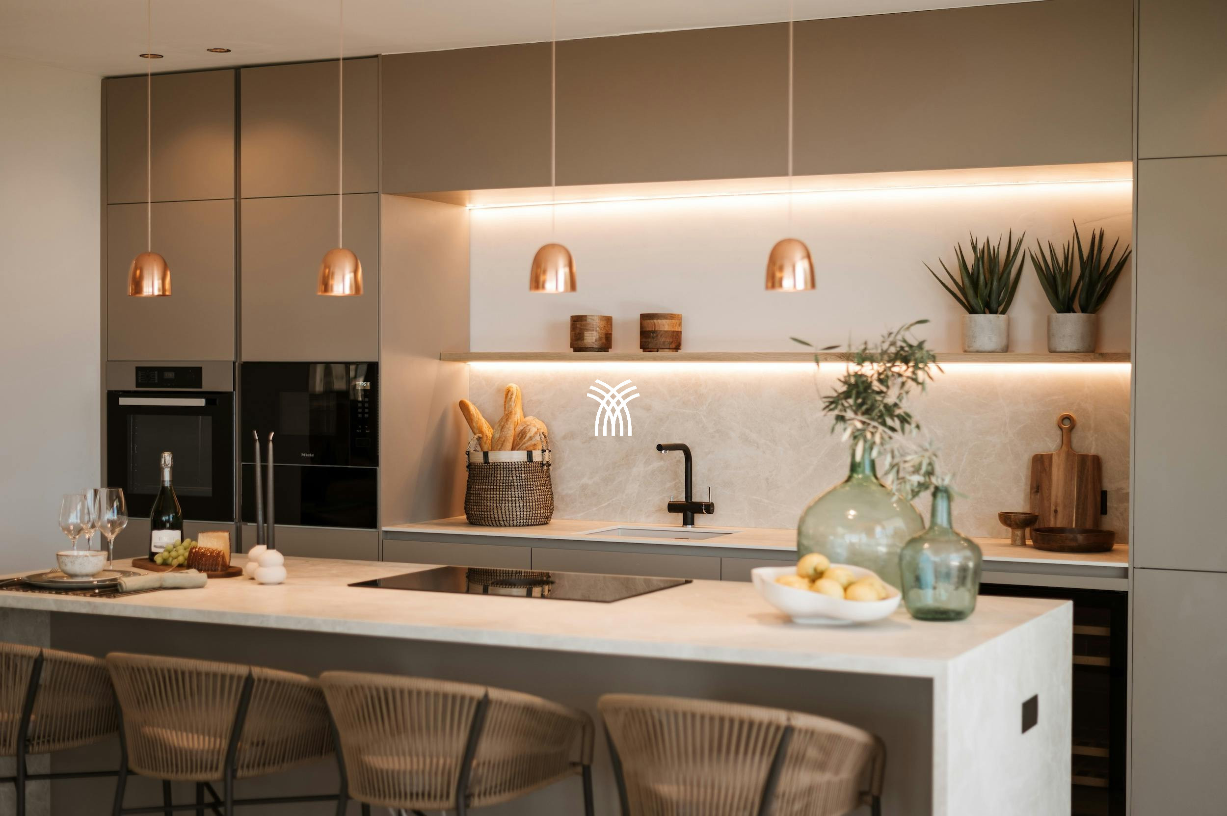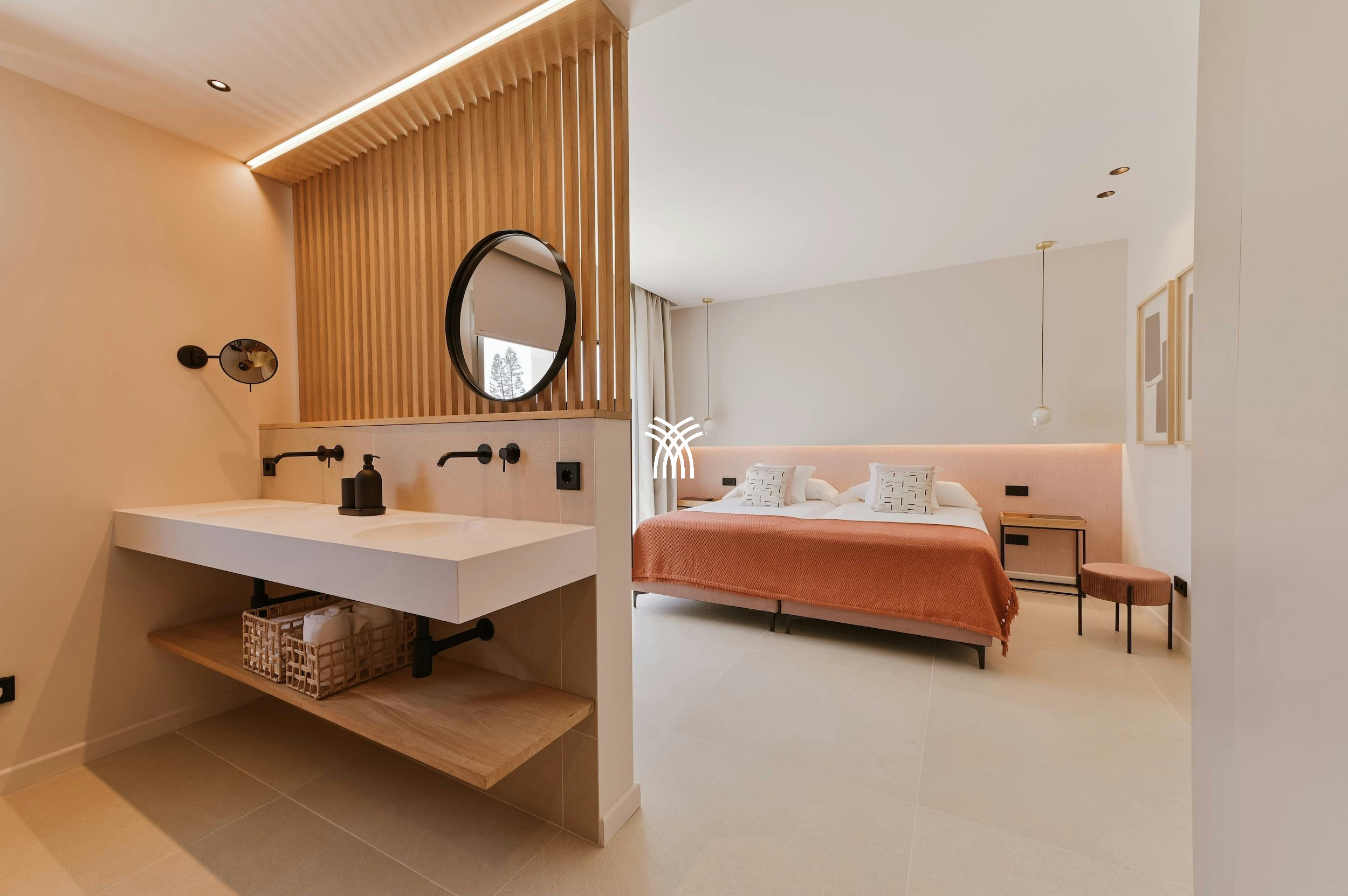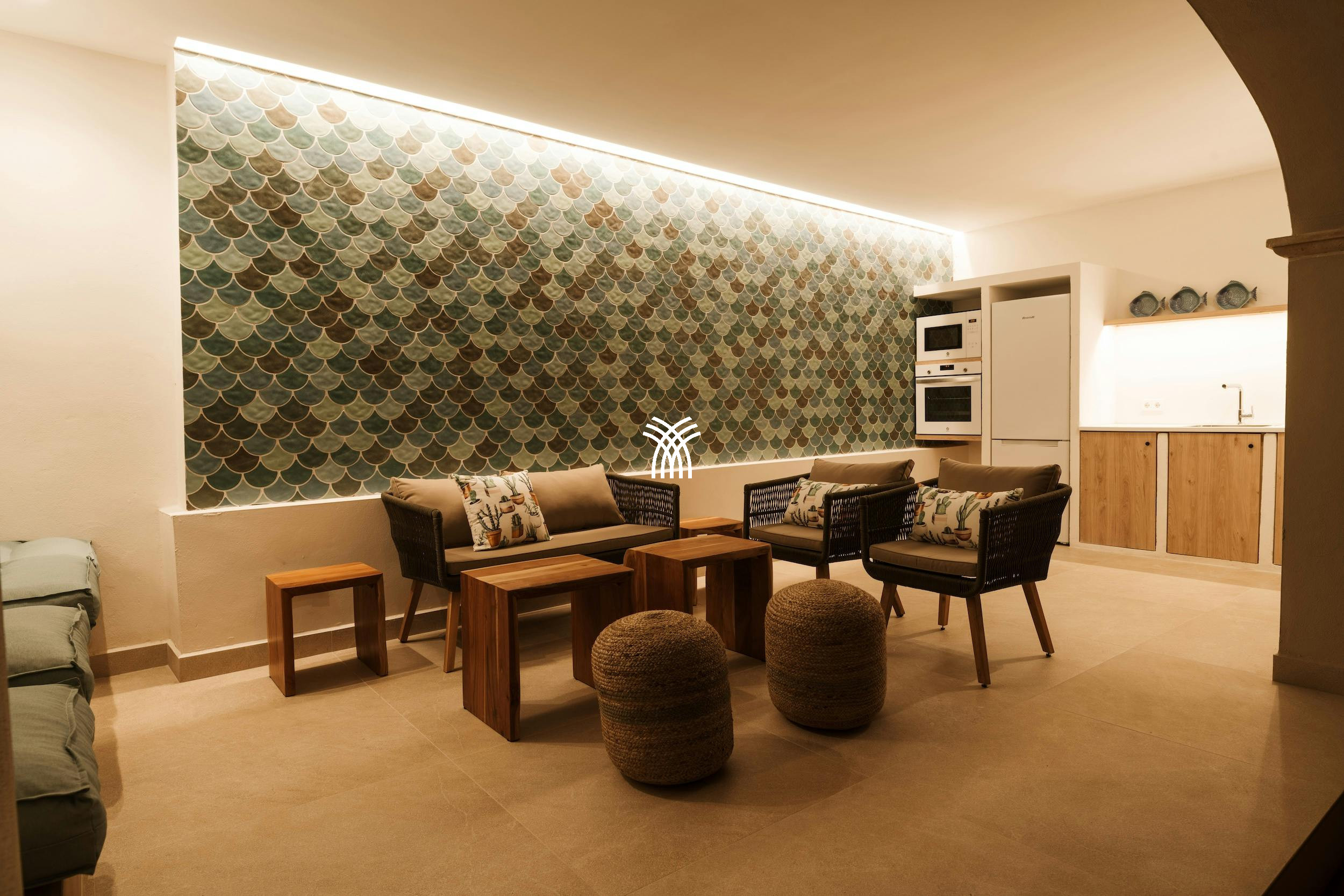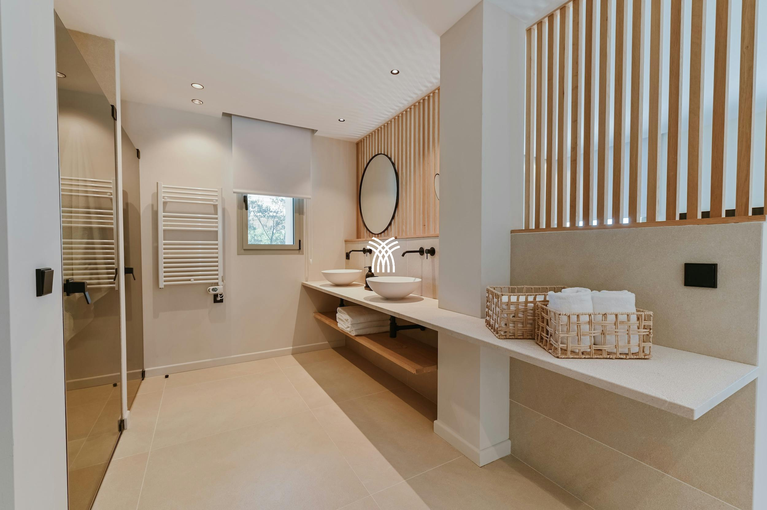 Le cœur de la villa est son espace de vie ouvert qui combine harmonieusement un salon chaleureux avec cheminée, une salle à manger élégante et une cuisine ultramoderne équipée d'appareils haut de gamme et d'un réfrigérateur à vin. Le chauffage au sol dans toute la maison garantit un confort toute l'année, tandis que les fenêtres du sol au plafond laissent entrer la lumière naturelle et s'ouvrent sur la terrasse centrale, meublée de sièges de haute qualité et d'un coin salon tranquille.