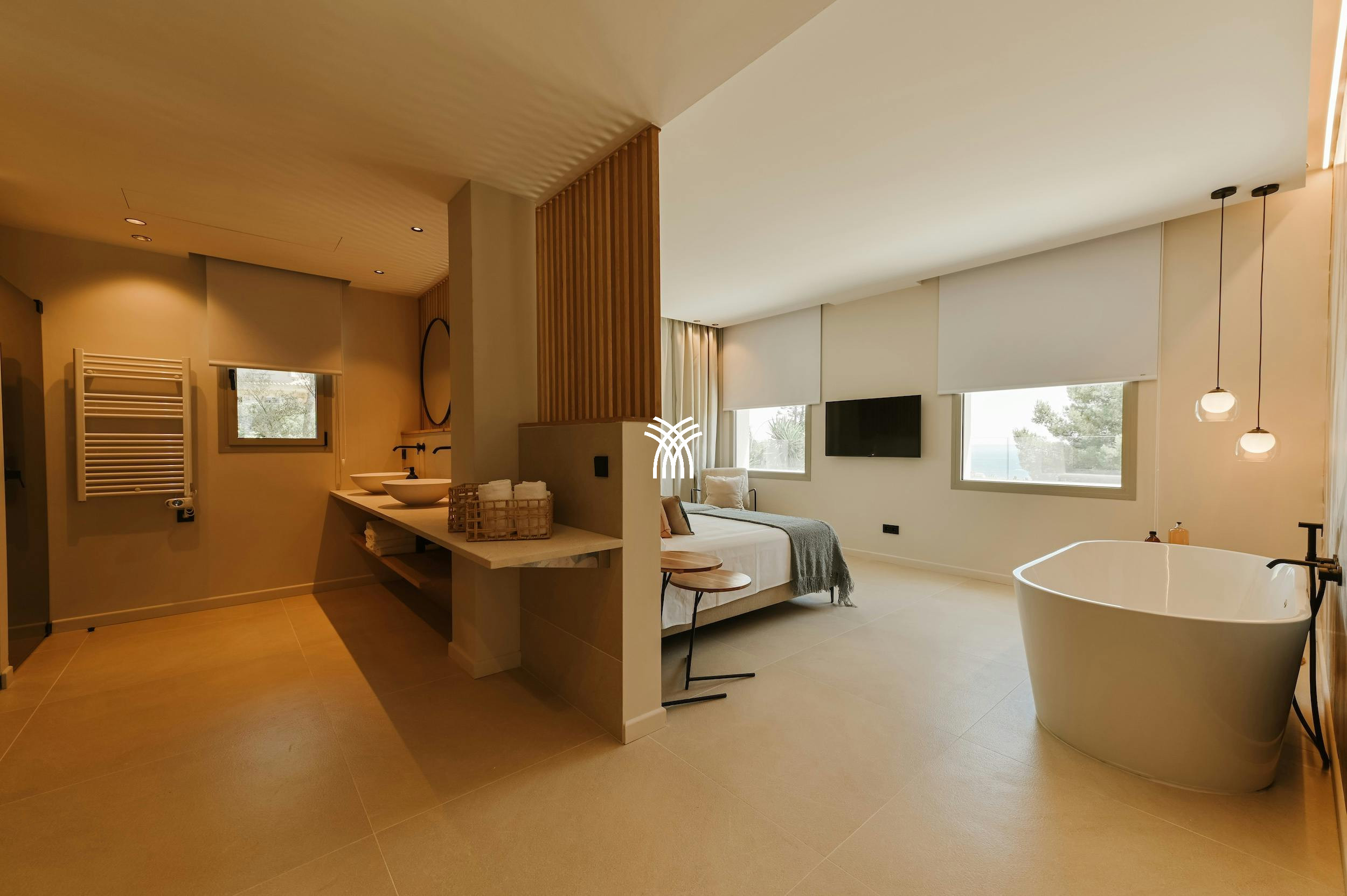 La Villa Hosefina propose six chambres magnifiquement aménagées sur deux niveaux. Le rez-de-chaussée abrite trois chambres, dont une chambre polyvalente avec canapé-lit et poste de travail, une suite spacieuse avec salle de bain attenante, et un espace confortable idéal pour le personnel ou une nounou. À l'étage, trois autres chambres offrent chacune un accès à une terrasse privée, des salles de bain attenantes luxueuses avec douche à effet pluie, et des vues impressionnantes. La suite principale comprend en plus une baignoire îlot et un salon privé avec télévision et espace de travail.