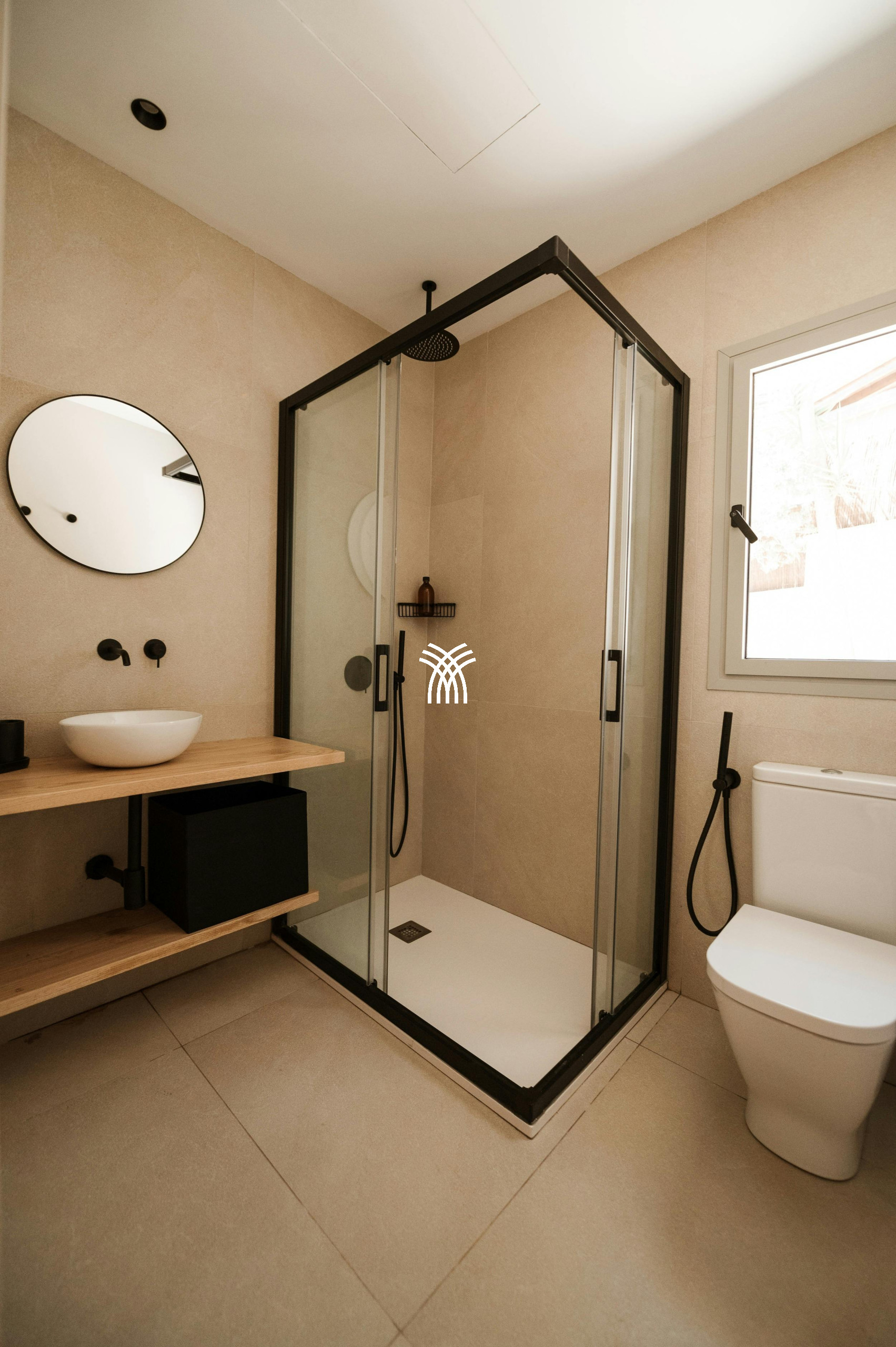 Au sommet de la villa, la terrasse supérieure est un sanctuaire pour les amateurs de soleil, offrant des transats confortables, un balanceur style Hollywood, une zone de détente et une deuxième douche équipée d'un jacuzzi—le tout entouré de vues panoramiques sur la Méditerranée.