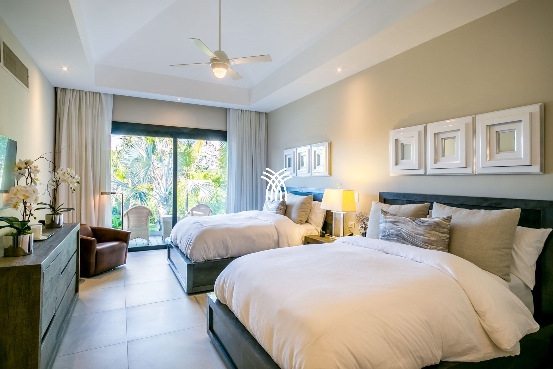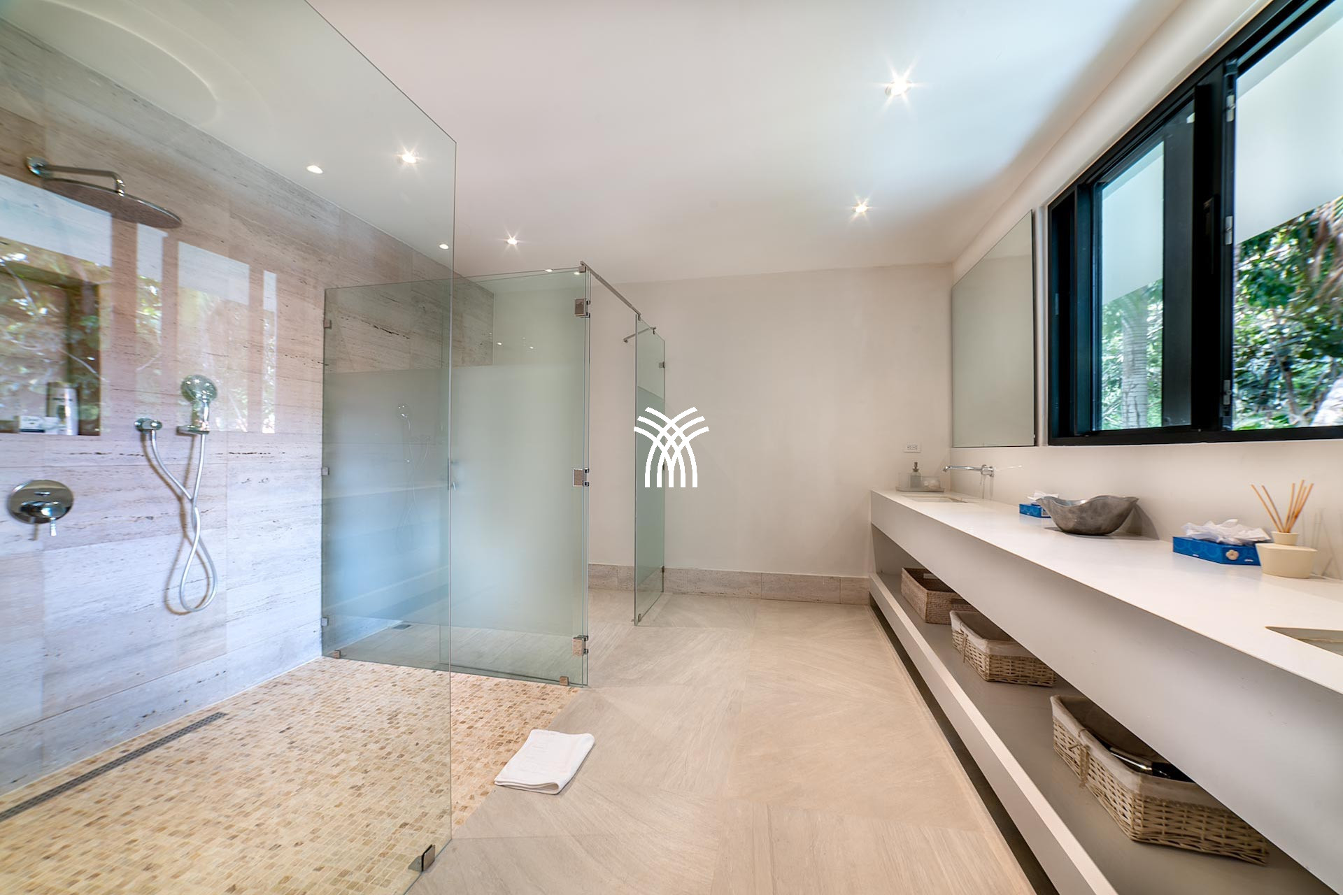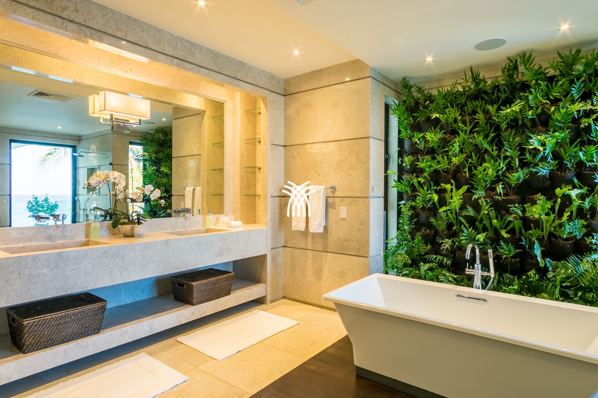 La suite parentale face à l’océan offre une expérience hors du commun : un lit king-size, un coin salon intimiste, une terrasse panoramique, et une salle de bain où un mur végétal, une baignoire profonde et une douche ouverte laissent entrer la brise marine. À l’étage, la suite principale révèle une vue océanique jusque depuis la douche vitrée. Deux chambres d’amis avec vue mer disposent chacune de deux lits queen et de salles de bain baignoire pour prolonger le confort. Une chambre pour enfants avec lits superposés pleine grandeur et une autre chambre donnant sur le jardin complètent ce sanctuaire familial.