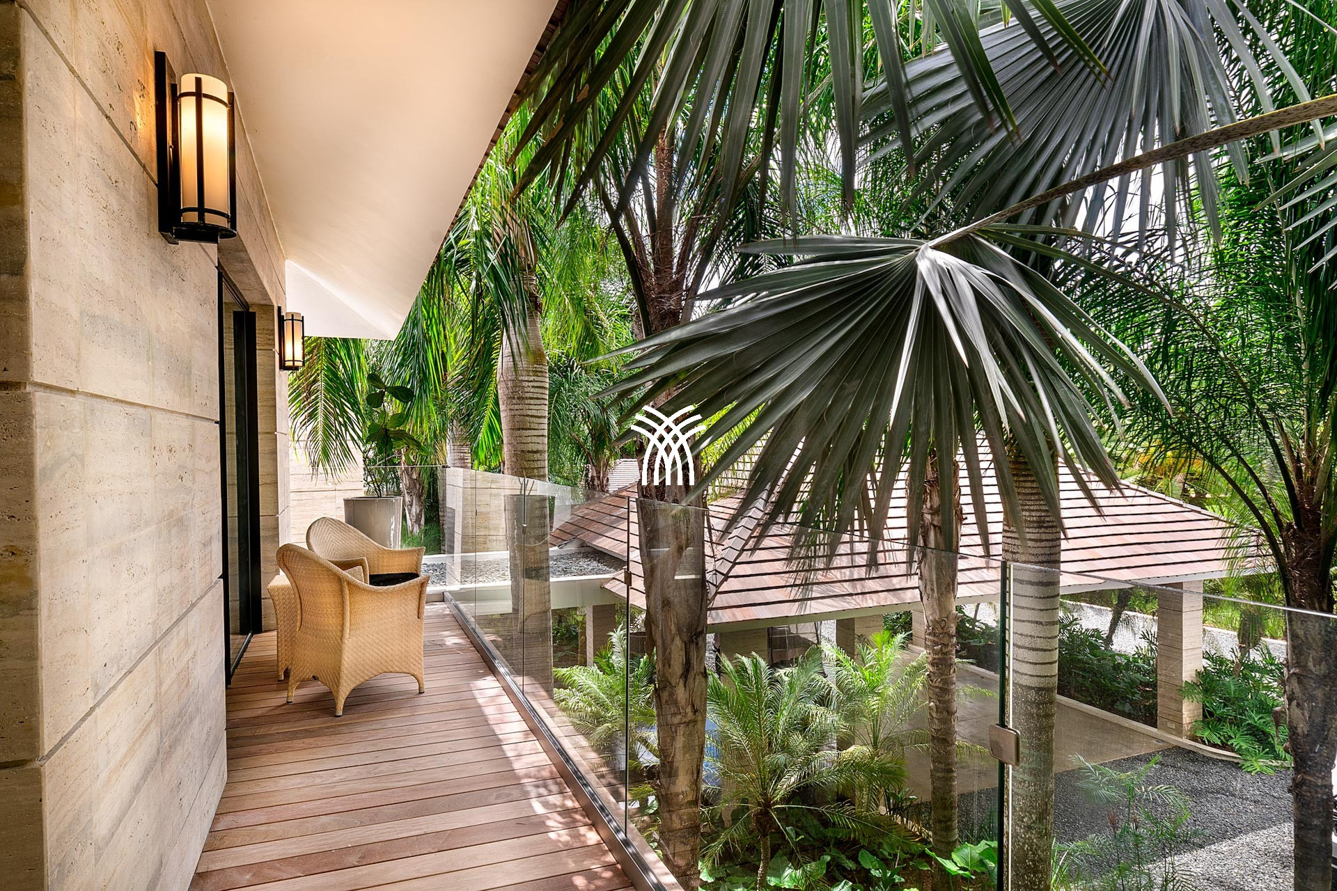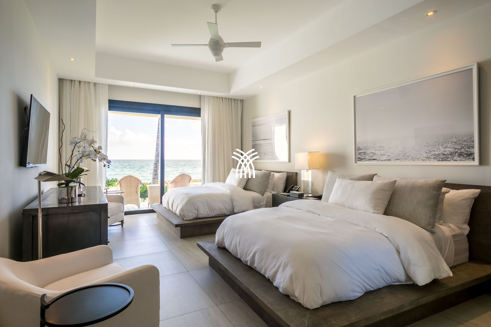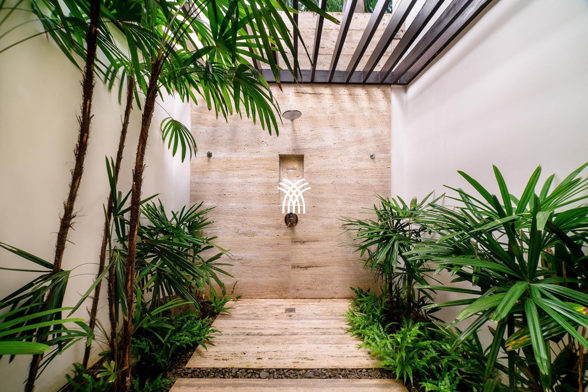 La suite parentale face à l’océan offre une expérience hors du commun : un lit king-size, un coin salon intimiste, une terrasse panoramique, et une salle de bain où un mur végétal, une baignoire profonde et une douche ouverte laissent entrer la brise marine. À l’étage, la suite principale révèle une vue océanique jusque depuis la douche vitrée. Deux chambres d’amis avec vue mer disposent chacune de deux lits queen et de salles de bain baignoire pour prolonger le confort. Une chambre pour enfants avec lits superposés pleine grandeur et une autre chambre donnant sur le jardin complètent ce sanctuaire familial.