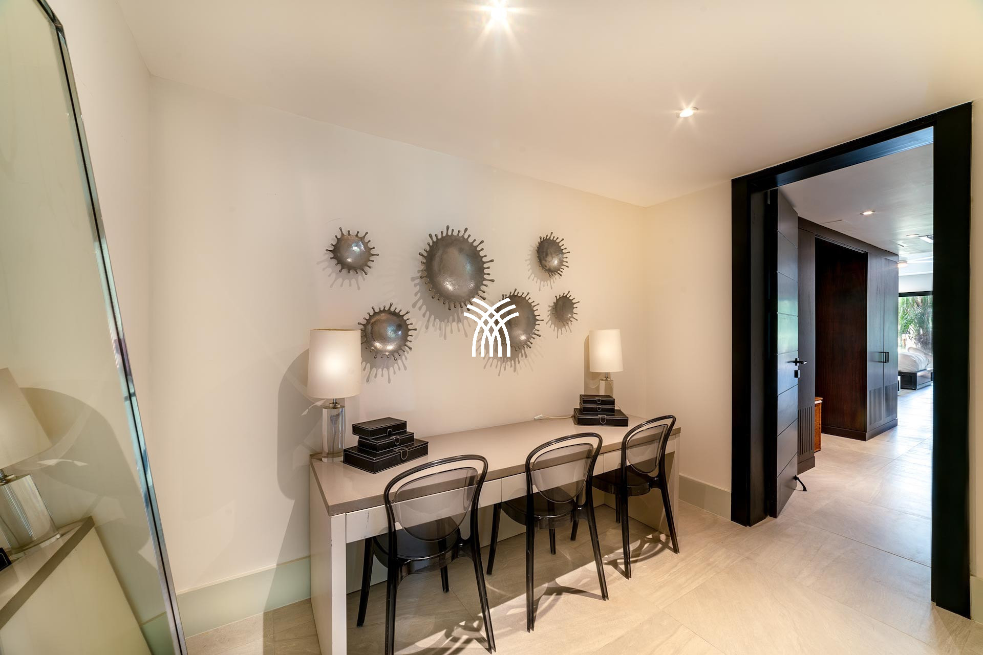 À l’extérieur, la villa multiplie les espaces de vie : dîner sous les étoiles grâce à la salle à manger extérieure, partager un verre autour de la piscine à débordement ou se détendre dans le jardin exotique bercé par les alizés. Un chef privé, des femmes de ménage et un serveur attitré veillent au moindre détail, tandis qu’un service de conciergerie exclusif propose des transferts en voiture de luxe, des croisières en yacht privé, des cours de yoga sur la terrasse, des massages à la villa et bien plus encore.