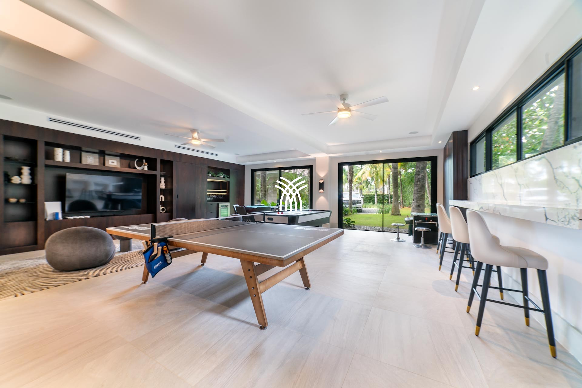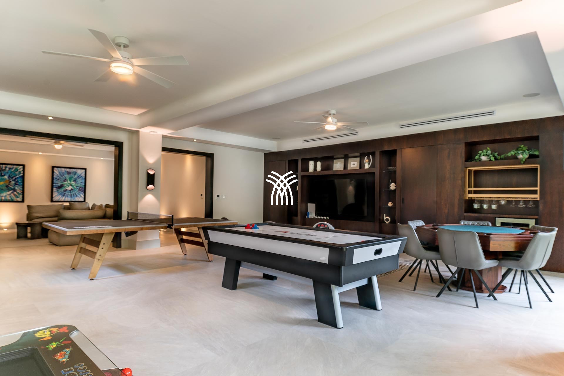 La salle à manger formelle dégage un charme contemporain, rehaussé par un bar intégré et un refroidisseur à vin de mur à mur qui invite à des soirées festives et à des conversations intimes. Deux salles multimédia dédiées offrent des espaces confortables pour le divertissement, tandis qu'un bureau privé offre un refuge tranquille pour les invités qui recherchent un équilibre entre loisirs et productivité.