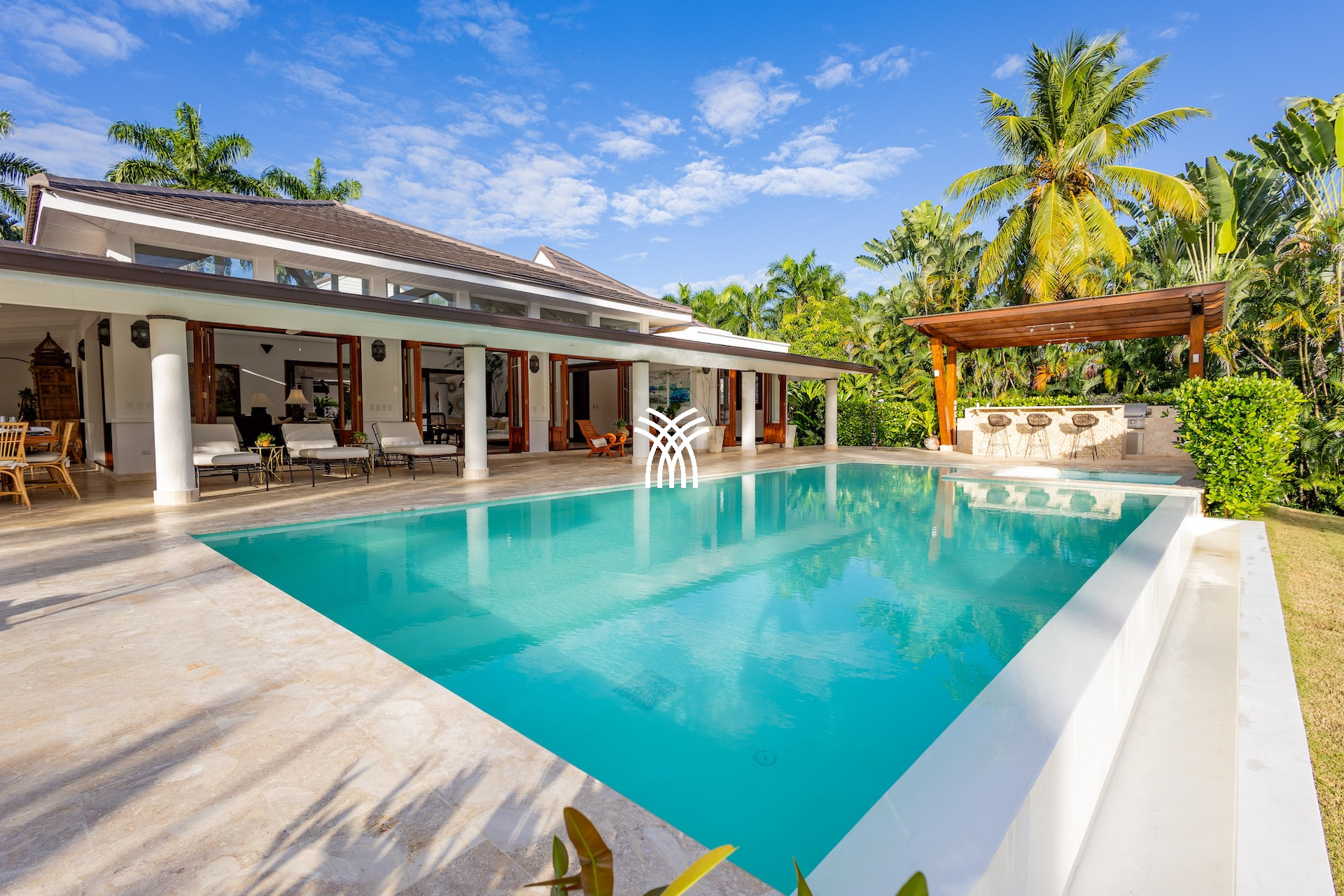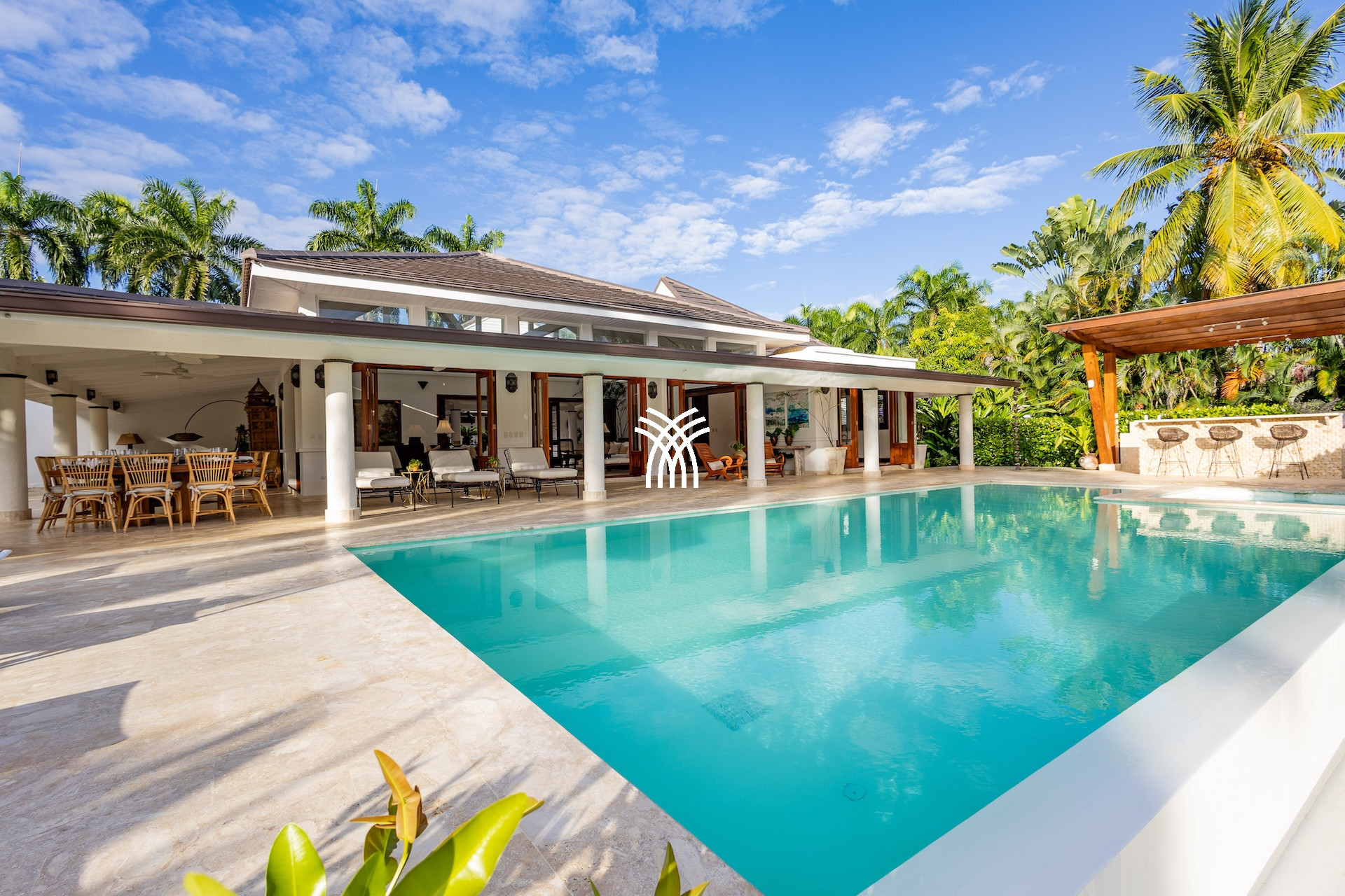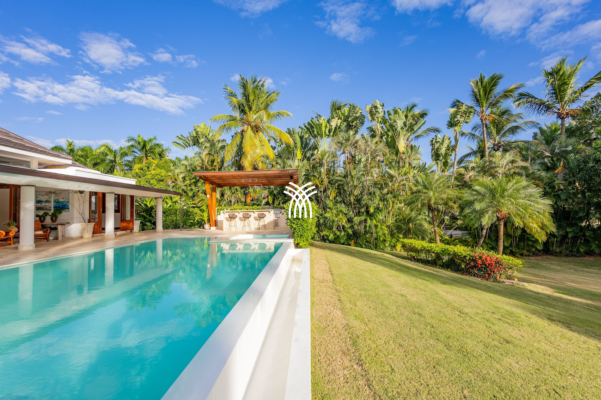 À l’extérieur, Casa Bliss révèle son âme de retraite chic : une piscine à débordement scintille au milieu d’un jardin verdoyant, bordée d’une terrasse couverte et d’un bar extérieur propice aux apéritifs prolongés. Ici, chaque instant se savoure : un cocktail au bord de l’eau, un dîner al fresco sous les palmiers ou une sieste à l’ombre, bercée par les alizés.