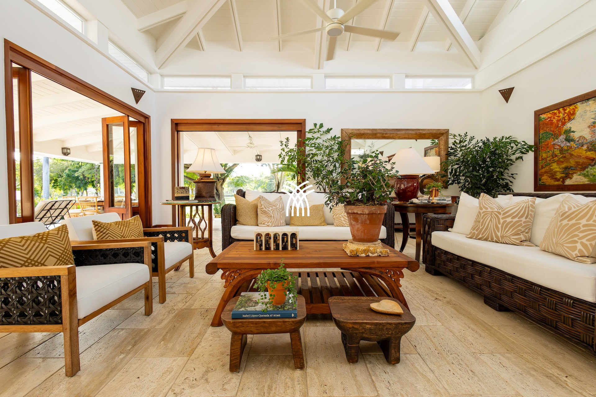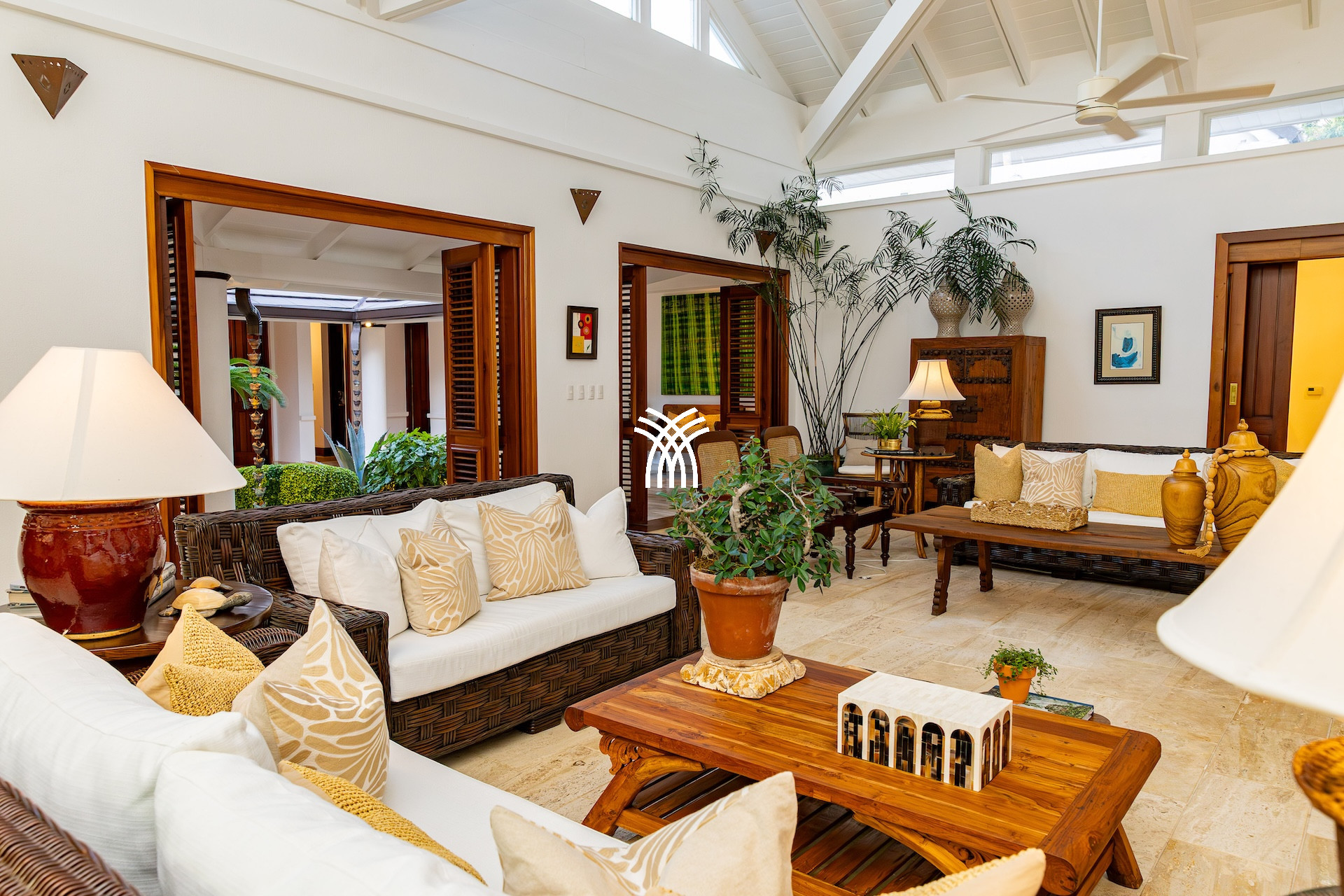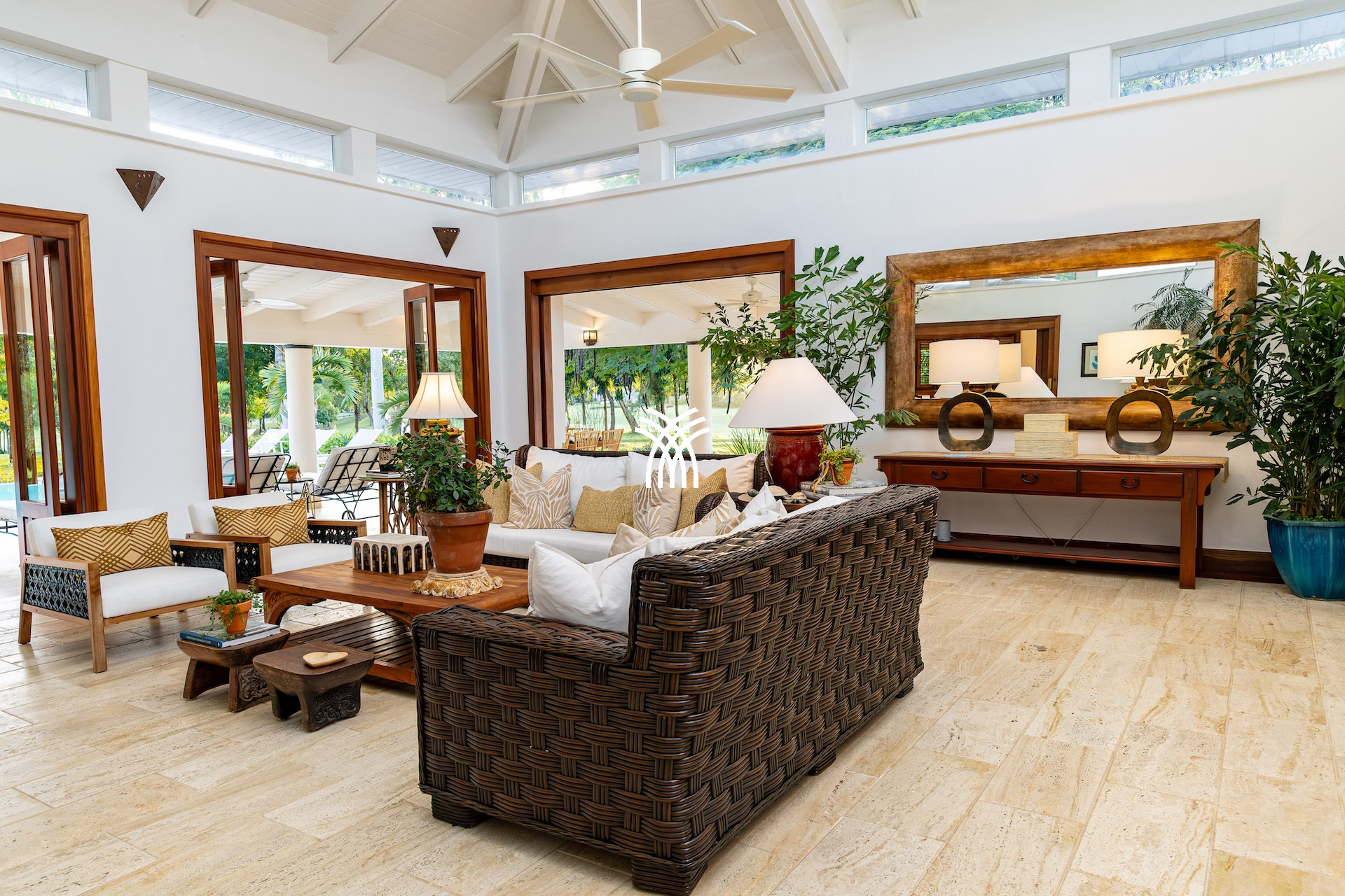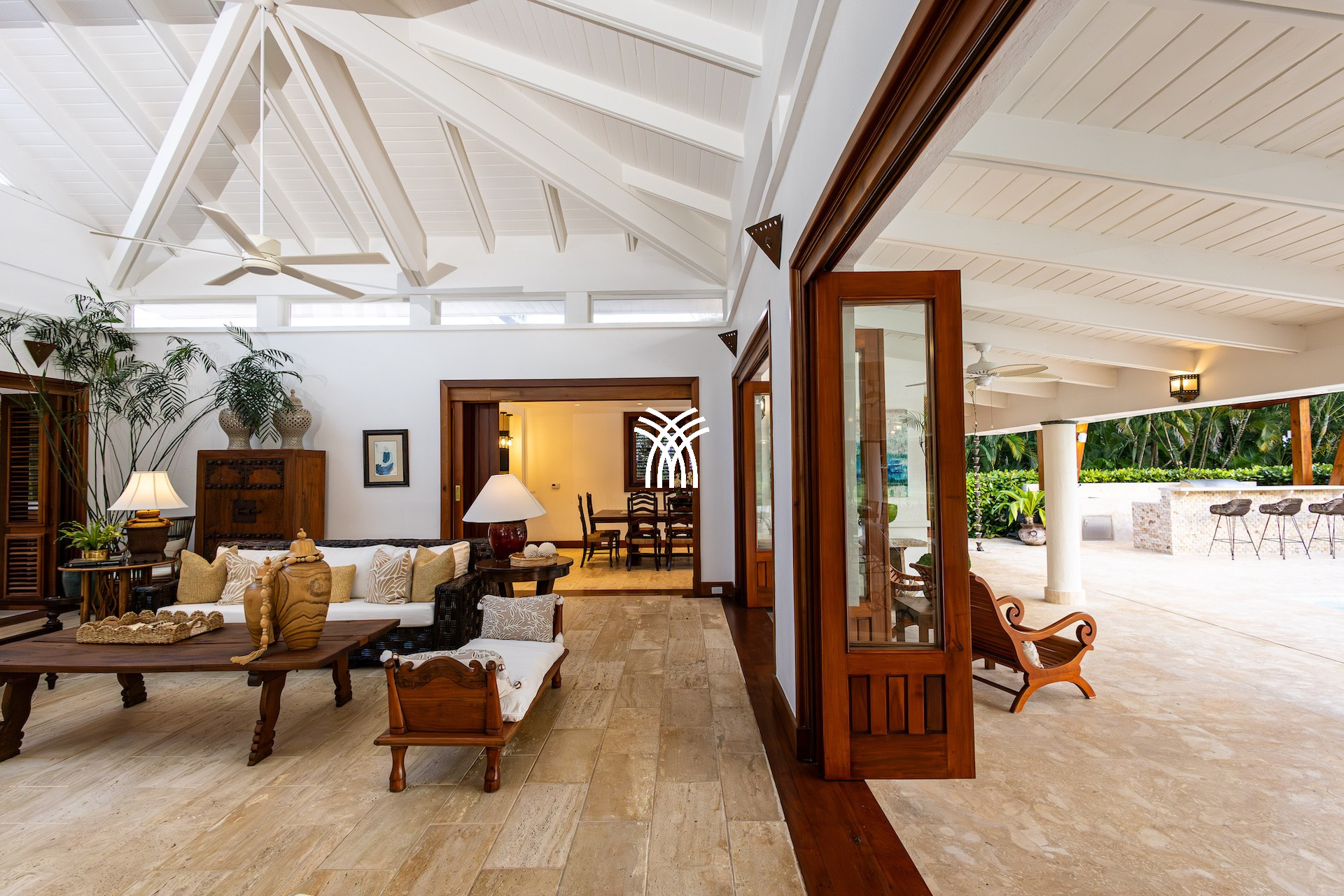 Dès l’entrée, un patio à ciel ouvert planté de végétation luxuriante et orné d’une élégante chaîne d’eau vous accueille comme un havre de paix. Les volumes généreux, les plafonds voûtés et les boiseries nobles diffusent une atmosphère lumineuse et chaleureuse. De grandes portes en bois s’ouvrent sur une vaste terrasse qui capte la brise tropicale et invite à vivre pieds nus entre intérieur raffiné et nature préservée.