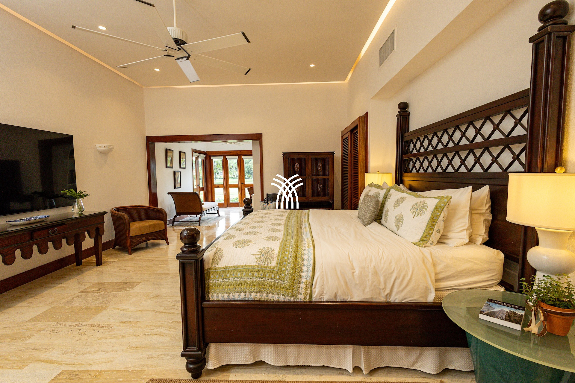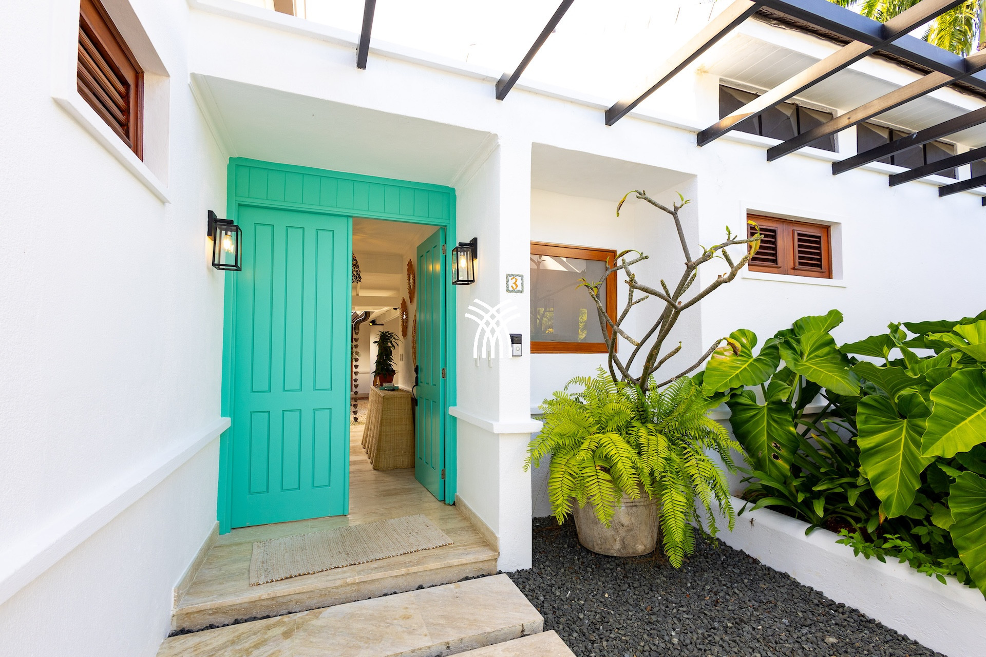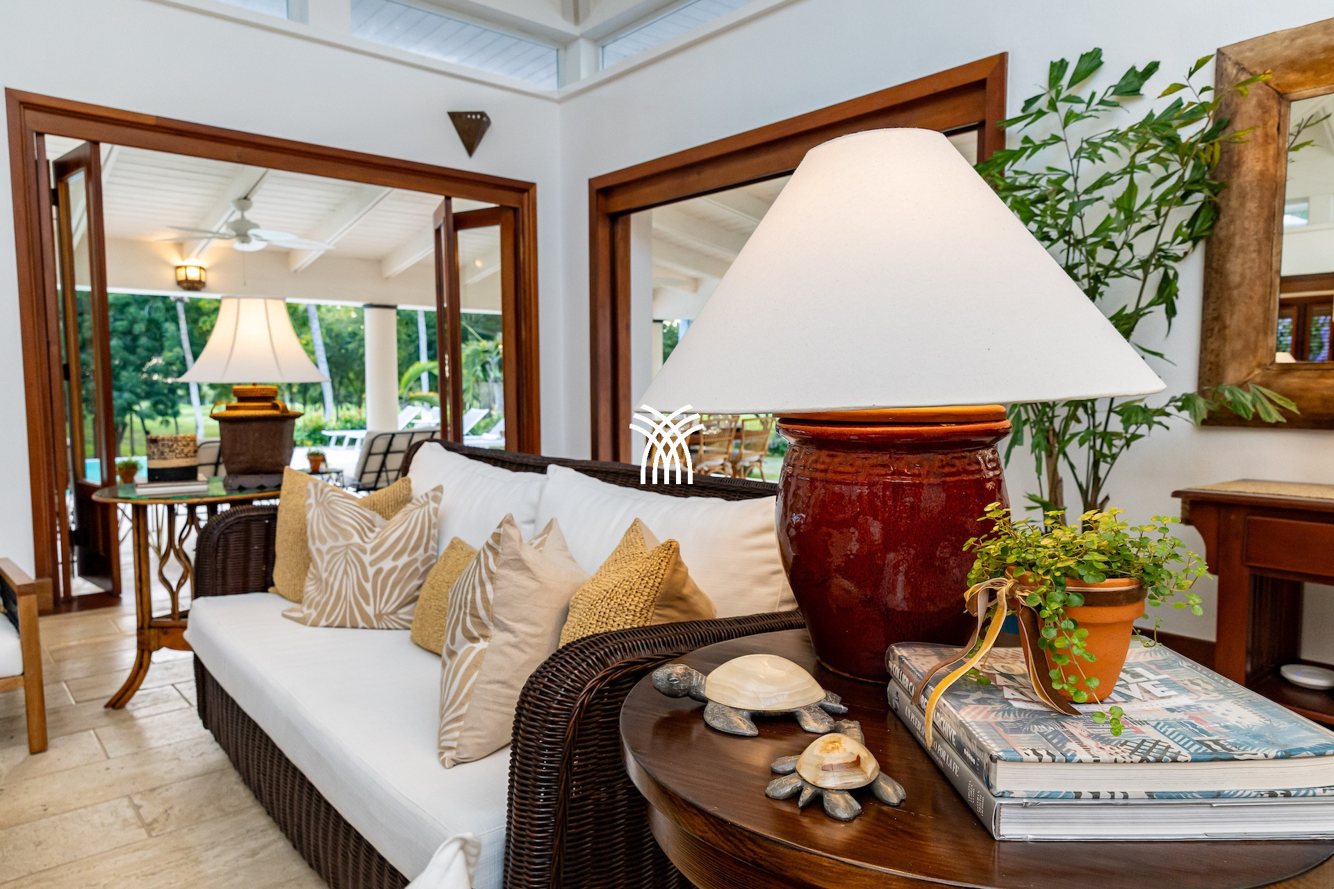 Dès l’entrée, un patio à ciel ouvert planté de végétation luxuriante et orné d’une élégante chaîne d’eau vous accueille comme un havre de paix. Les volumes généreux, les plafonds voûtés et les boiseries nobles diffusent une atmosphère lumineuse et chaleureuse. De grandes portes en bois s’ouvrent sur une vaste terrasse qui capte la brise tropicale et invite à vivre pieds nus entre intérieur raffiné et nature préservée.