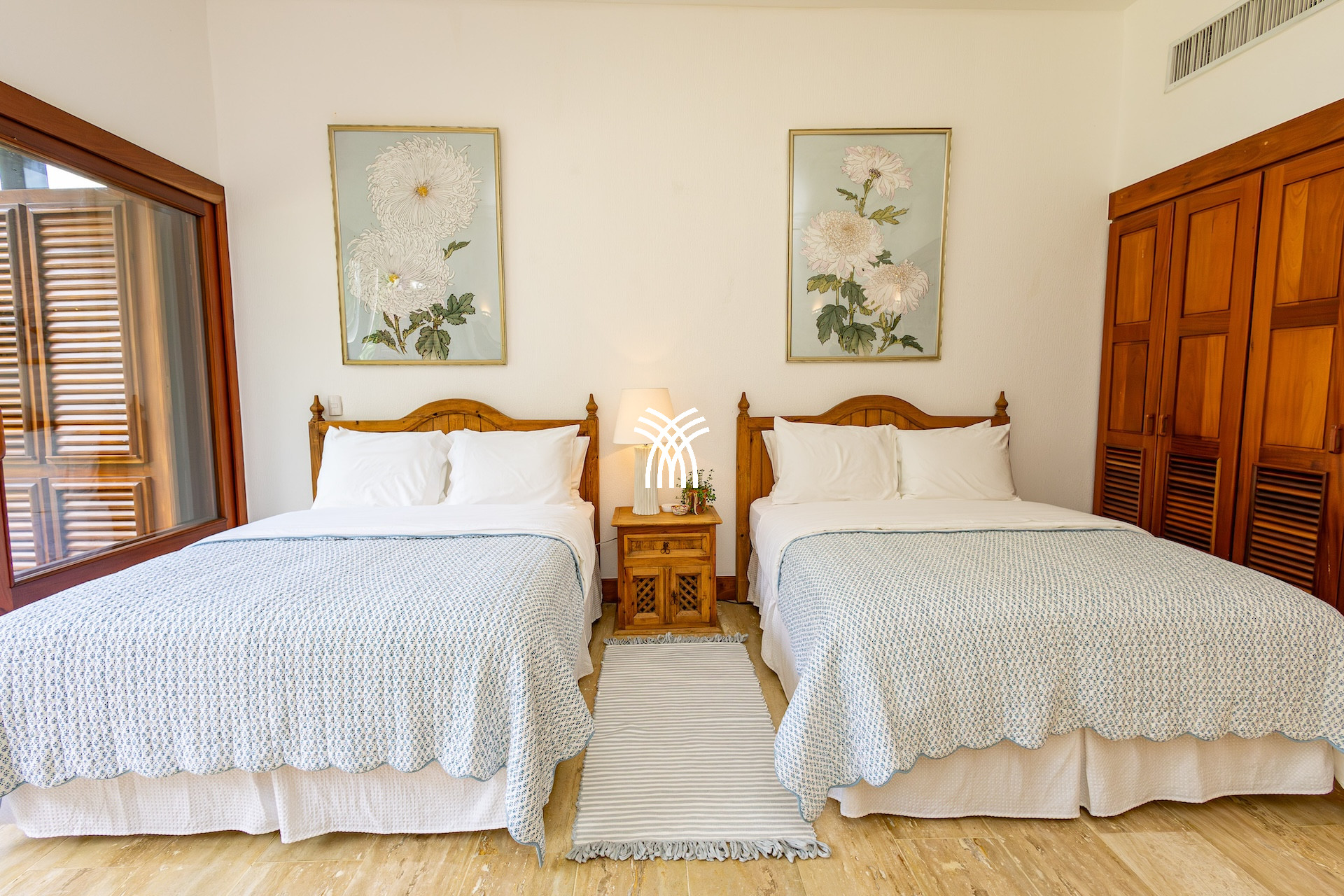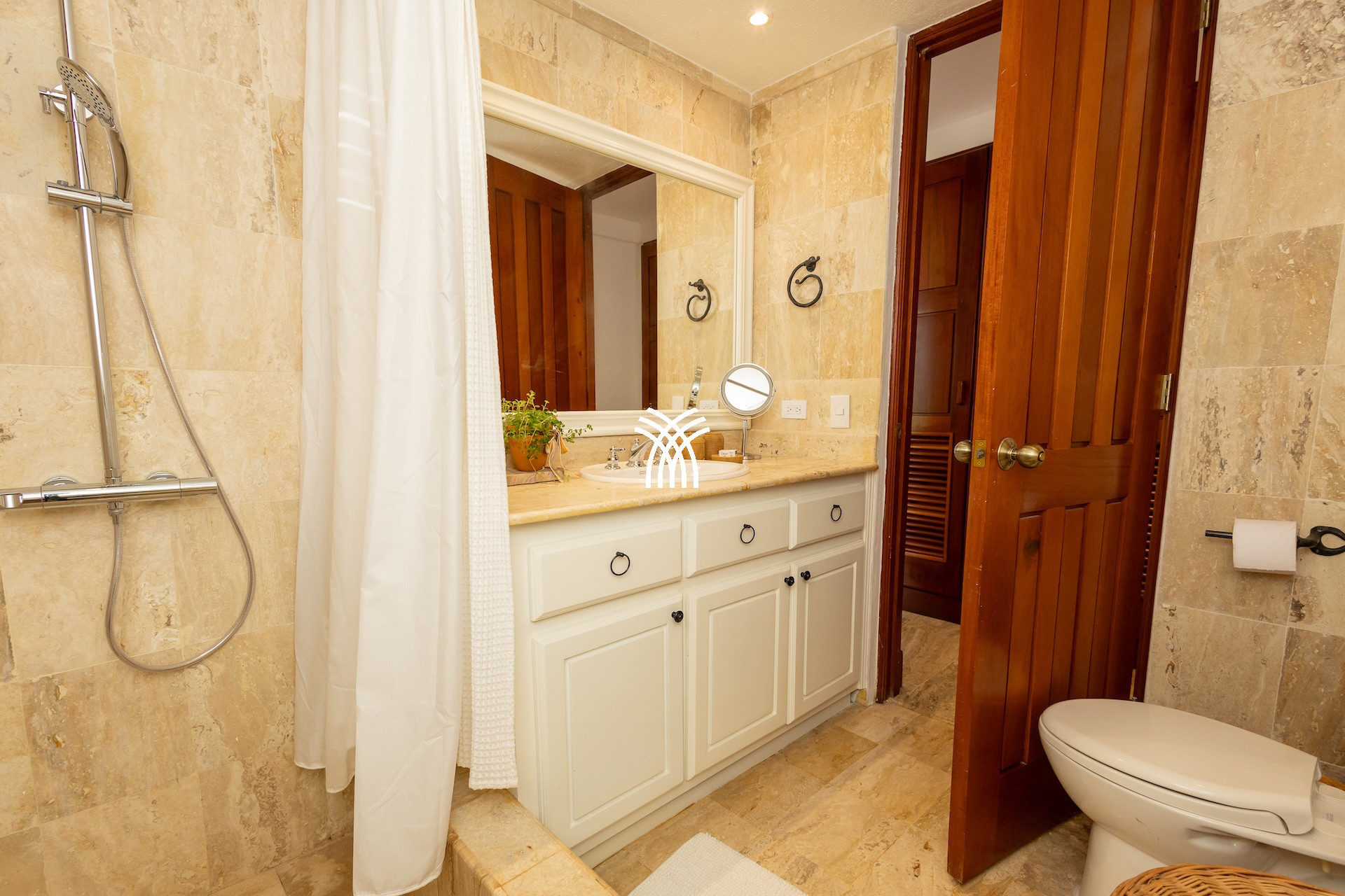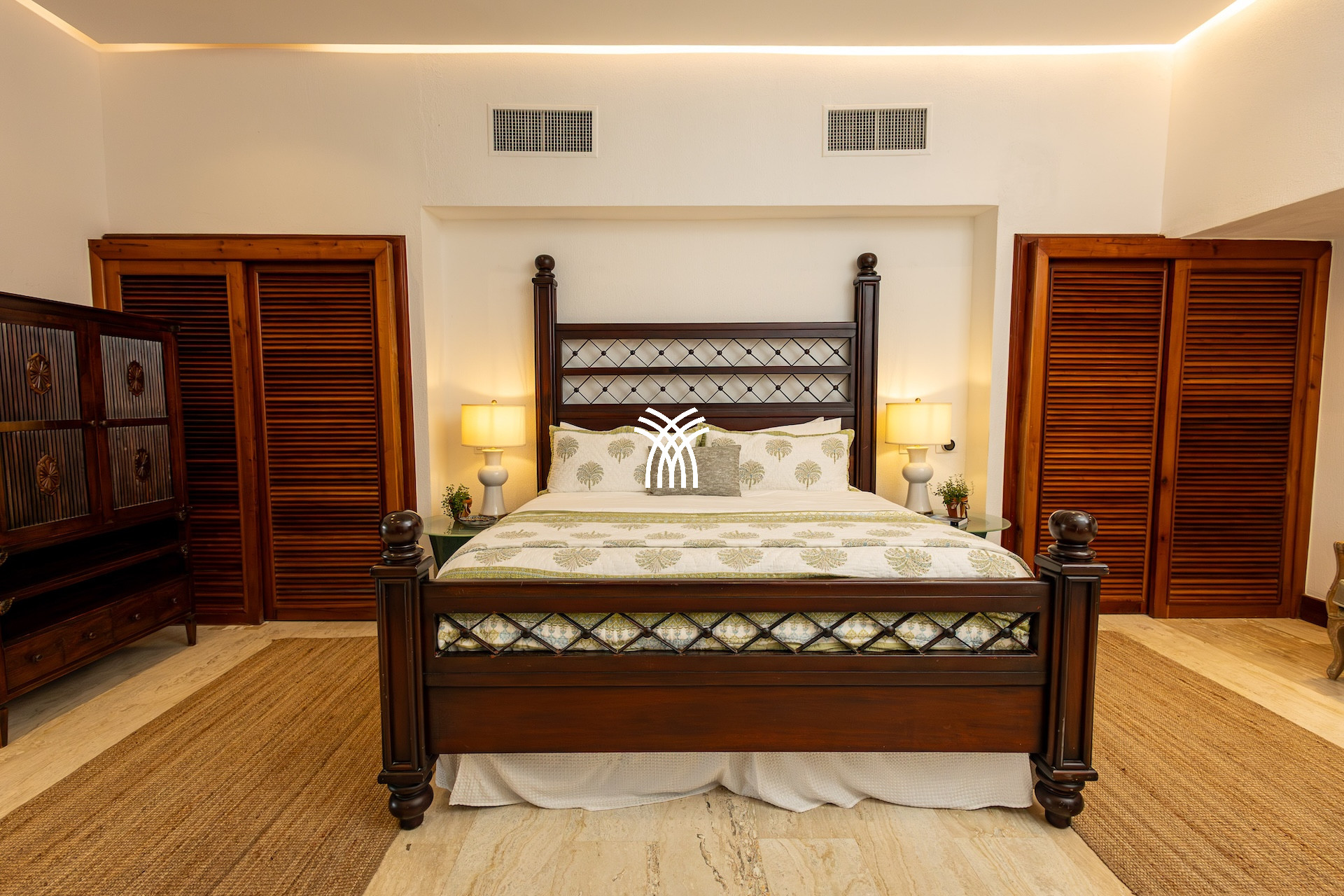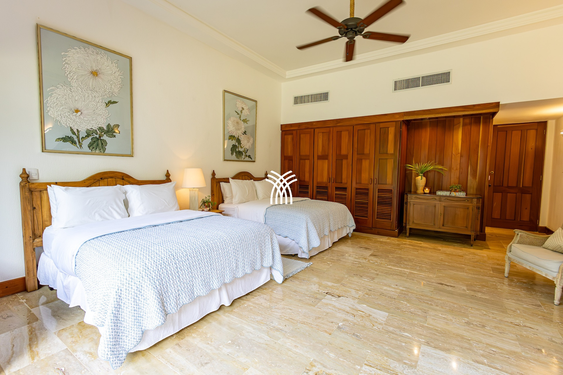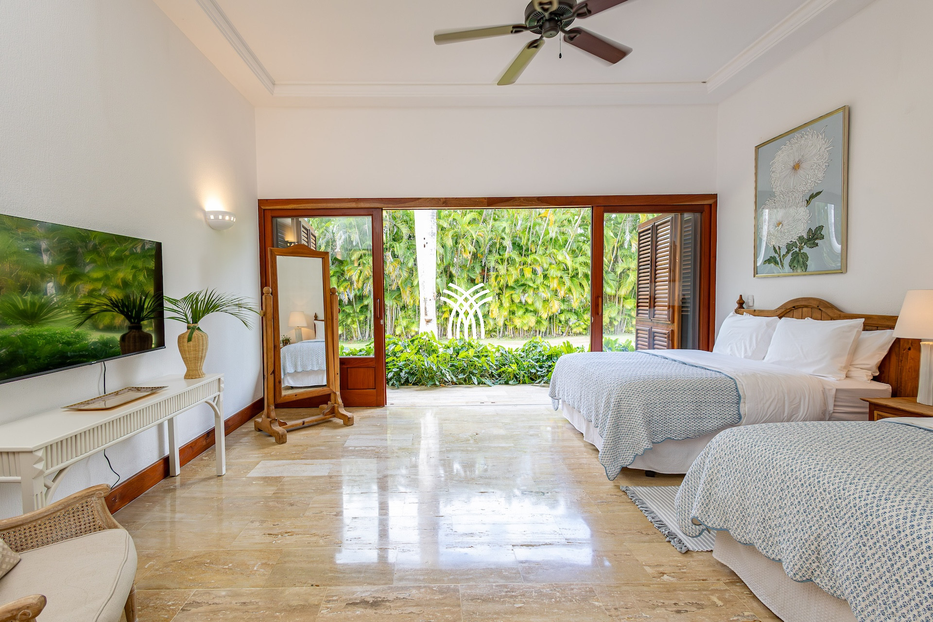 Pensée pour accueillir jusqu’à huit personnes, cette location villa luxe République dominicaine dispose de quatre suites confortables où linge raffiné, salles de bain élégantes et rangements spacieux créent un cocon parfait pour le repos. Chaque espace respire le calme et la discrétion, pour offrir à chacun son intimité au cœur d’un décor exotique.