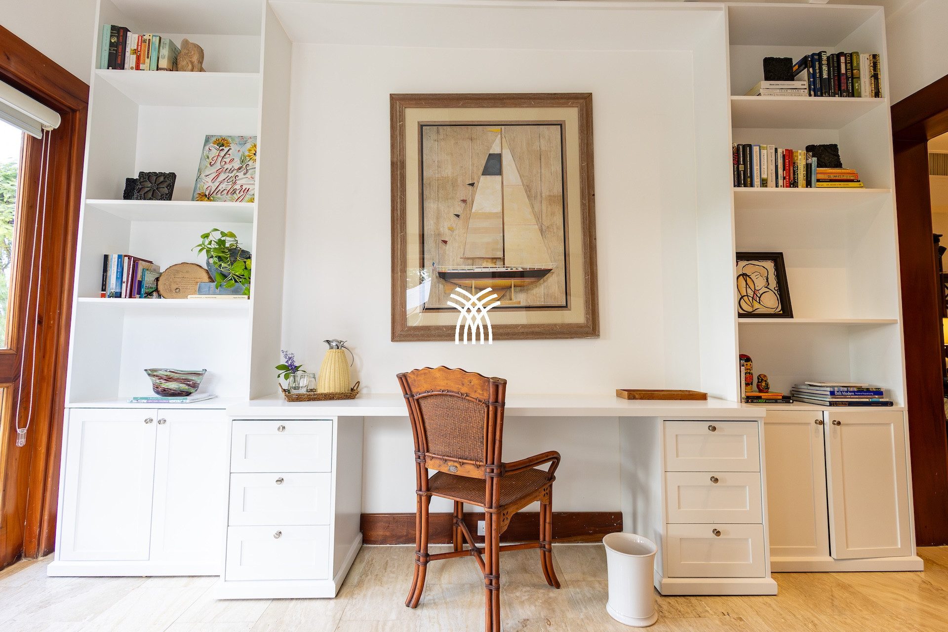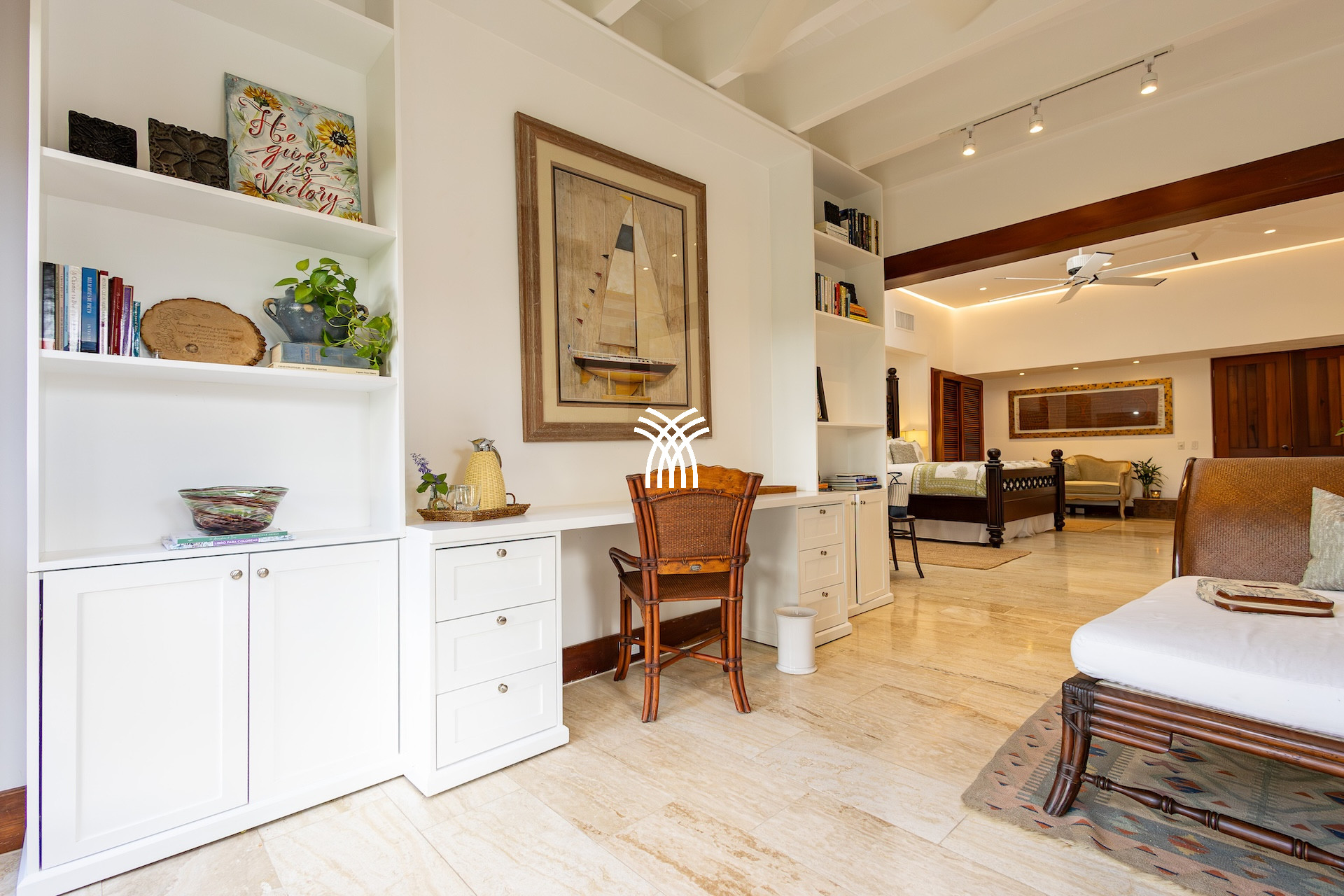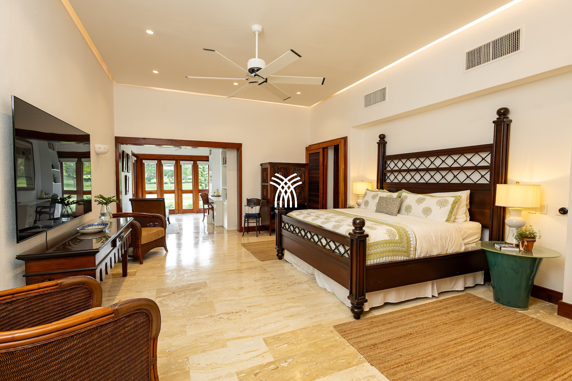 Les pièces de vie, décorées avec soin dans un style inspiré des îles, invitent au farniente : fauteuils moelleux, matières naturelles et clins d’œil à l’artisanat local rythment chaque recoin. Un coin bureau, baigné de lumière et surplombant le fairway, permet d’allier télétravail et moments de calme avec une vue apaisante sur les greens parfaitement entretenus.