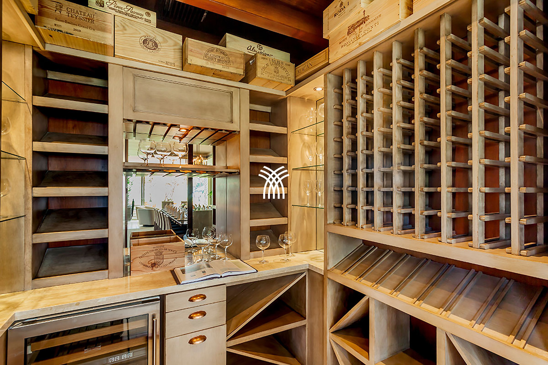 La salle à manger formelle dégage un charme contemporain, rehaussé par un bar intégré et un refroidisseur à vin de mur à mur qui invite à des soirées festives et à des conversations intimes. Deux salles multimédia dédiées offrent des espaces confortables pour le divertissement, tandis qu'un bureau privé offre un refuge tranquille pour les invités qui recherchent un équilibre entre loisirs et productivité.