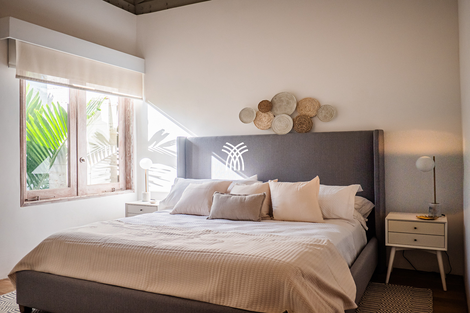 À l'étage, la villa propose trois chambres soigneusement aménagées, chacune un havre privé de confort et de calme. La suite principale dégage le luxe avec son lit king size, un dressing spacieux et une salle de bain de type spa comprenant des douches doubles, dont une douche extérieure sereine. La terrasse attenante, partagée avec une charmante chambre avec lit queen, offre un endroit paisible pour profiter de la douce brise matinale. Une troisième chambre, avec son propre lit king size, complète les hébergements reposants.