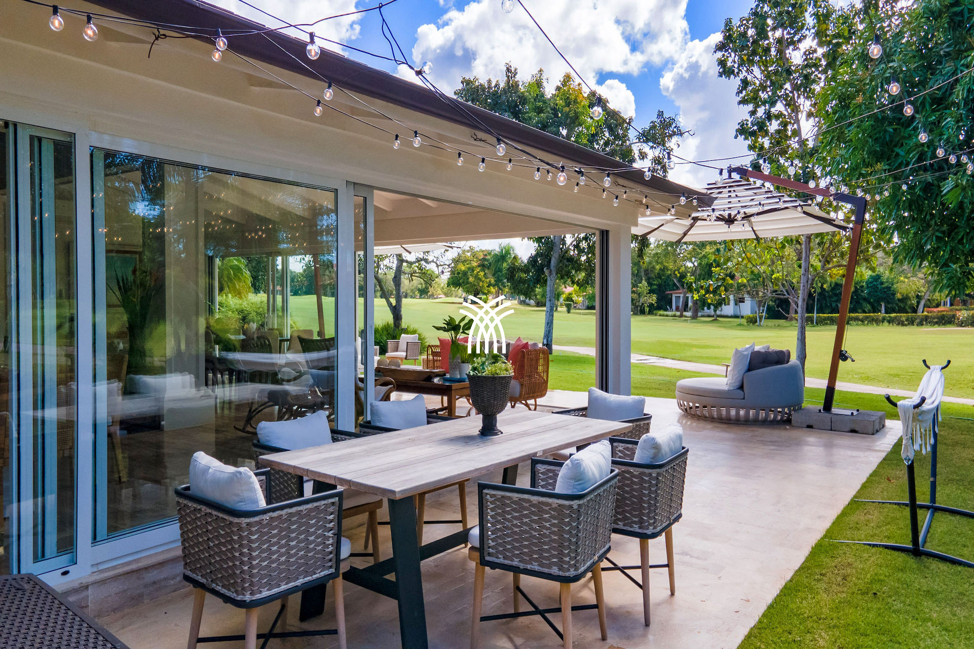 En extérieur, un espace de restauration al fresco serein vous invite à dîner sous les étoiles, entouré de verdure luxuriante et de la douce lueur des guirlandes lumineuses. C'est un cadre où les moments se transforment en souvenirs—qu'ils soient partagés autour de repas gastronomiques ou dans l'intimité paisible d'une soirée caribéenne.