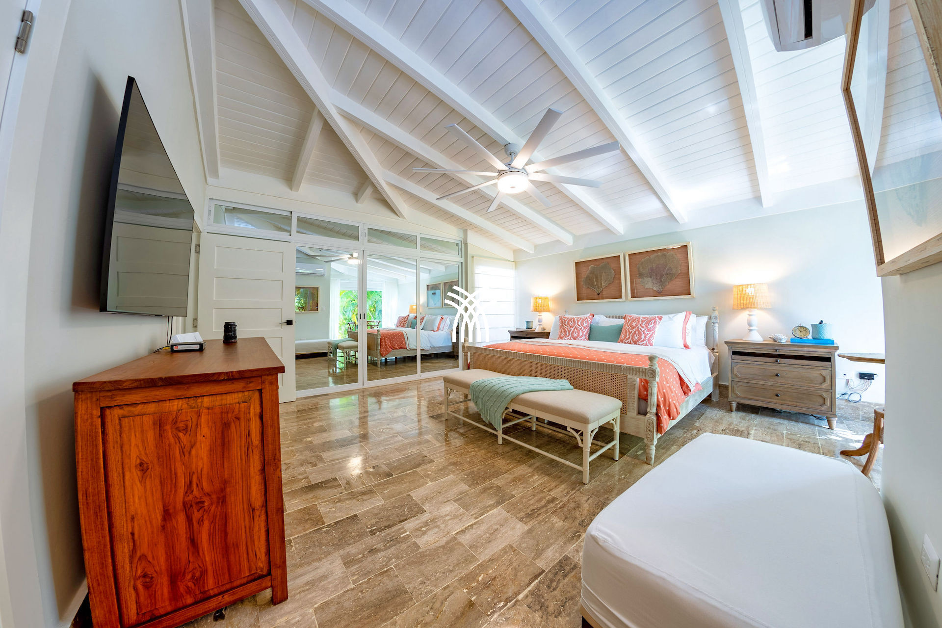 Entièrement climatisée, la villa offre un sanctuaire frais et accueillant à l'abri de la chaleur de la journée. Chaque chambre est un havre de paix privé, doté de salles de bains attenantes qui procurent confort et commodité, garantissant à chaque invité une intimité et une détente reposantes. Les intérieurs sont soigneusement aménagés, alliant esthétique raffinée et chaleur accueillante pour créer un espace à la fois luxueux et personnel.