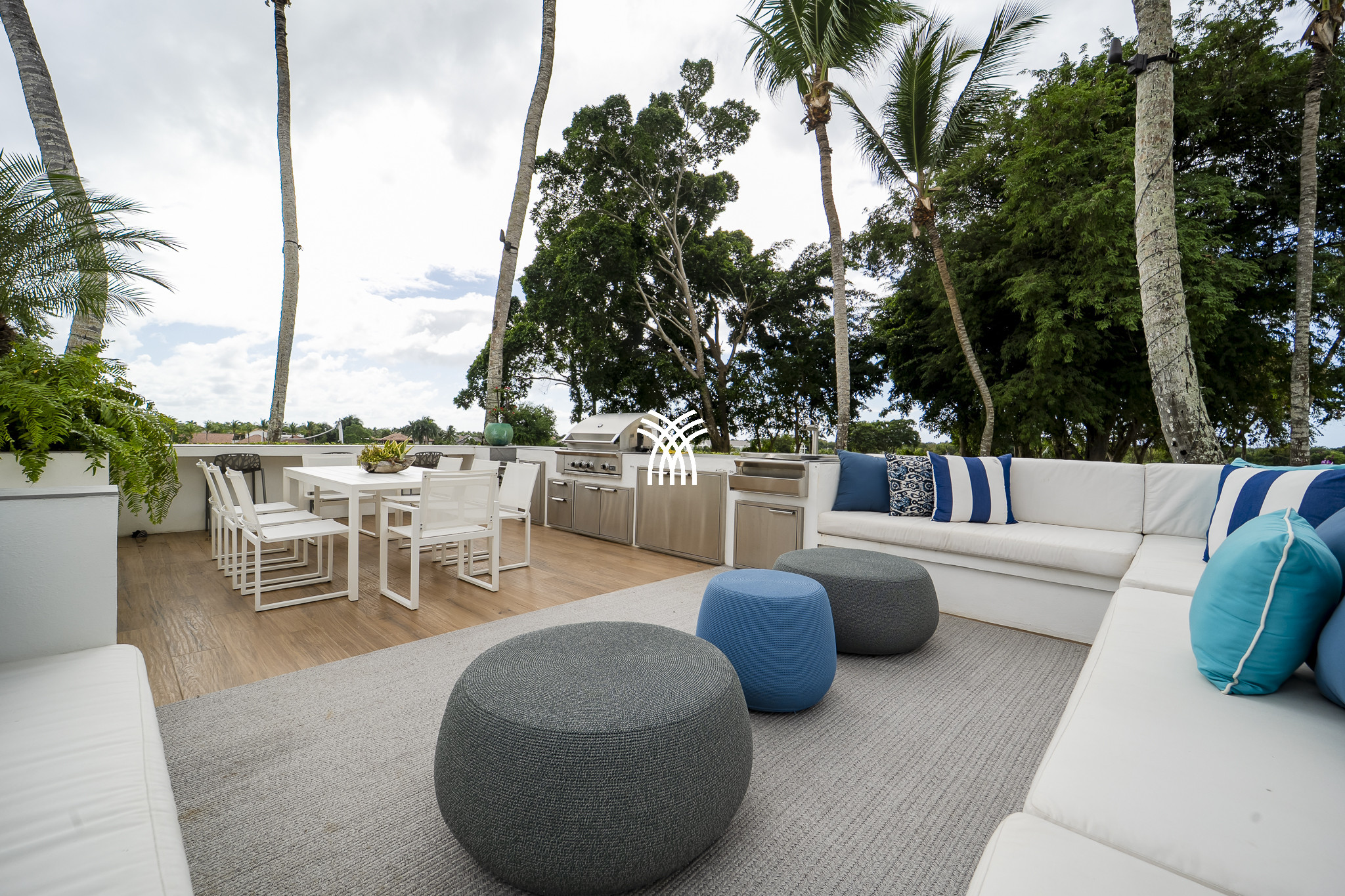 La terrasse est un sanctuaire tropical à part entière, niché parmi des palmiers ondulants et un feuillage vibrant. Ici, deux piscines scintillantes offrent une retraite rafraîchissante, parfaite pour des matinées paisibles, des après-midis baignés de soleil ou des soirées élégantes sous les étoiles. Que l'on profite de moments de solitude tranquille ou que l'on partage des rassemblements joyeux avec ses proches, l'ambiance est celle d'un luxe sans effort.