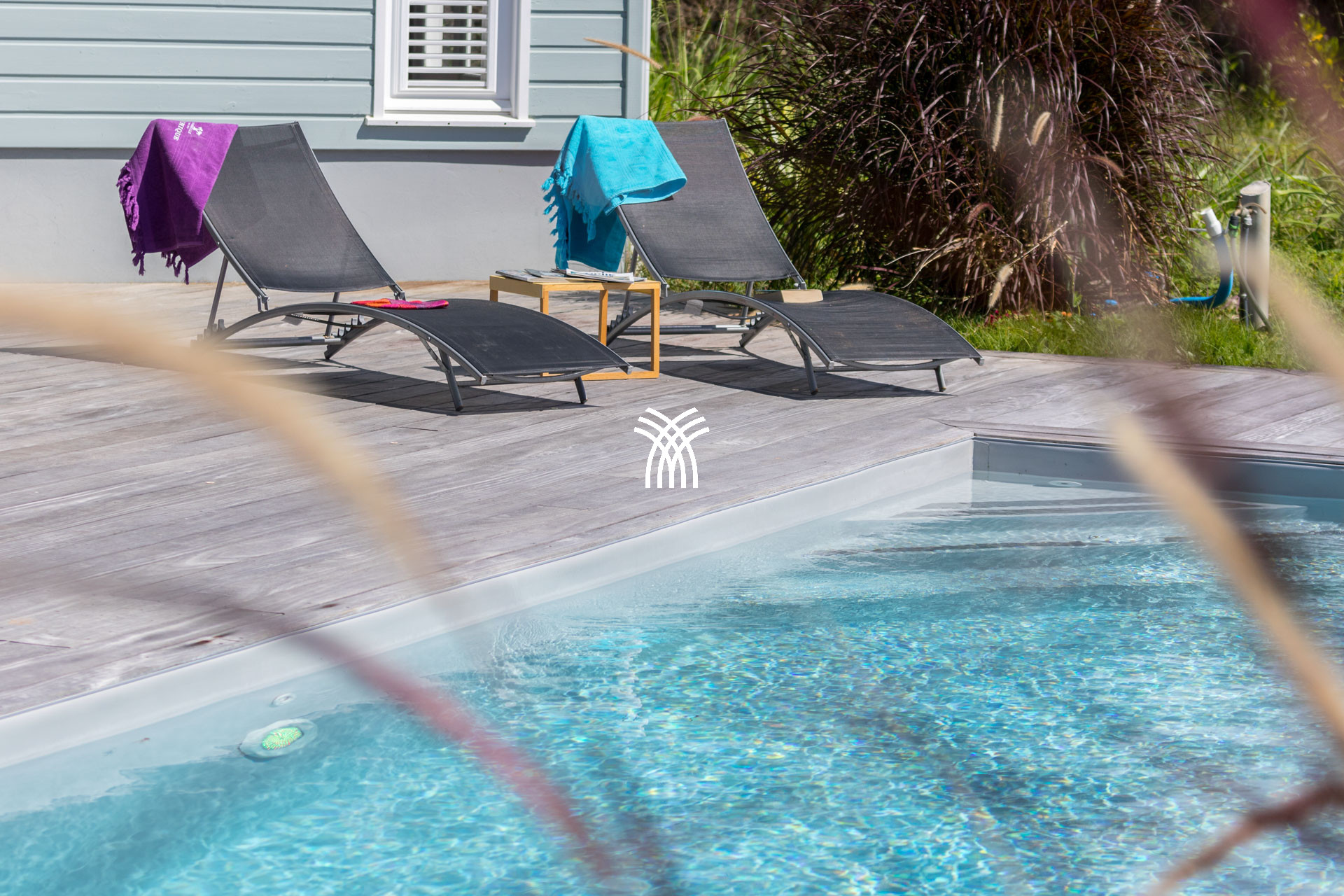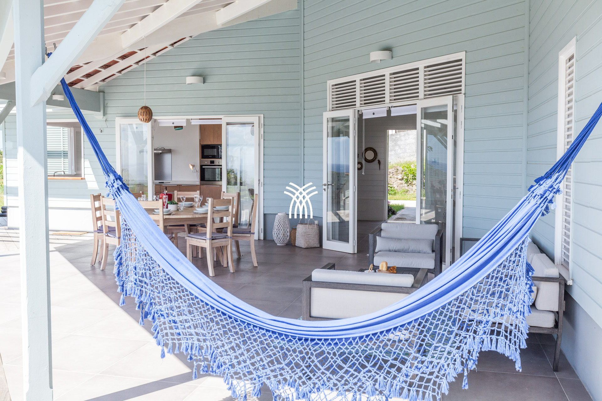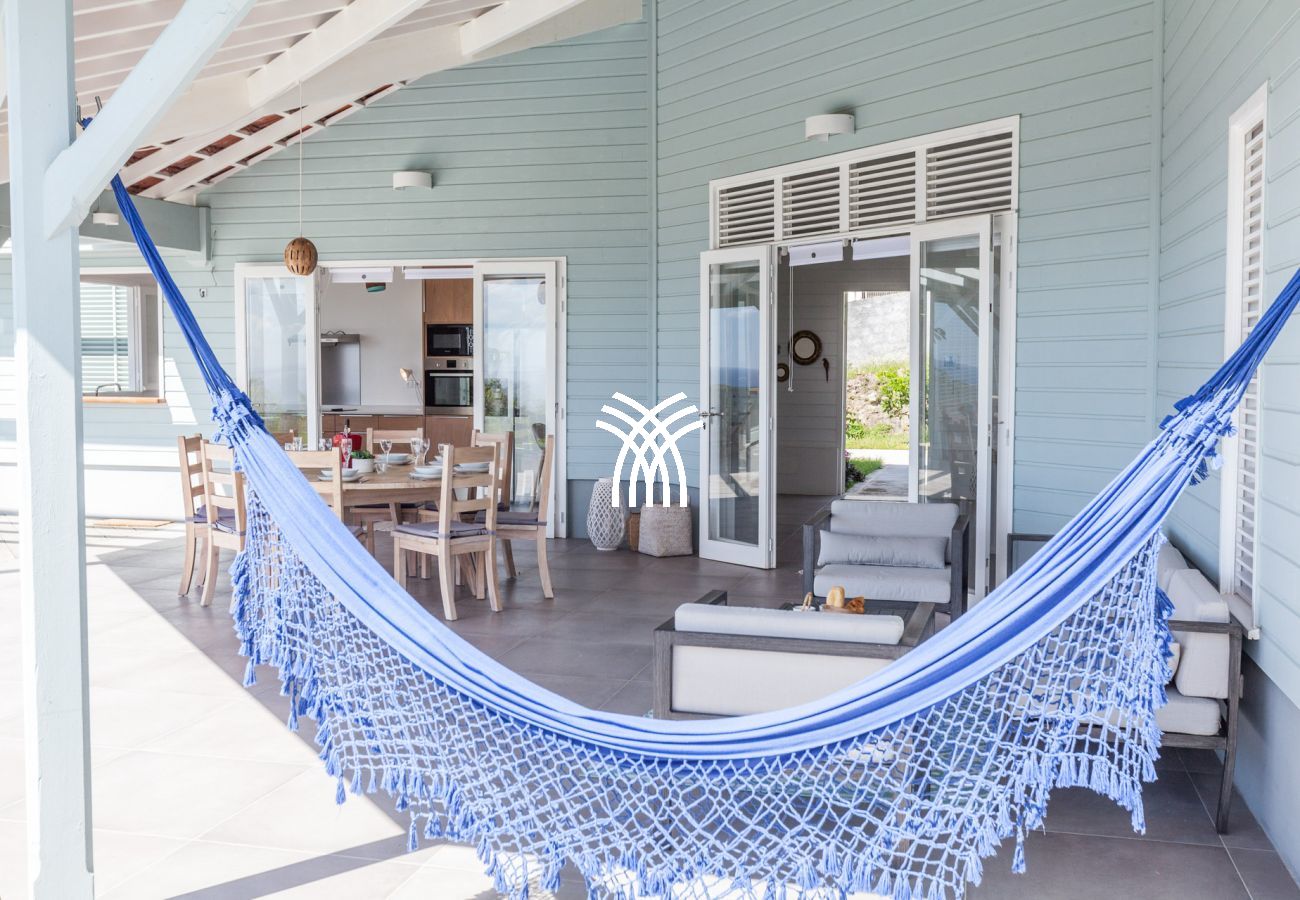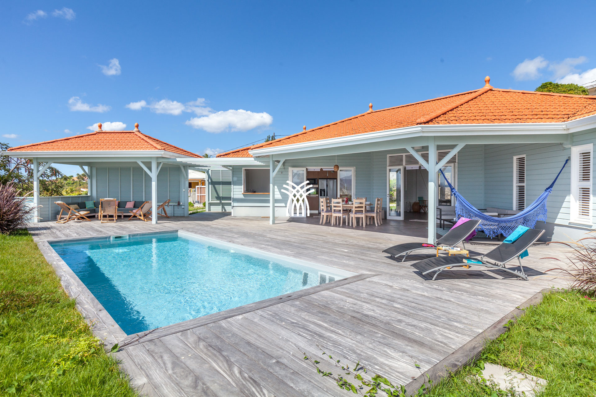 À l’extérieur, l’espace piscine avec vue sur la mer complète à merveille cette location de villa en Martinique. La piscine bordée d’un grand deck invite au farniente, tandis qu’un carbet aménagé en salon de jour devient l’endroit rêvé pour un apéritif au coucher du soleil. Les chaises longues disposées autour du bassin promettent des instants de détente face à un panorama exceptionnel.