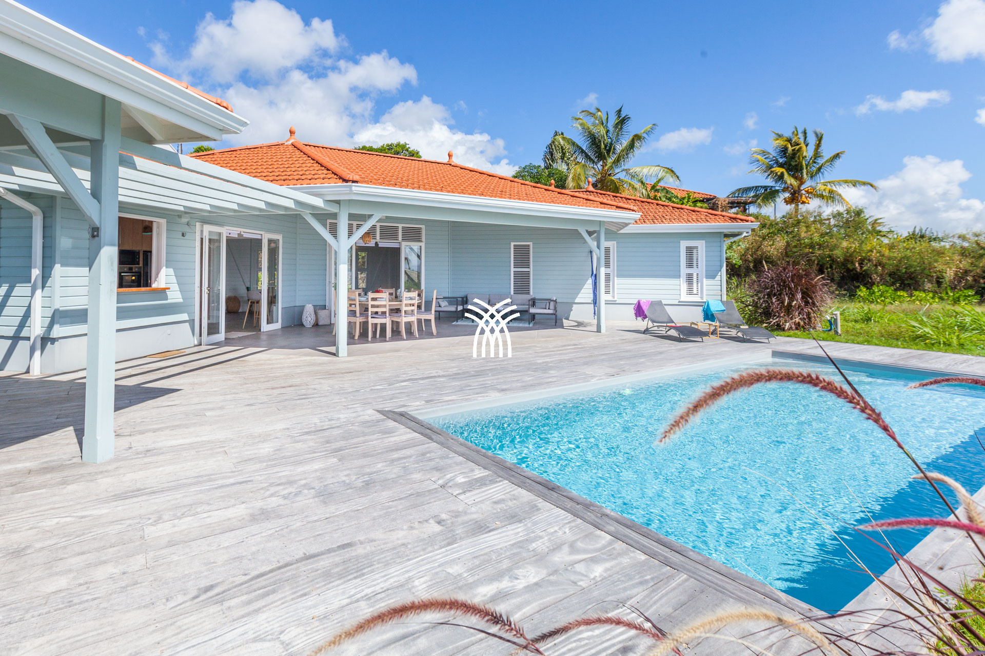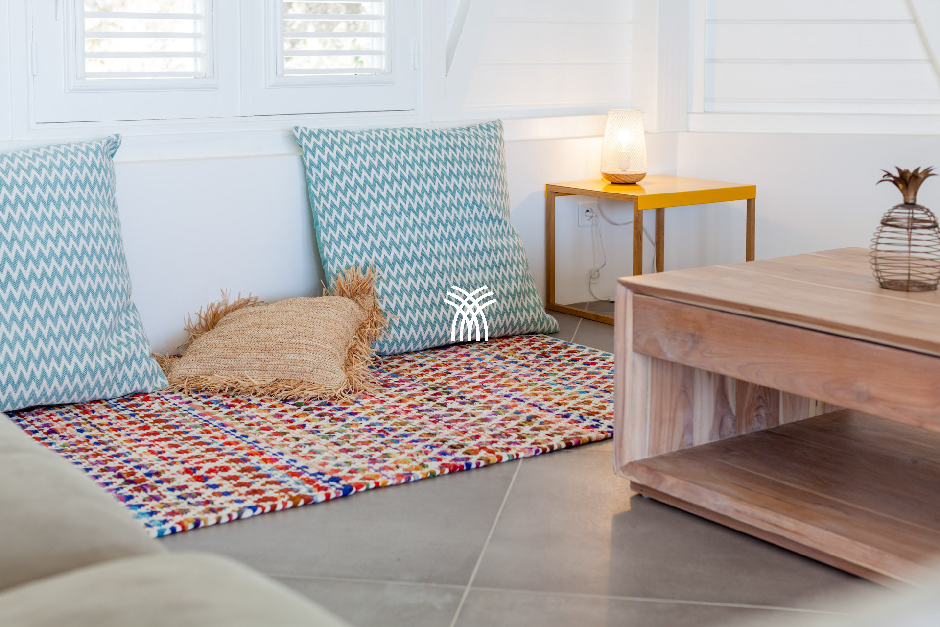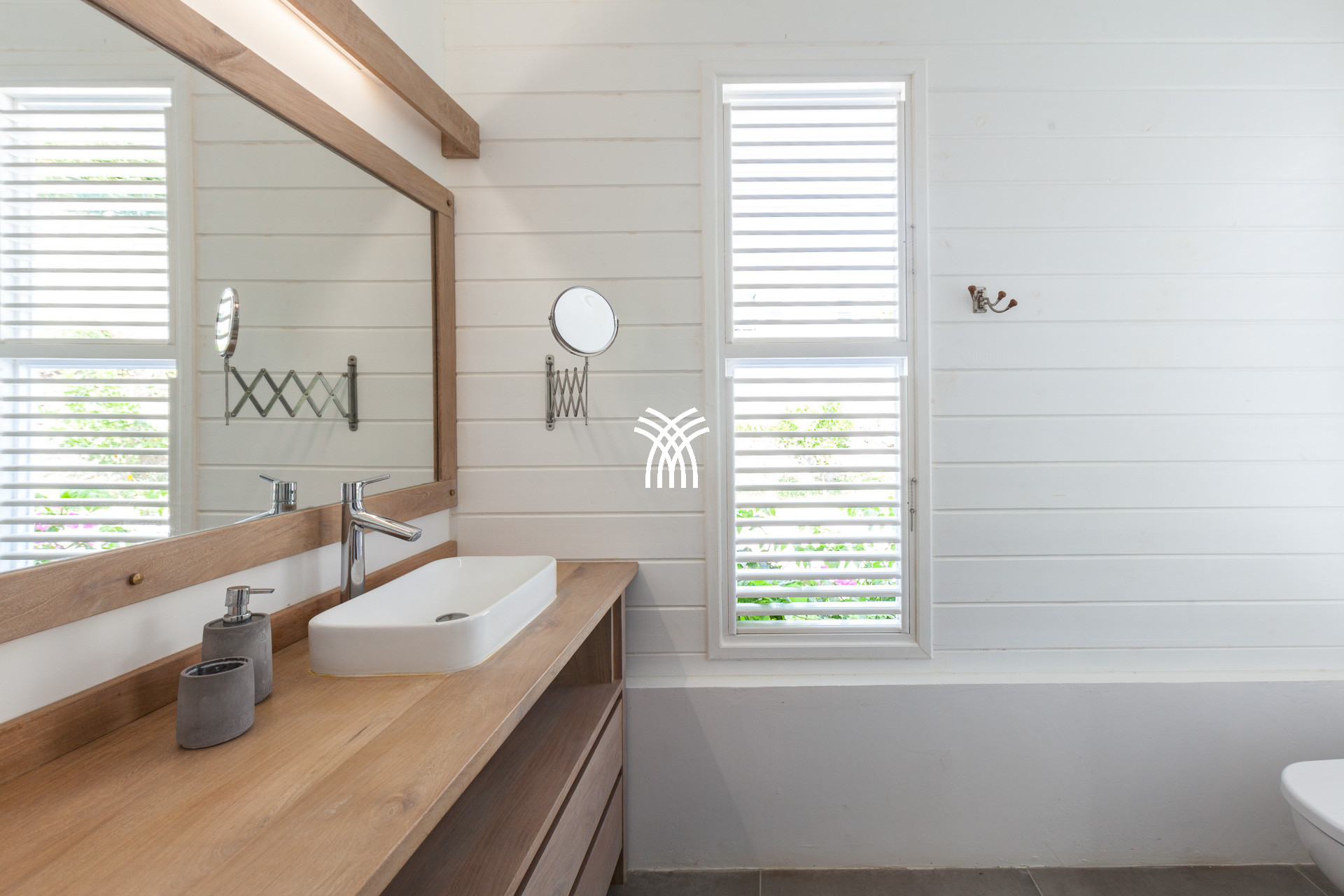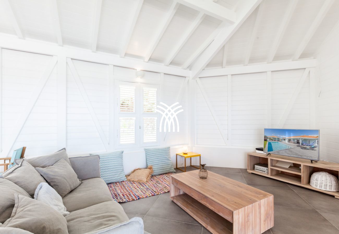 La villa Aqua, véritable havre de sérénité, propose une décoration épurée aux influences tropicales. Le toit en tuiles, les poutres apparentes et les jeux de lumière filtrés par les clayettes offrent un charme créole authentique. L’ensemble des espaces a été pensé pour le confort et le bien-être, dans une ambiance lumineuse et apaisante.