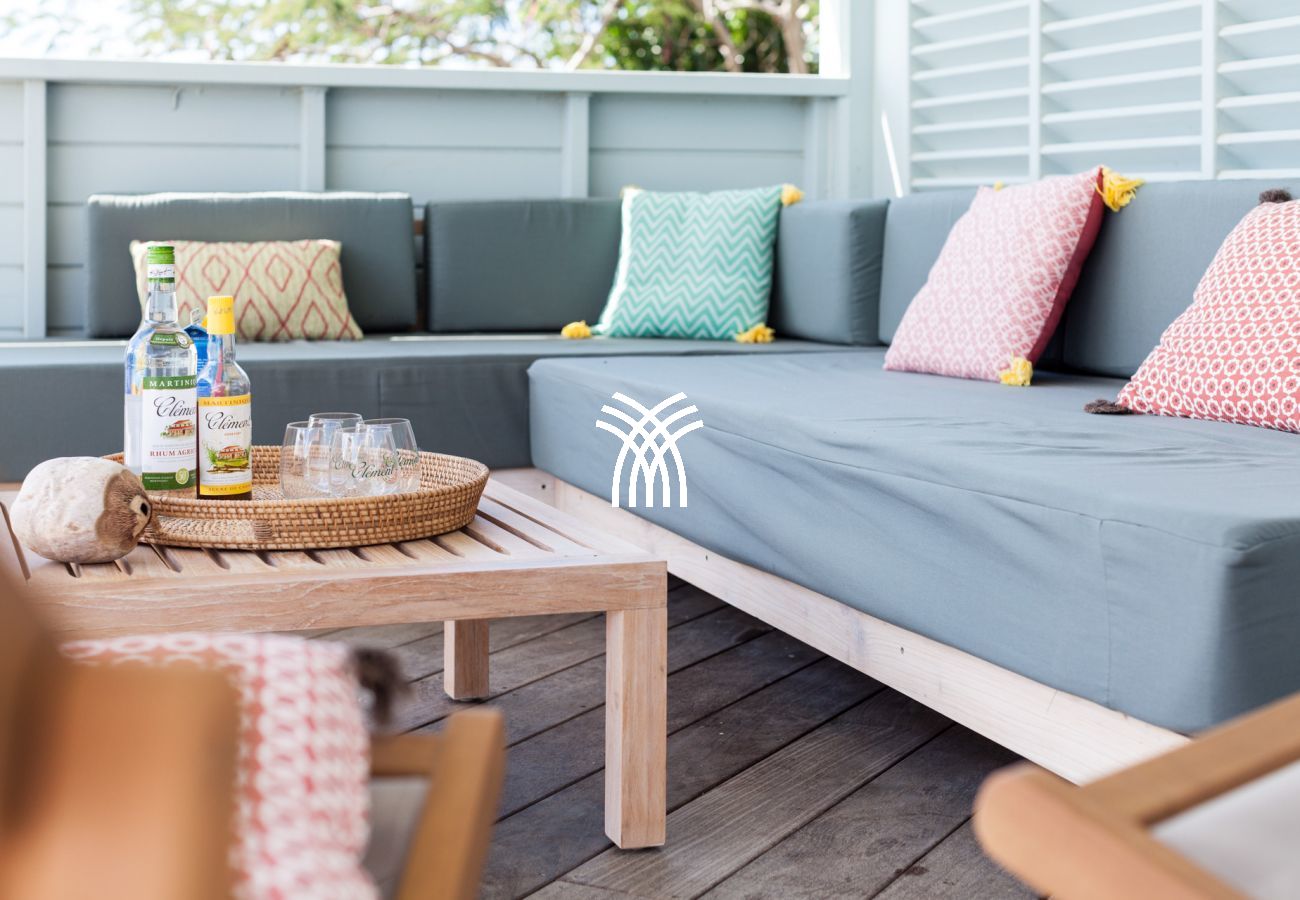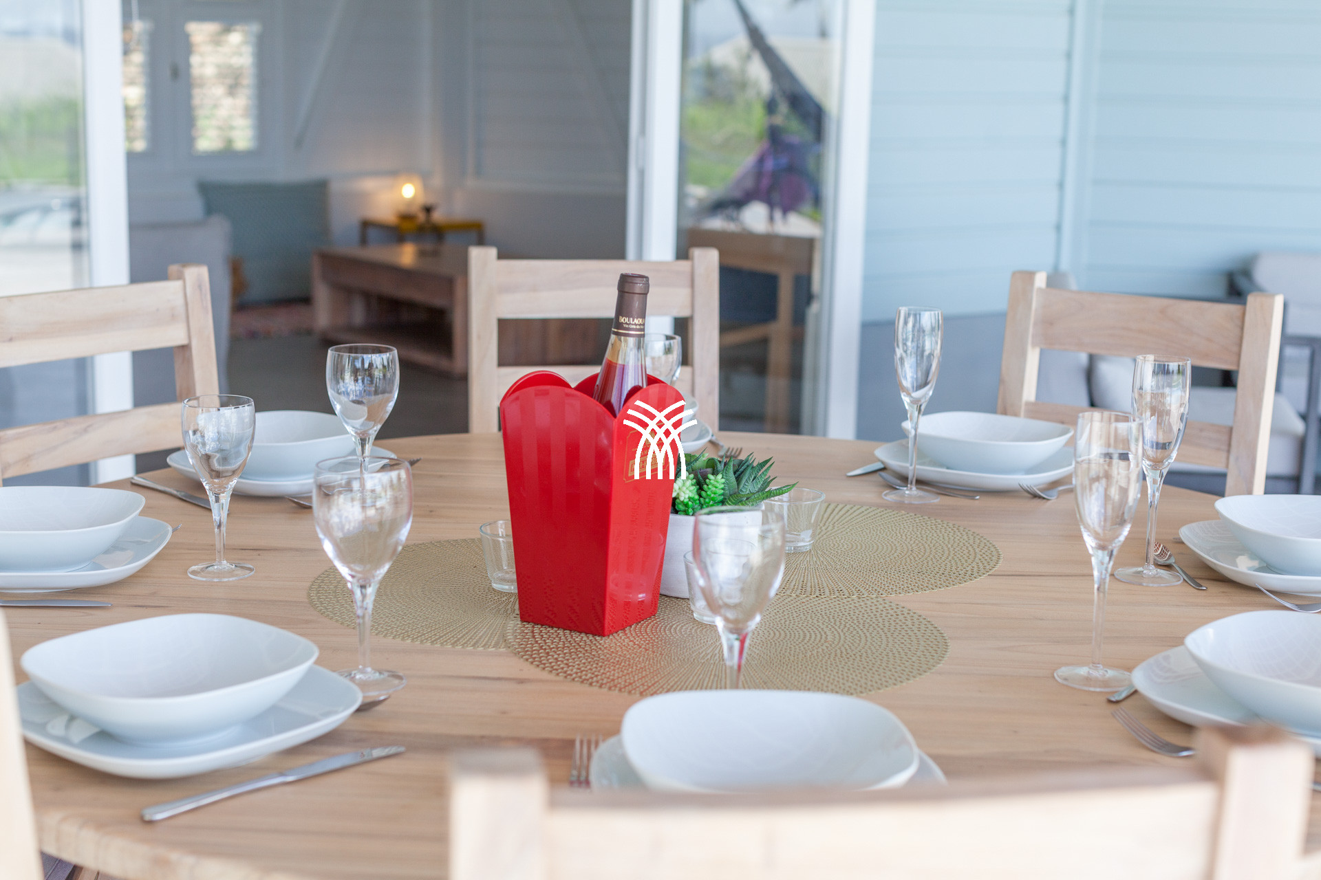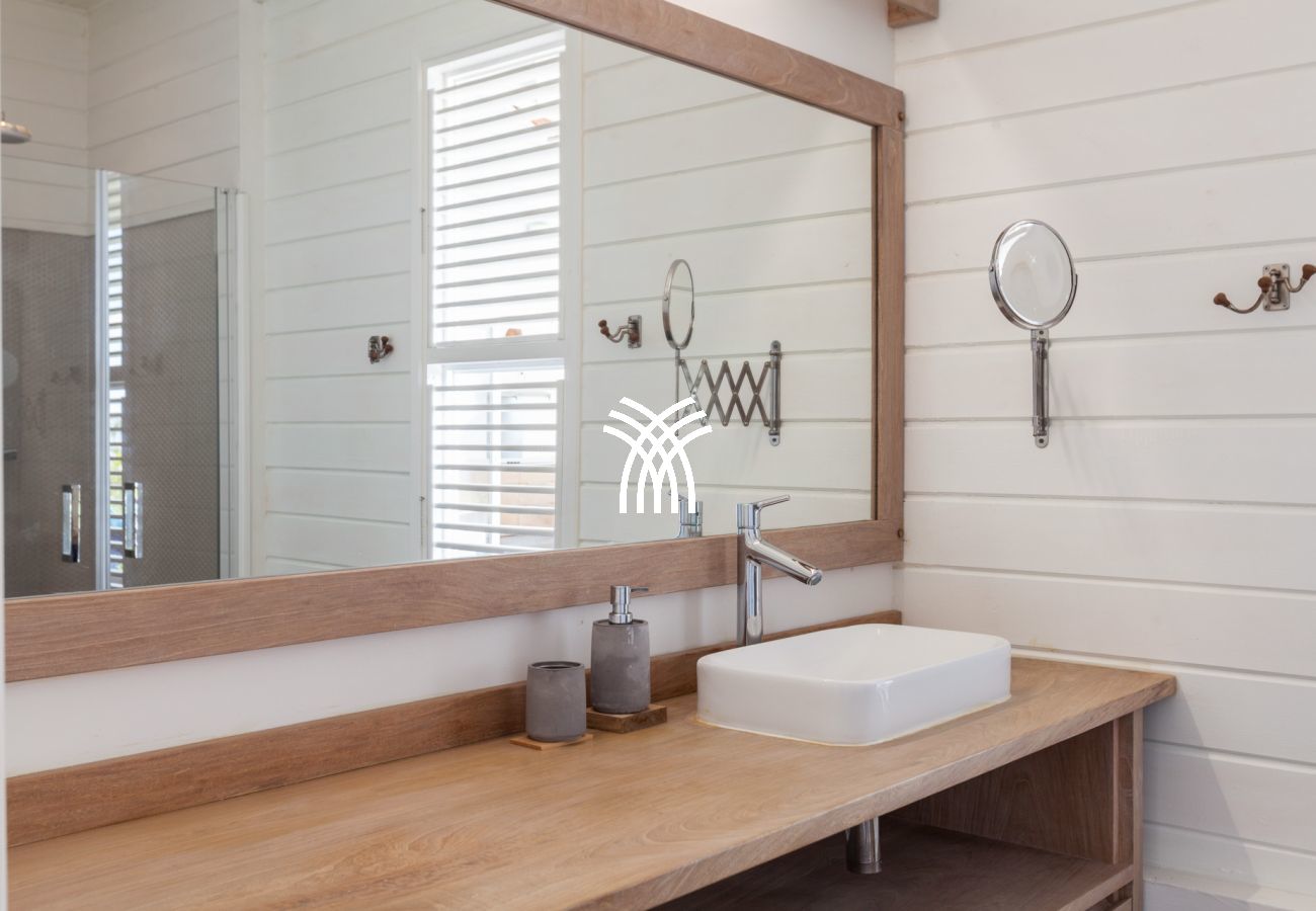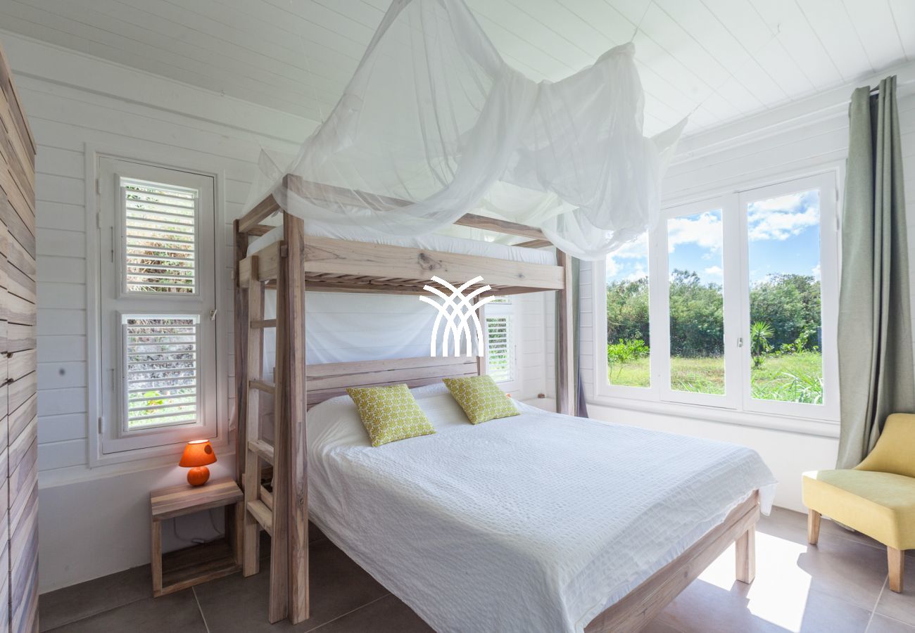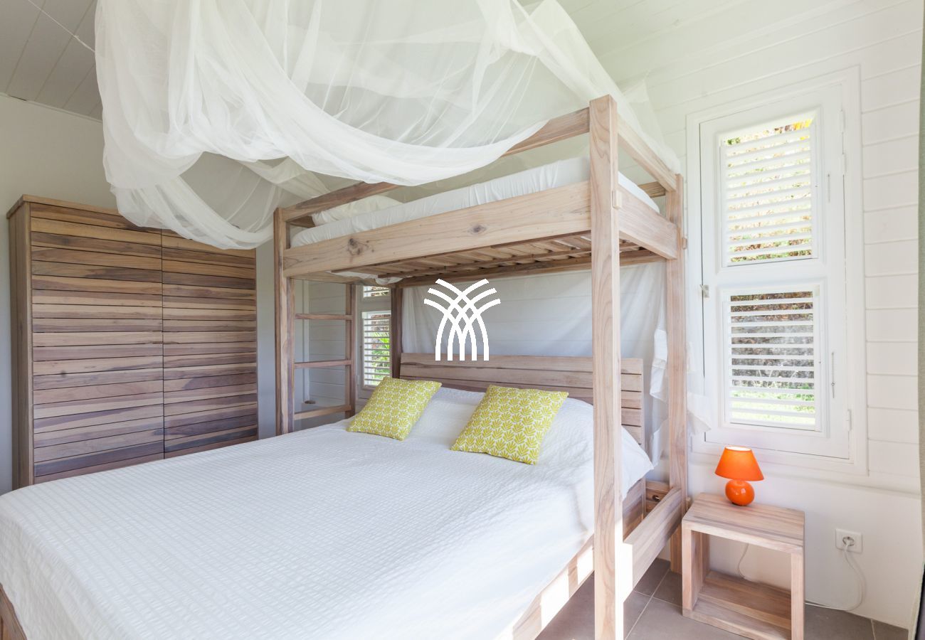 La villa Aqua, véritable havre de sérénité, propose une décoration épurée aux influences tropicales. Le toit en tuiles, les poutres apparentes et les jeux de lumière filtrés par les clayettes offrent un charme créole authentique. L’ensemble des espaces a été pensé pour le confort et le bien-être, dans une ambiance lumineuse et apaisante.
