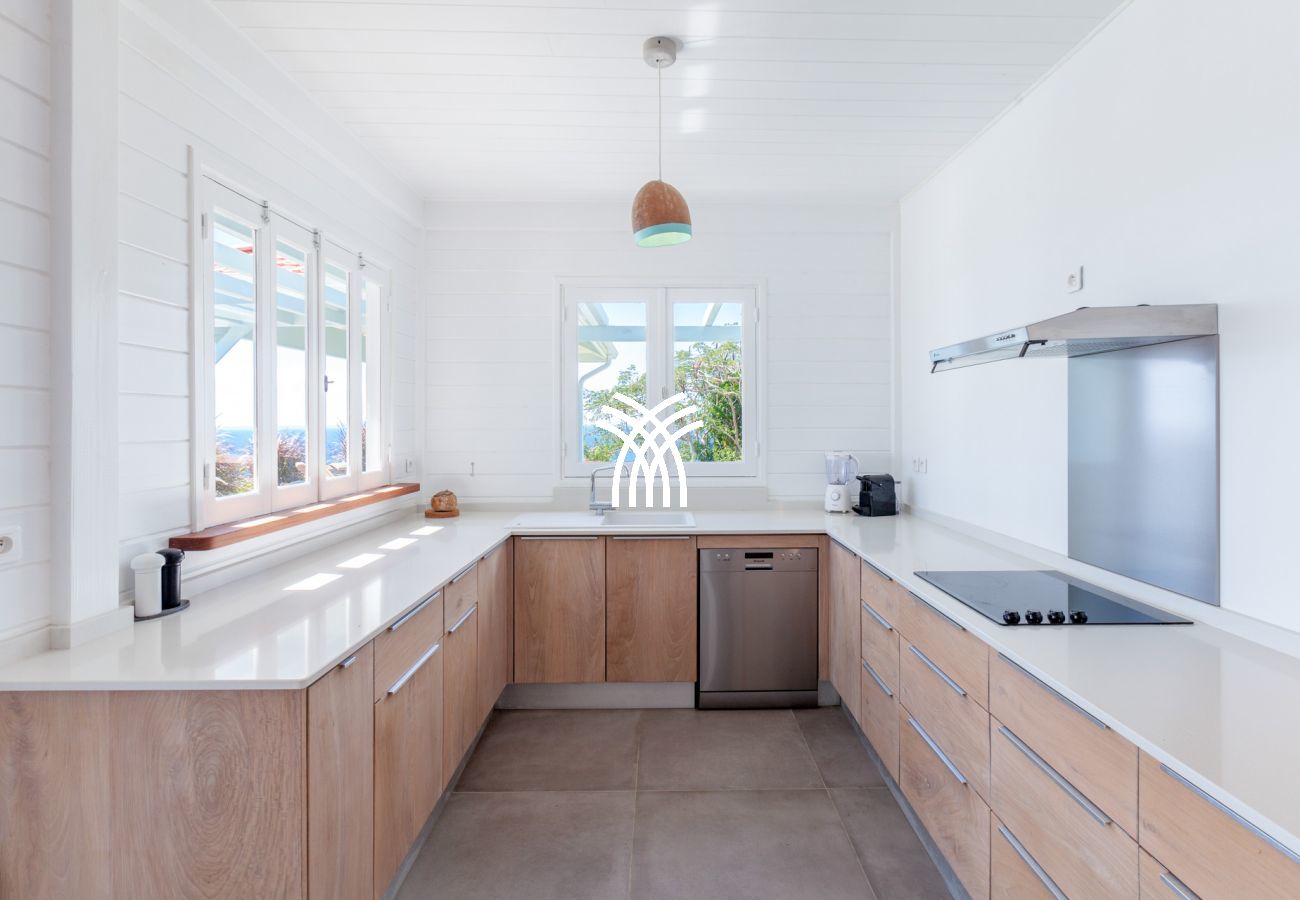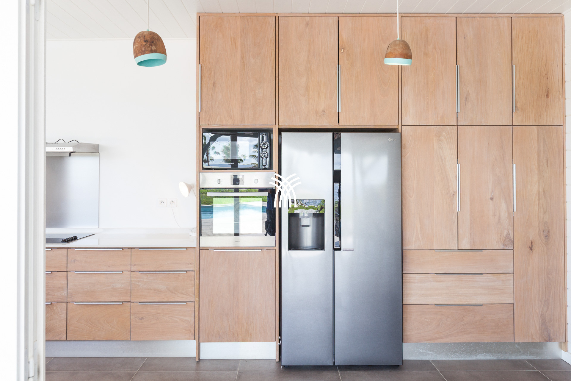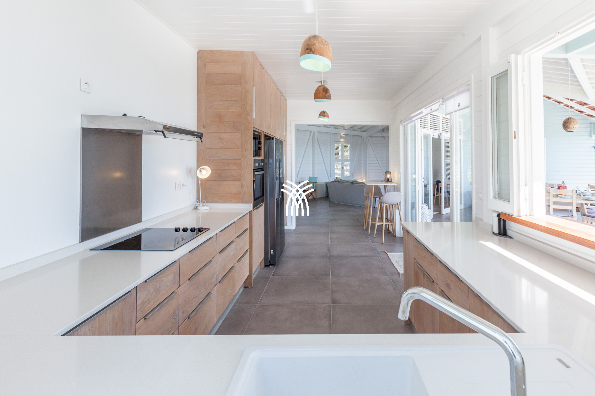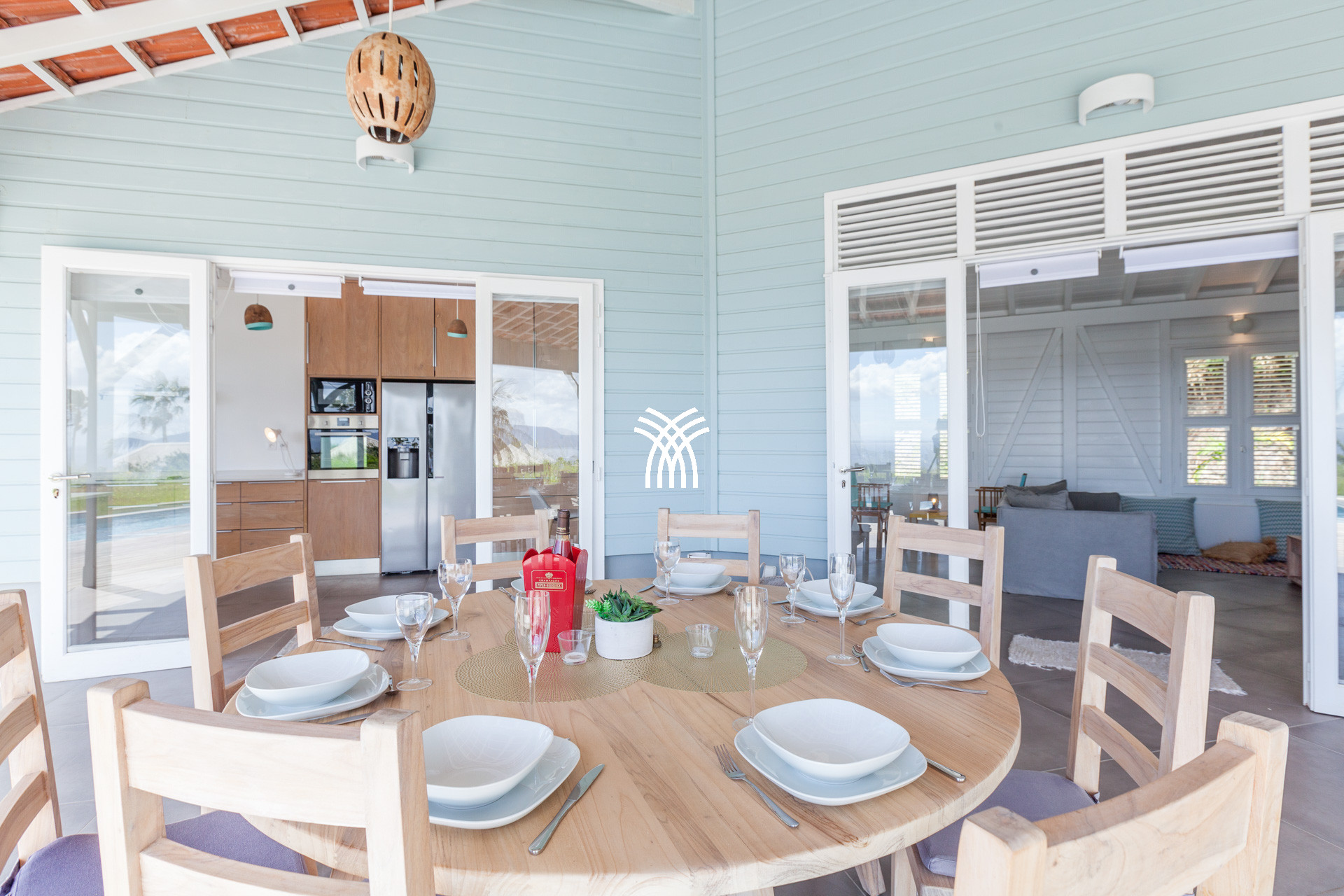 Le vaste séjour s’ouvre sur l’extérieur et s’harmonise naturellement avec la cuisine. Ensemble, ils forment un espace de vie convivial, baigné de lumière naturelle. Le salon propose un mobilier raffiné, avec canapé moelleux, table basse en teck, écran plat et coin bureau. La cuisine, quant à elle, est équipée de tout le nécessaire pour cuisiner face à la mer. La salle à manger extérieure, située sur la terrasse, permet de profiter pleinement du climat tropical lors de vos repas en plein air.