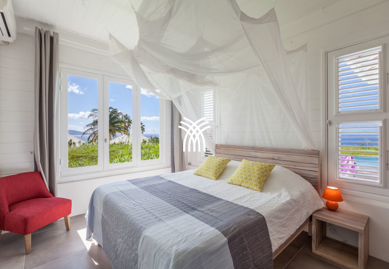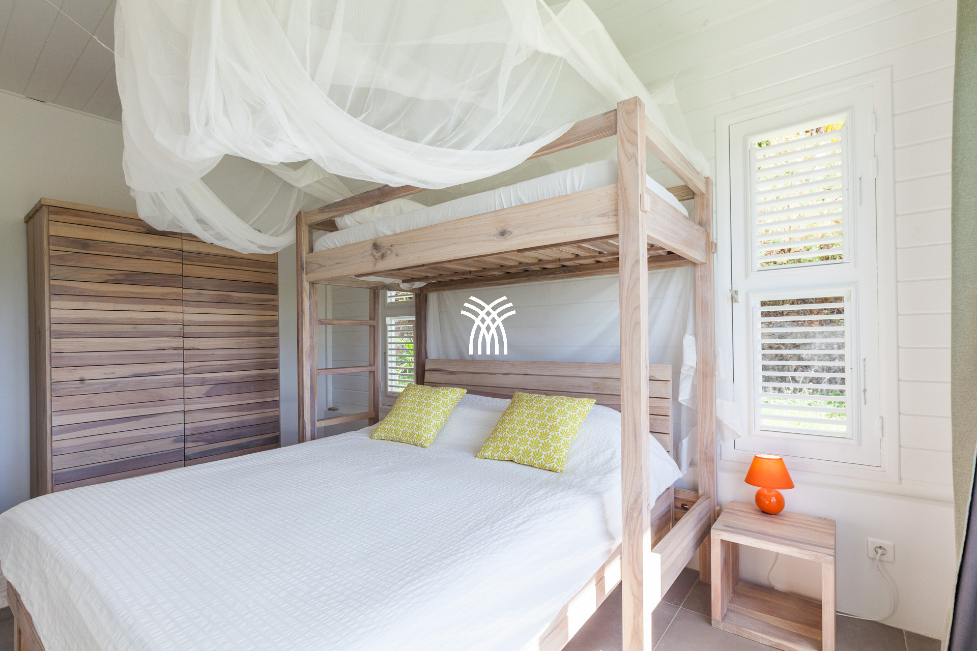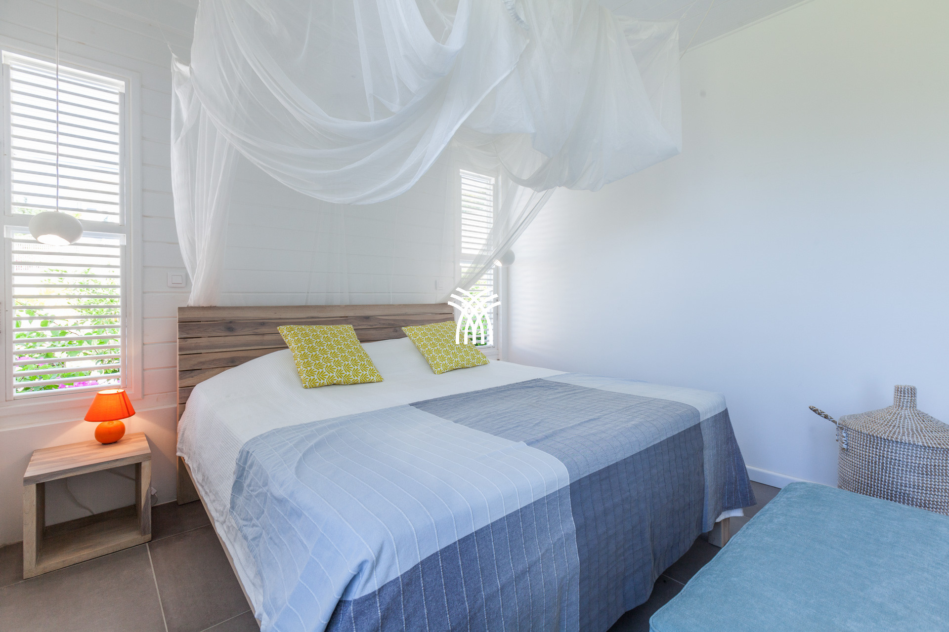 Cette villa à louer en Martinique comprend trois chambres climatisées, toutes orientées vers la mer pour une vue apaisante à chaque réveil. La chambre principale, décorée dans des tons de blanc et de bleu, dispose d’un lit king-size, d’un dressing et d’une salle d’eau avec douche à l’italienne. La deuxième chambre mêle blanc et rouge et propose un lit queen-size. La troisième chambre, aux nuances de blanc et de jaune, peut accueillir jusqu’à trois personnes grâce à un lit queen-size et un lit simple en mezzanine. Ces deux dernières chambres partagent une salle de douche moderne avec WC.