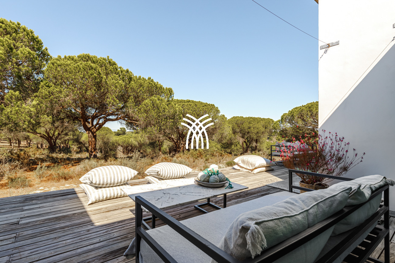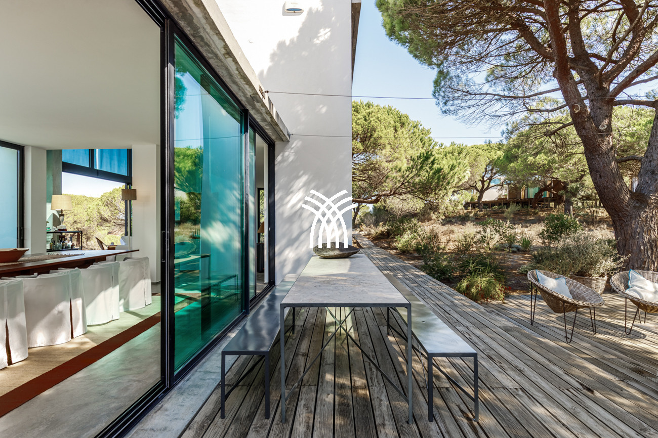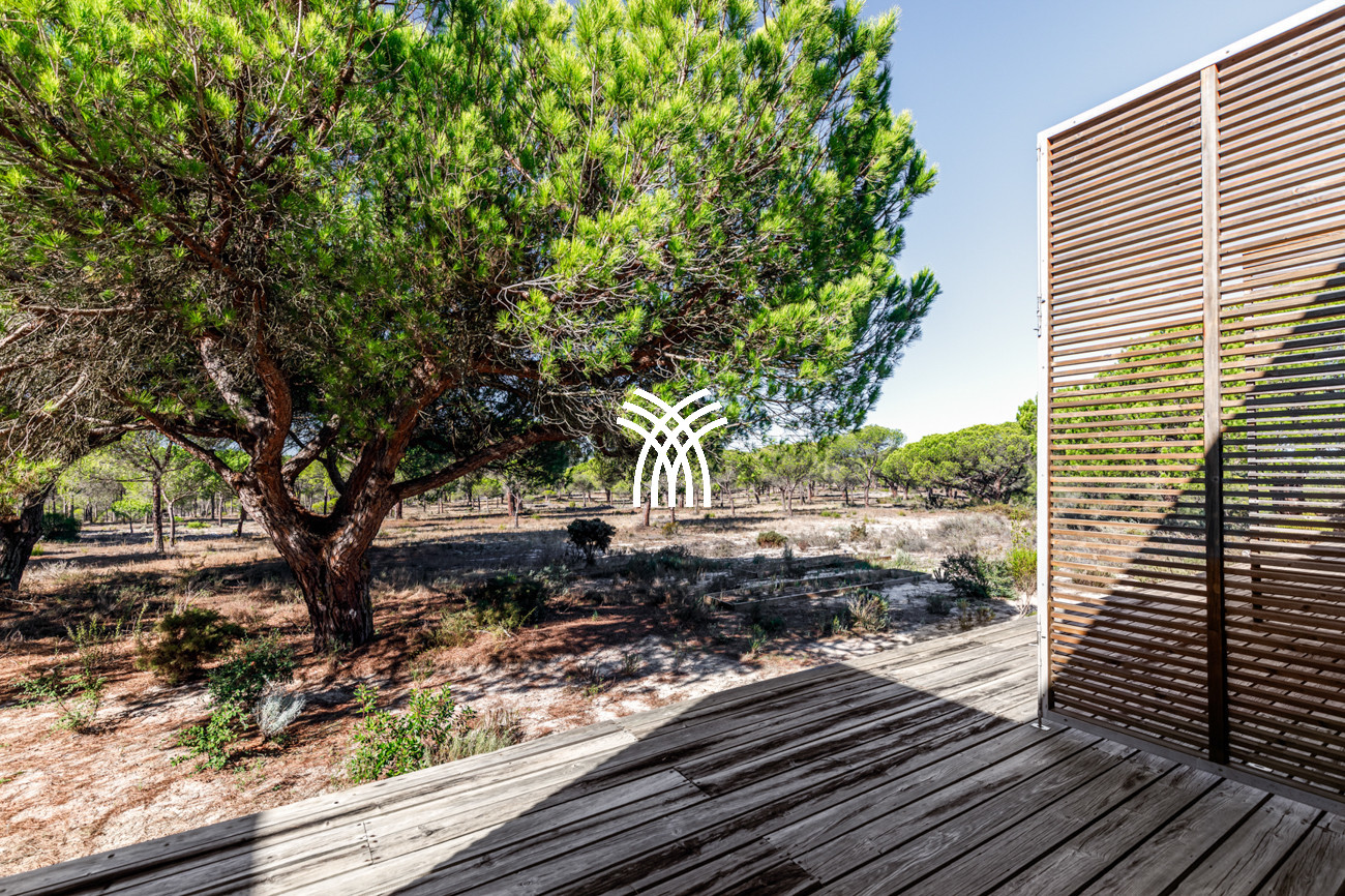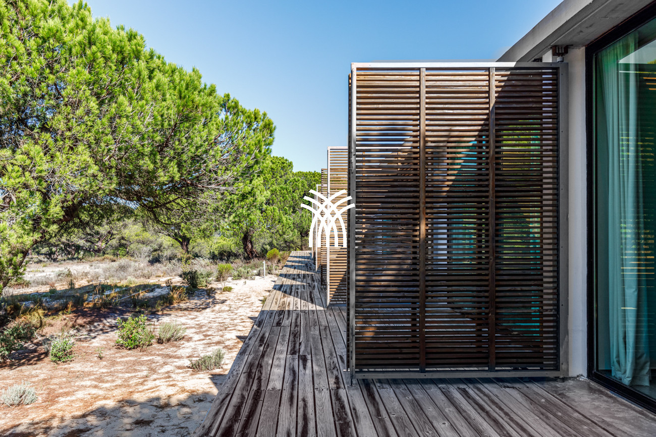 Au cœur de la maison, l'espace de vie ouvert réunit le salon, l'espace repas et la cuisine entièrement équipée dans une composition fluide conçue pour des moments partagés et une élégance décontractée. Cet espace s'étend naturellement sur une terrasse généreuse de 90 mètres carrés, partiellement ombragée pour des repas en plein air, qui mène à la piscine accueillante et à un jardin de sable distinctif de 500 mètres carrés. Ensemble, ils forment un environnement intérieur-extérieur idyllique où les journées se déroulent à un rythme tranquille sous le soleil de Comporta.