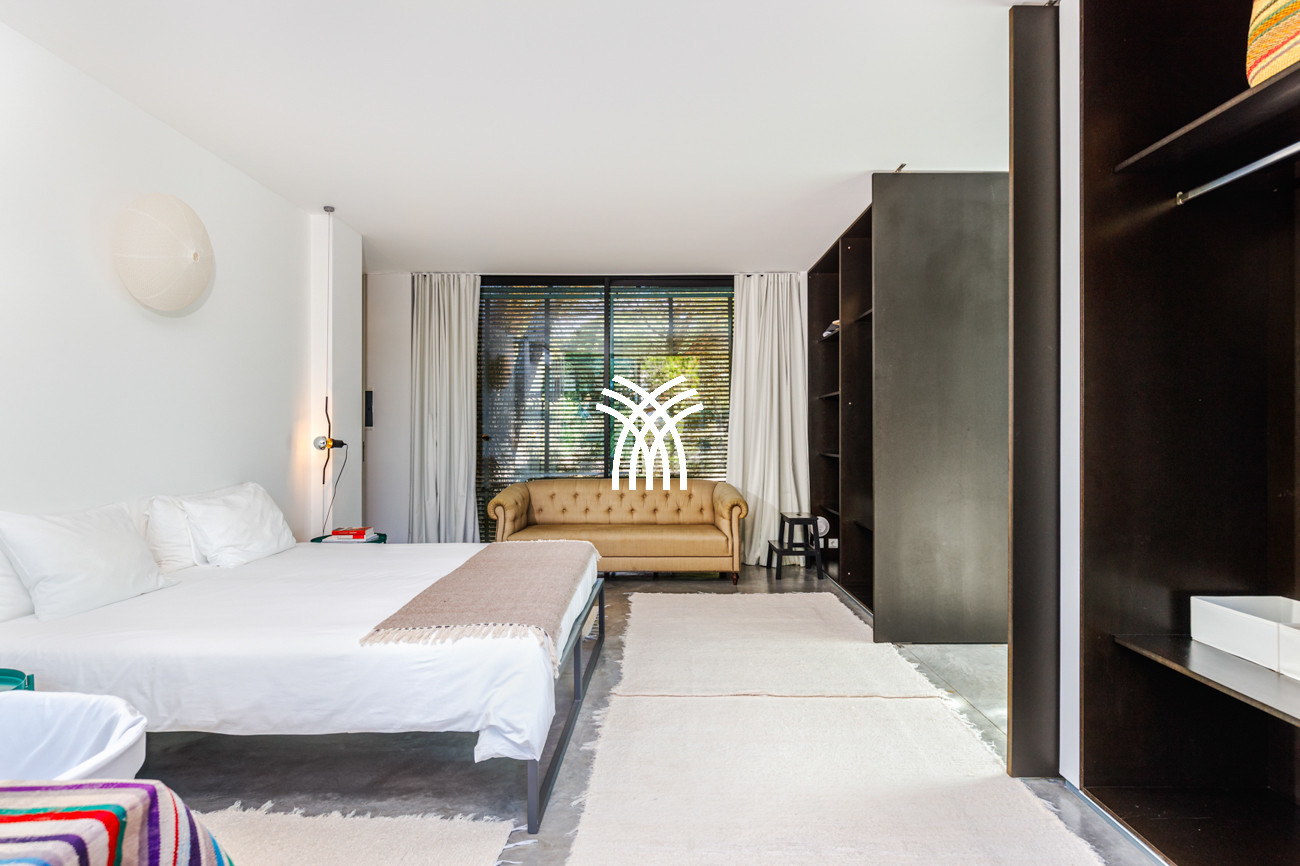 À l'intérieur, la villa révèle des intérieurs lumineux façonnés par des fenêtres généreuses qui baignent les murs et les plafonds blancs et nets de lumière naturelle. Des touches subtiles de couleur introduites par des œuvres d'art, des textiles et des détails décoratifs enrichissent la palette minimaliste, tandis que les éléments en bois blanc et les parquets naturels ajoutent de la chaleur et de la texture, aboutissant à une esthétique sophistiquée mais accueillante. Cette conception harmonieuse s'étend aux chambres, où des finitions en bois blanc serein sont rehaussées par des rideaux aux couleurs riches et des pièces artistiques soigneusement choisies, offrant une atmosphère d'élégance calme et de confort sans effort.