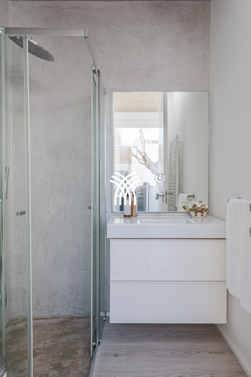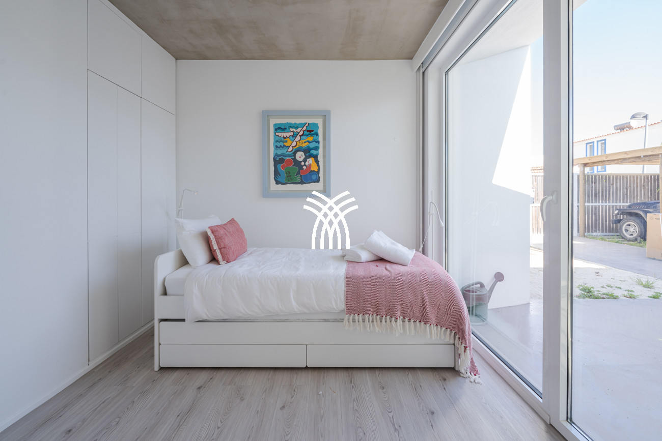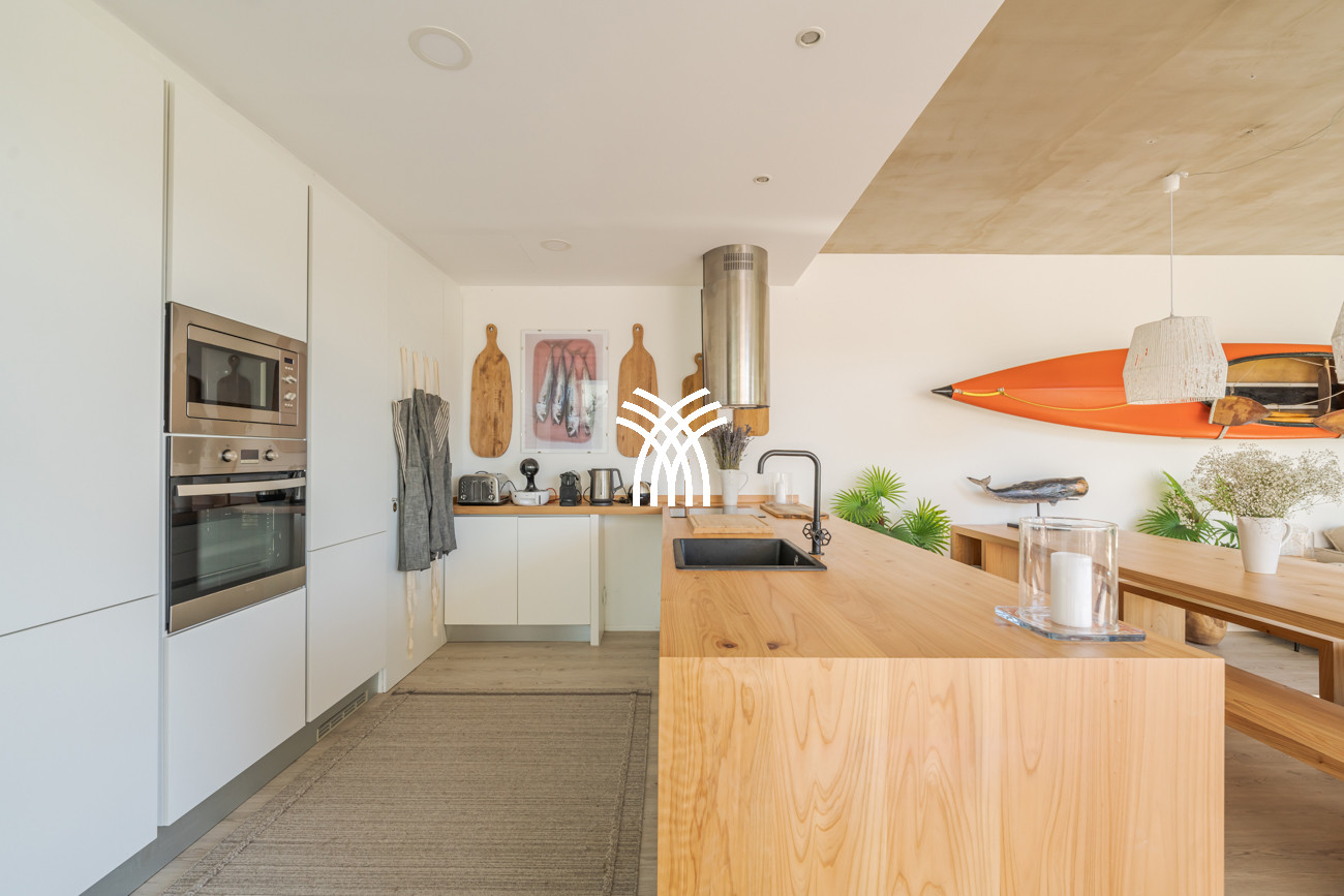 Matins pieds nus se déploient sur des sols en béton frais, tandis que des touches subtiles de couleurs vives introduisent chaleur et expression artistique dans les intérieurs. L'espace de vie et de salle à manger spacieux se fond sans effort dans une cuisine ouverte entièrement équipée, formant un espace central conçu pour la connexion, la détente et les moments partagés. Depuis le salon, des vues ininterrompues s'étendent à travers le jardin et la piscine vers la pinède au-delà, immersant les invités dans le rythme tranquille de l'environnement naturel de Comporta.