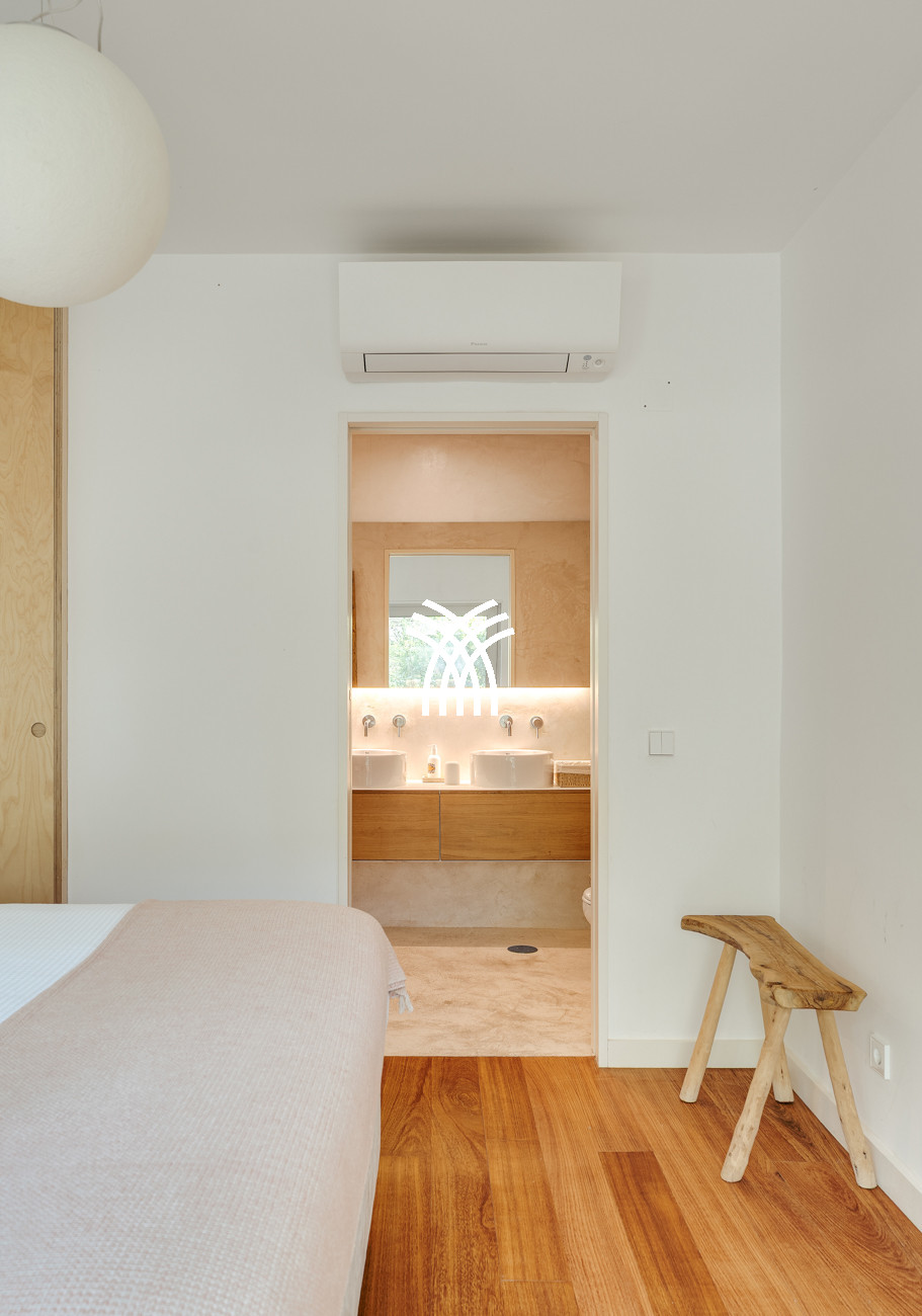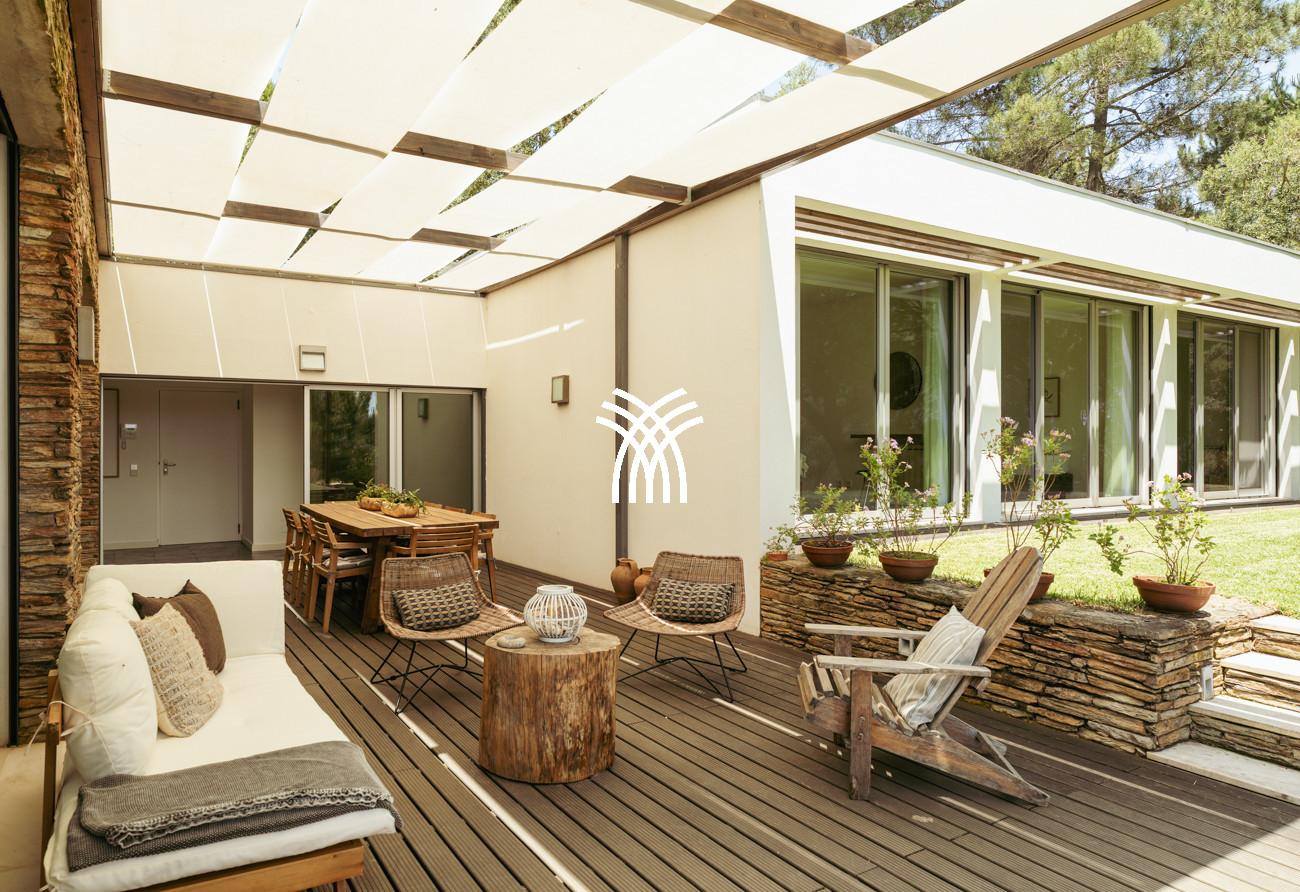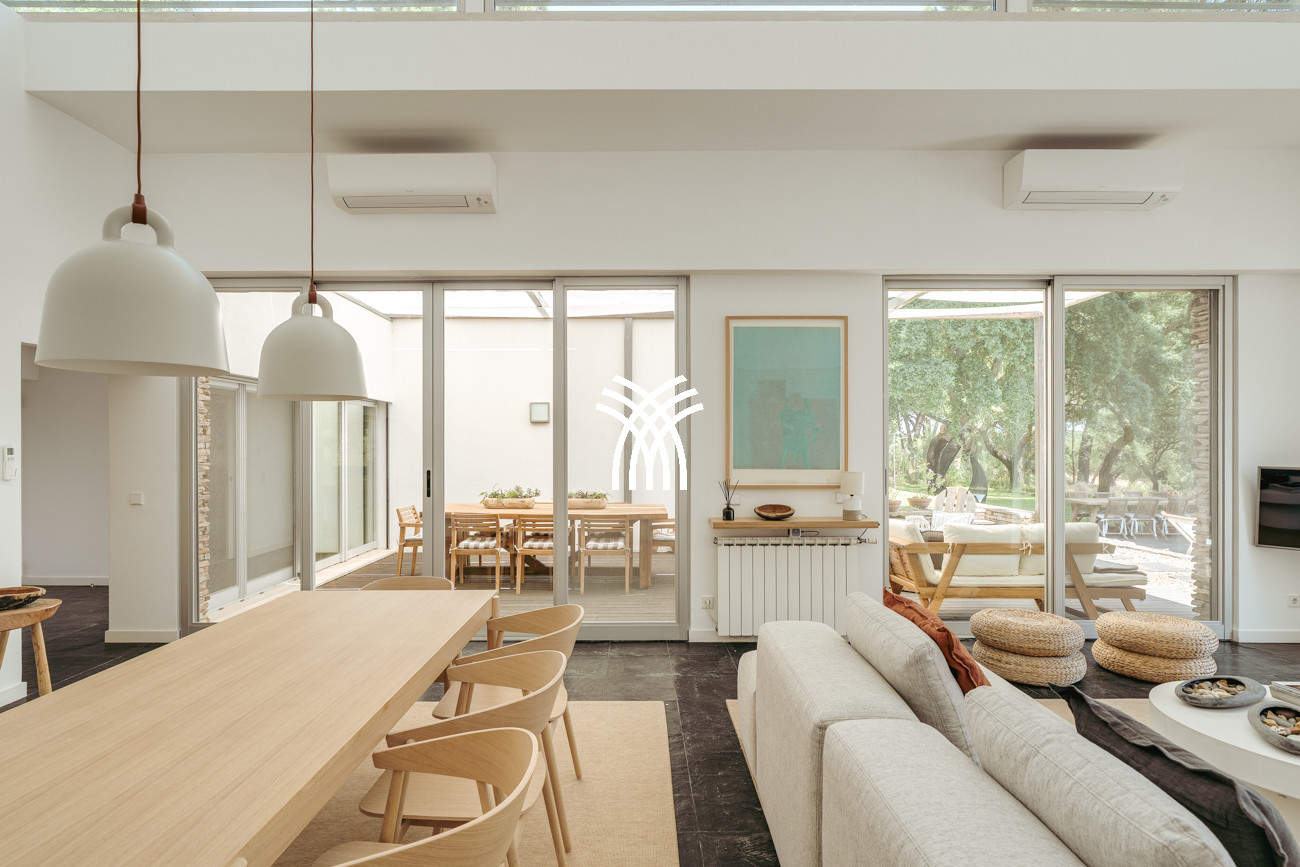 Au cœur de la maison, l'espace de vie ouvert réunit le salon, l'espace repas et la cuisine entièrement équipée dans une composition fluide conçue pour des moments partagés et une élégance décontractée. Cet espace s'étend naturellement sur une terrasse généreuse de 90 mètres carrés, partiellement ombragée pour des repas en plein air, qui mène à la piscine accueillante et à un jardin de sable distinctif de 500 mètres carrés. Ensemble, ils forment un environnement intérieur-extérieur idyllique où les journées se déroulent à un rythme tranquille sous le soleil de Comporta.