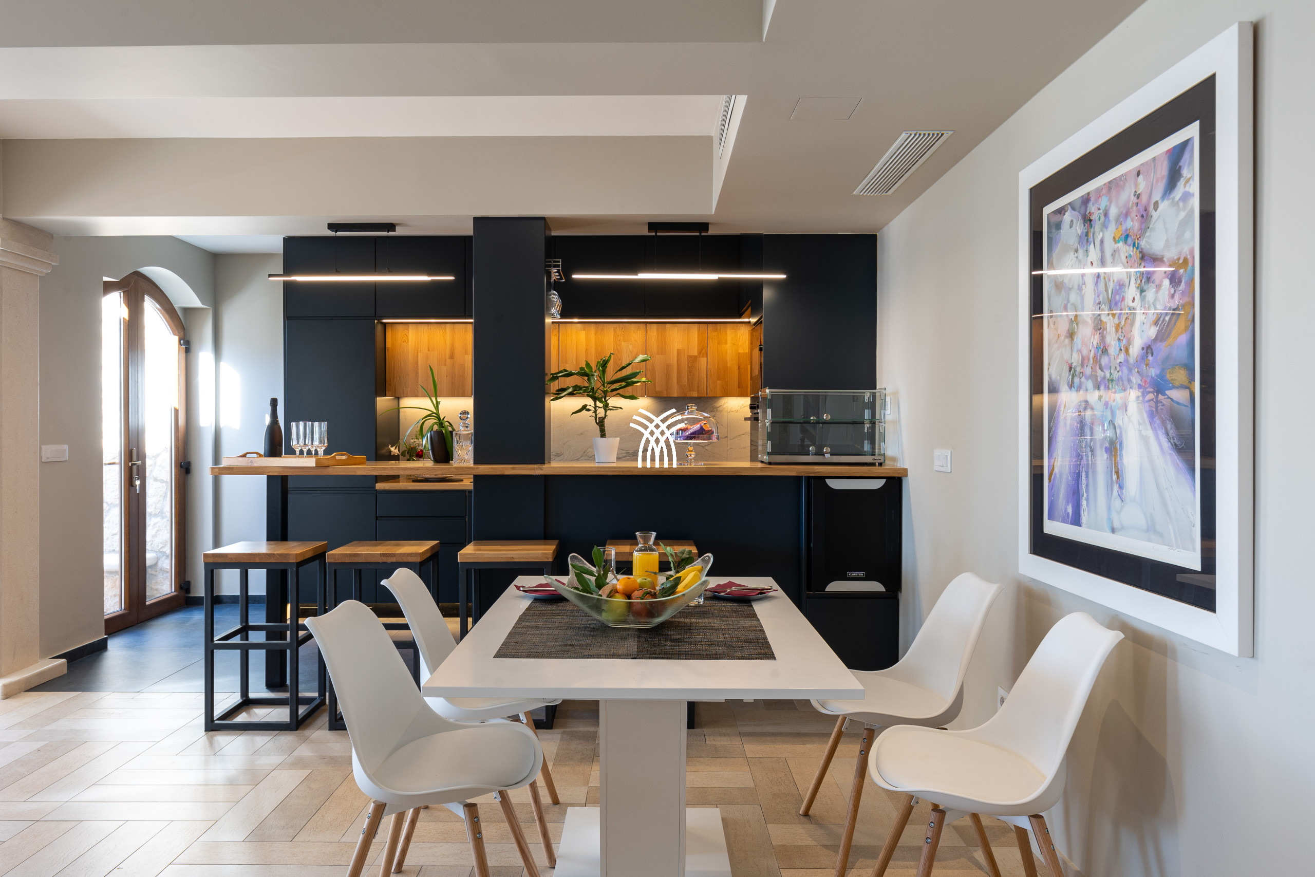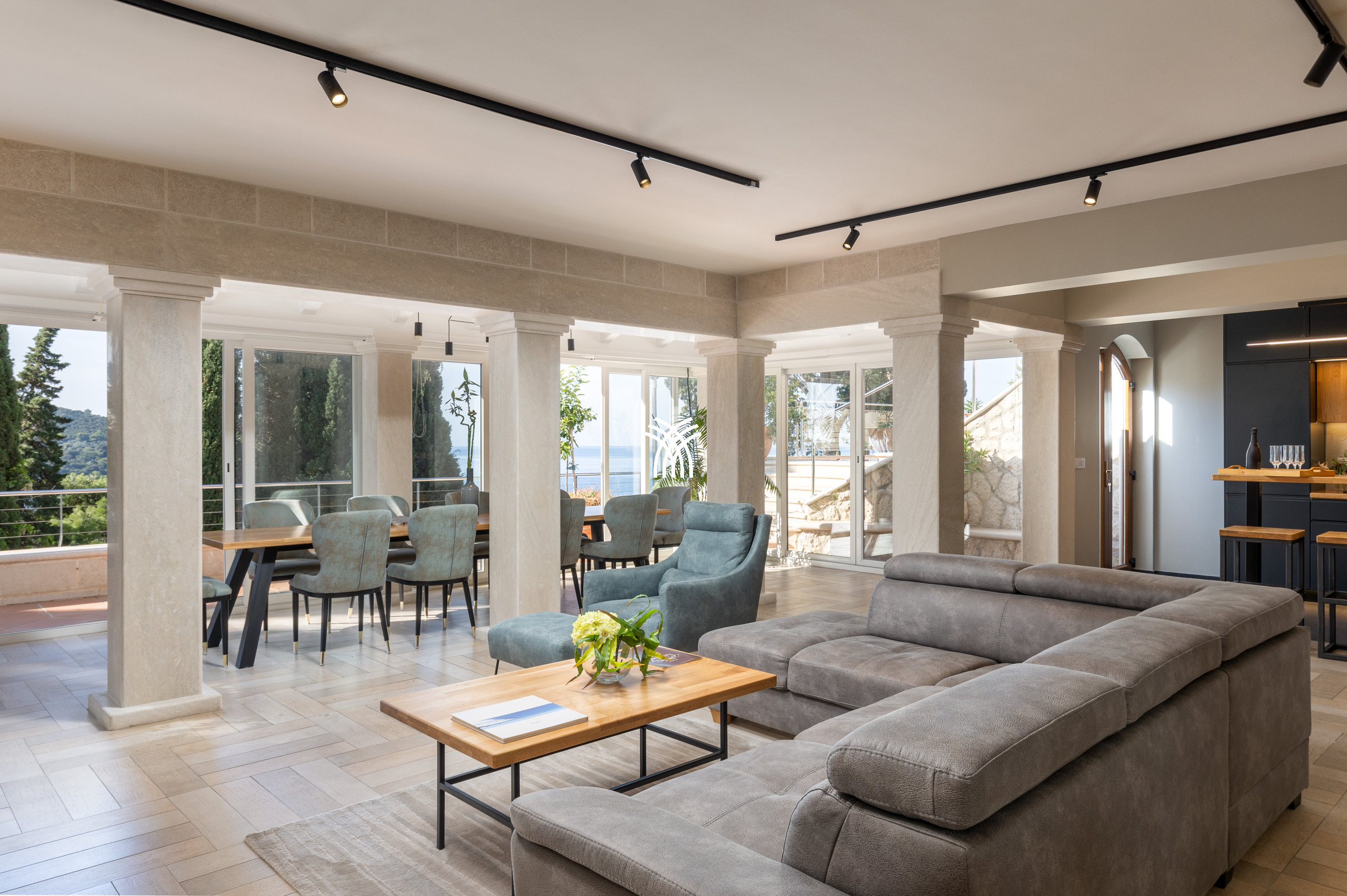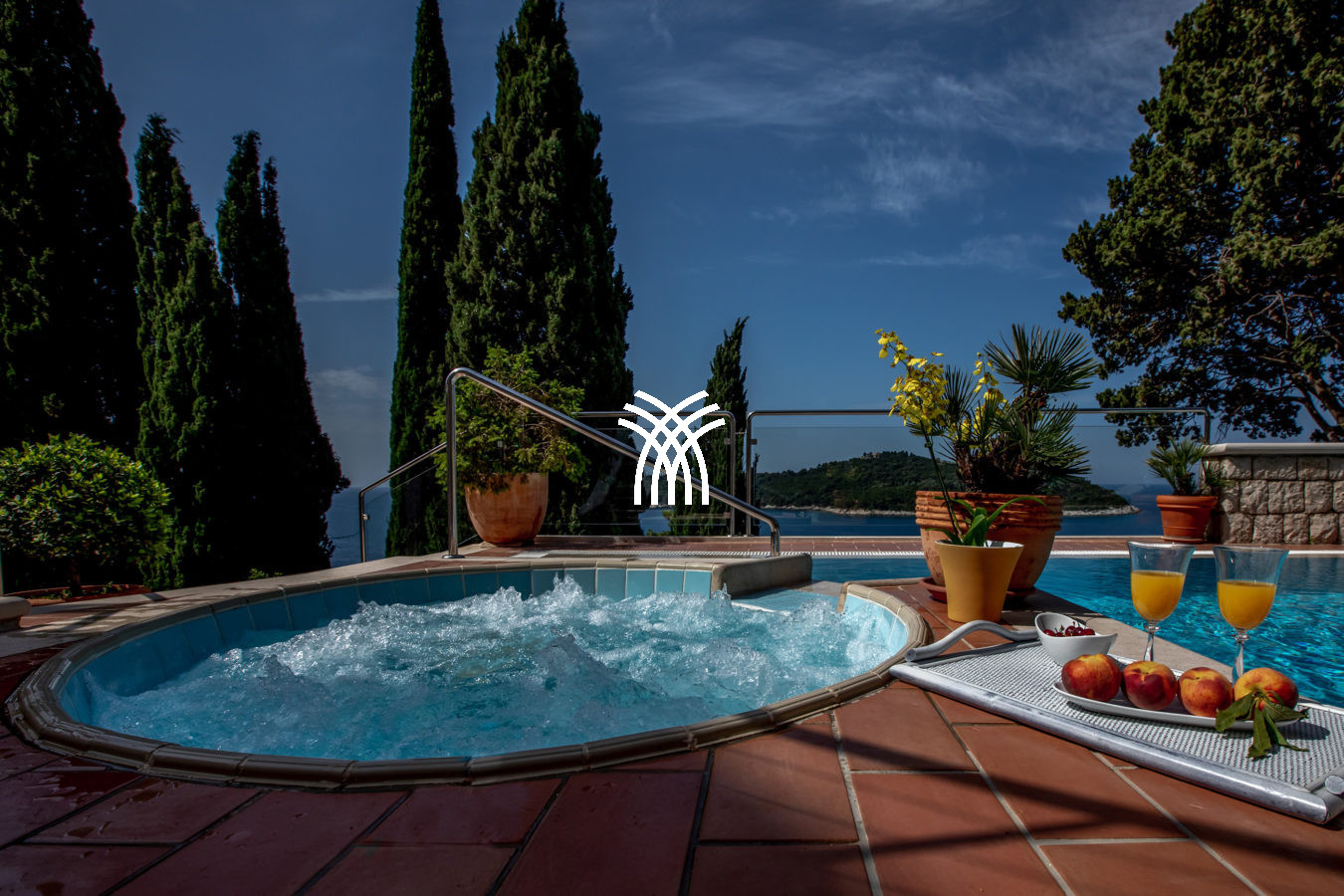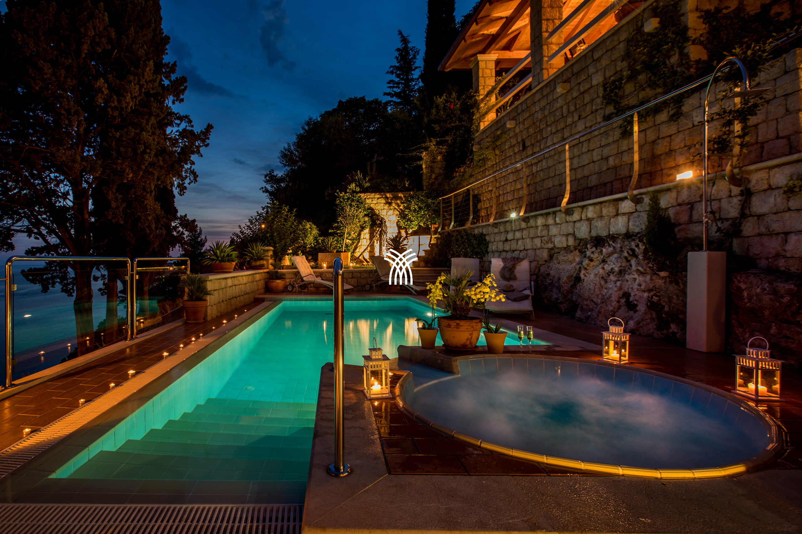 À l’extérieur, la propriété dévoile un jardin en restanques planté de cyprès, d’essences méditerranéennes et de plantes odorantes qui s’étirent jusqu’aux terrasses panoramiques. Le cœur du domaine est une piscine élégante bordée d’un jacuzzi et entourée d’espaces de détente offrant un cadre spectaculaire à toute heure de la journée. Plus bas, un espace authentique en pierre, transformé en petite taverne privée, peut accueillir des ateliers culinaires ou des dîners signatures orchestrés par le chef. La Villa Luxia devient alors un théâtre privilégié pour découvrir la richesse des saveurs dalmates.